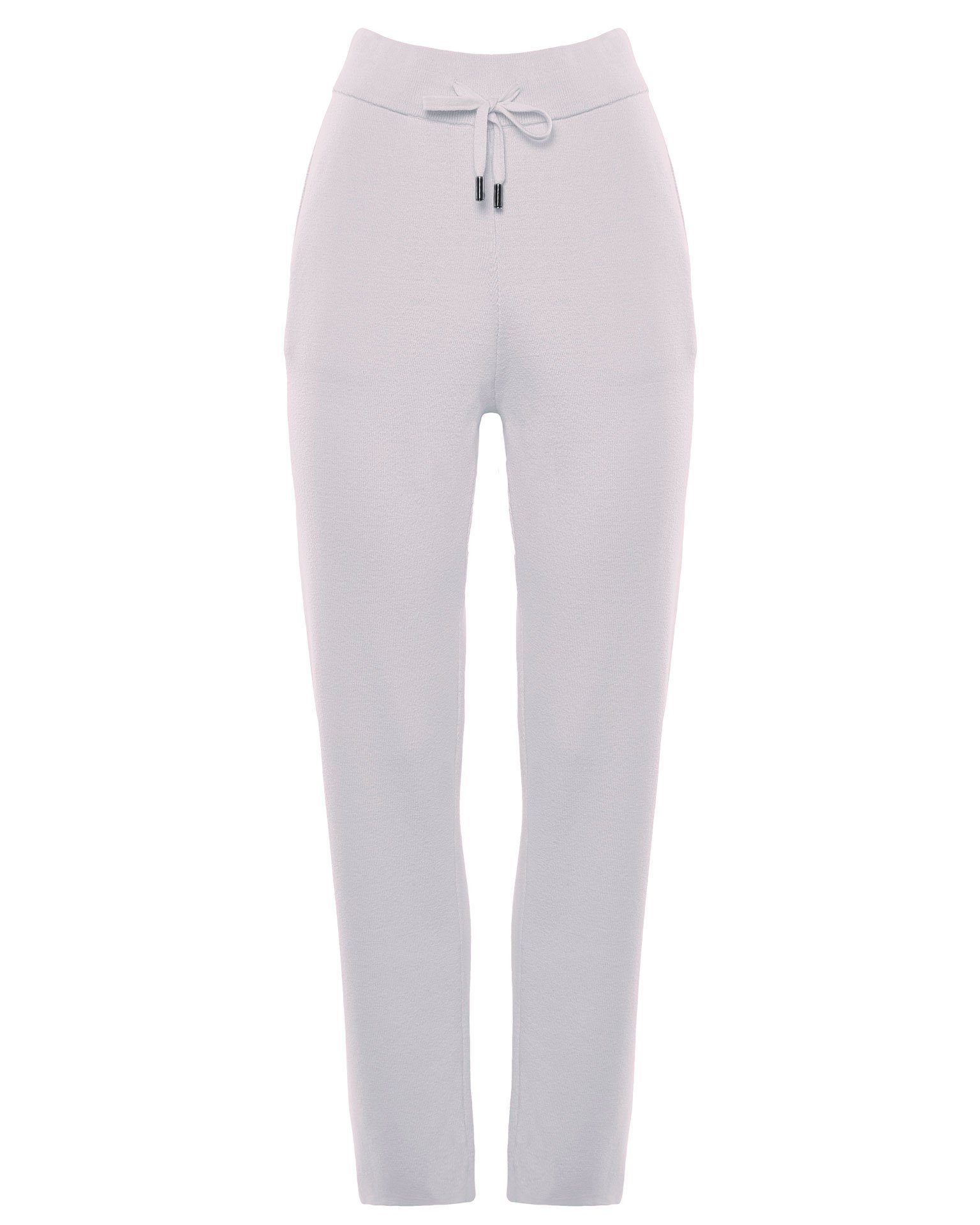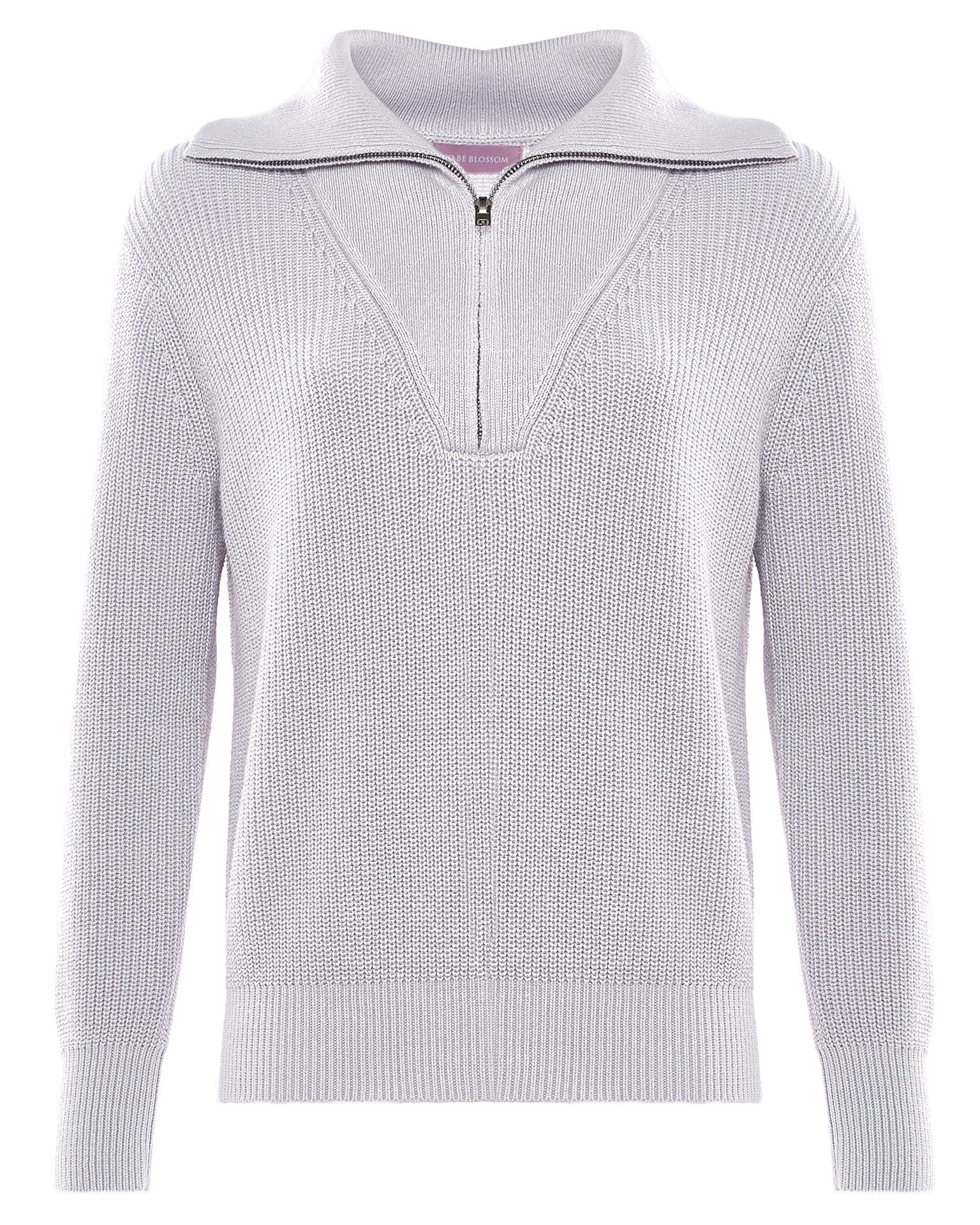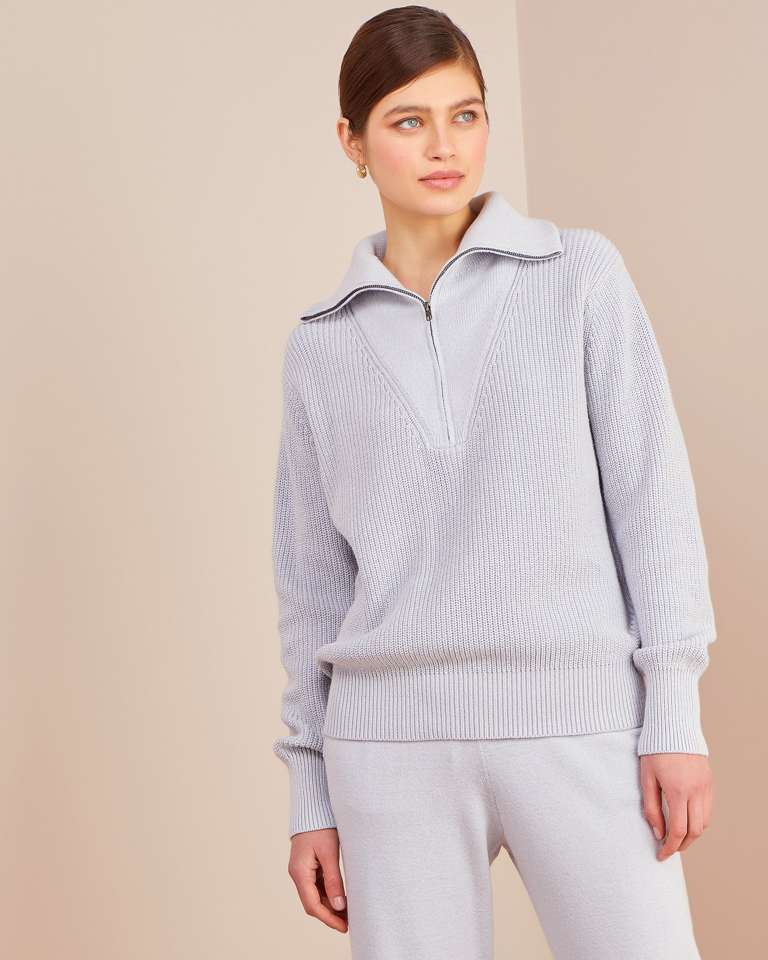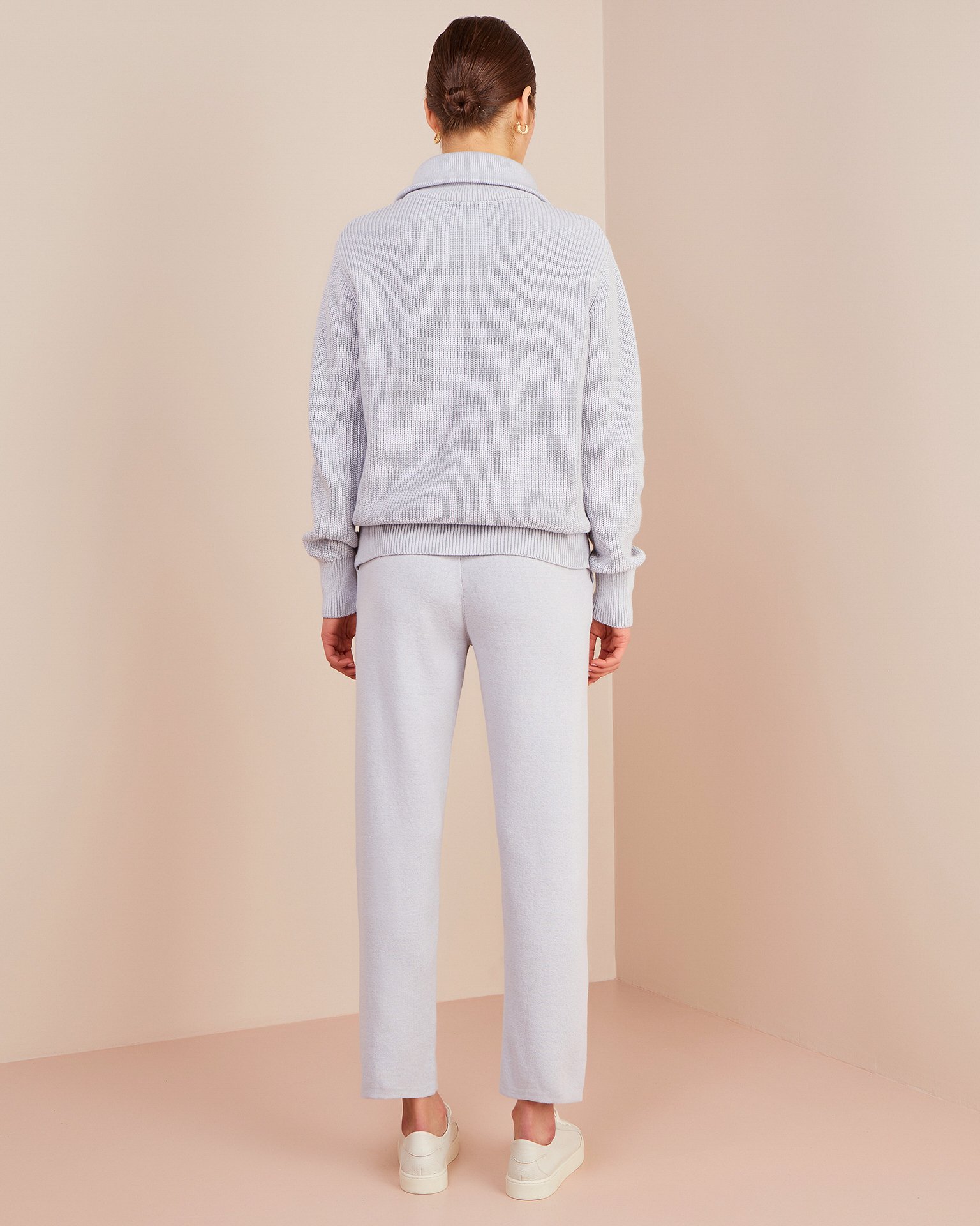 A knitted set made from a blend of cotton and cashmere. A jumper with a set-in high neck with a zip fastening, finished with ribbed trim. Straight-leg trousers, ankle-length. The grey-blue yarn gives the look a fresh and pleasing aesthetic. Complete the set with minimalist jewellery and wear it under a coat or a quilted puffer jacket with trainers for total cosiness. Composition: 90% cotton, 10% cashmere Model's measurements: height 176 cm, bust 80 cm, waist 59 cm, hips 89 cm