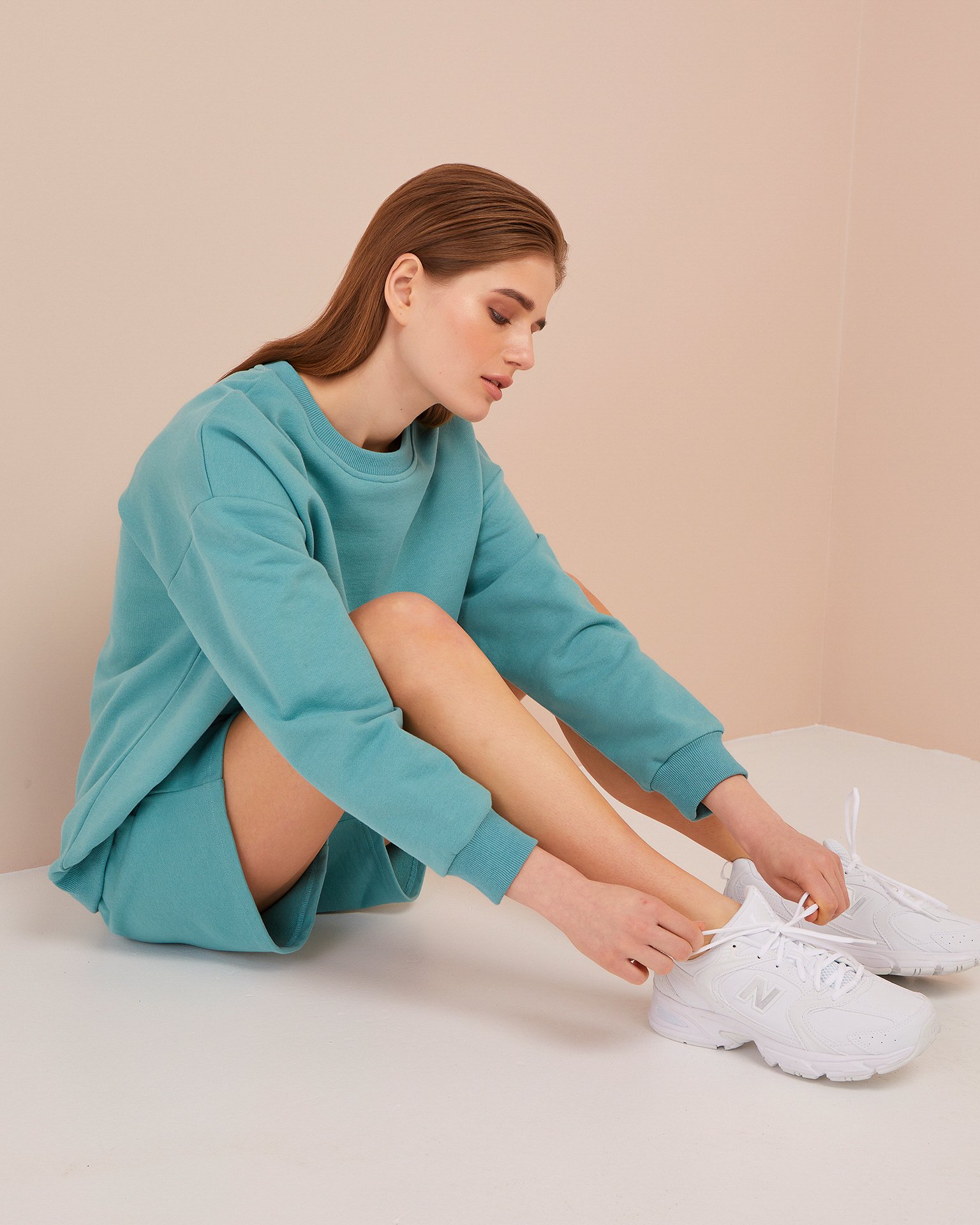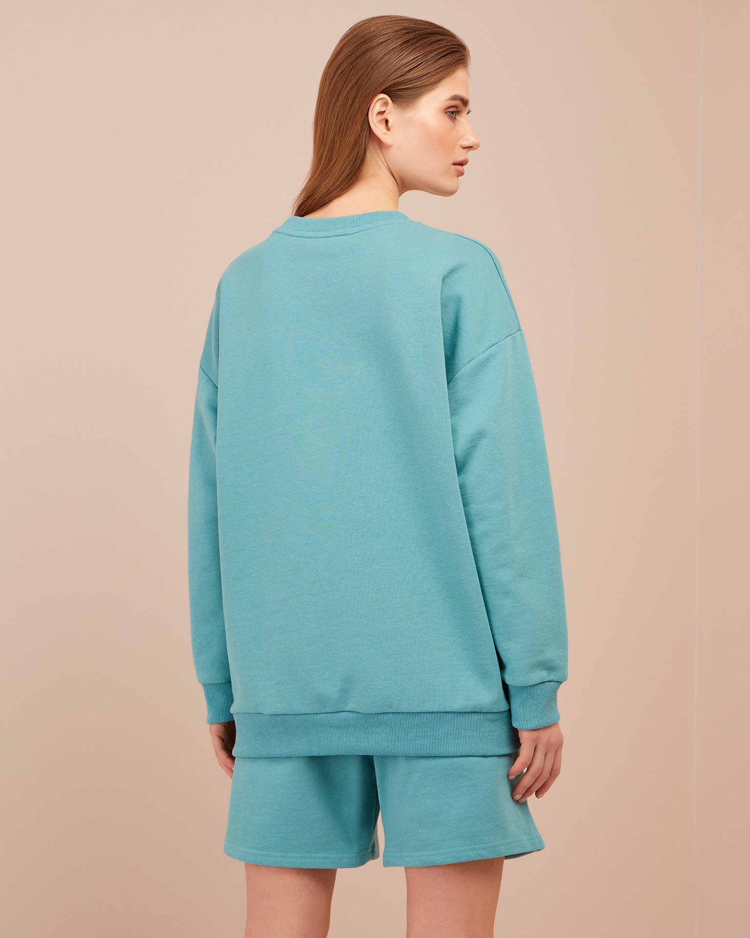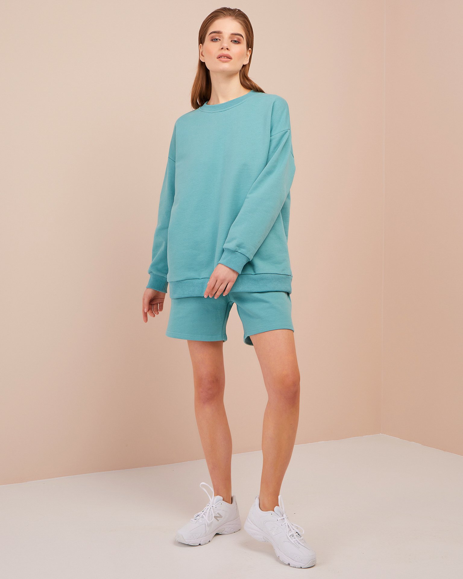 An oversized jumper with long sleeves and a dropped shoulder line. Cuffs, hem, and round neckline are finished with ribbing. Wide bermuda shorts reaching mid-thigh, with an elasticated waist. The trendy set can be paired with chunky trainers, Dr. Martens-style boots, or lightweight white plimsolls. Both pieces can be worn separately. The shorts paired with a classic white t-shirt create the perfect casual summer look. The sweatshirt with jeans is a timeless, versatile outfit. Composition: 100% cotton Model's measurements: Height 173 cm, bust 86 cm, waist 59 cm, hips 90 cm