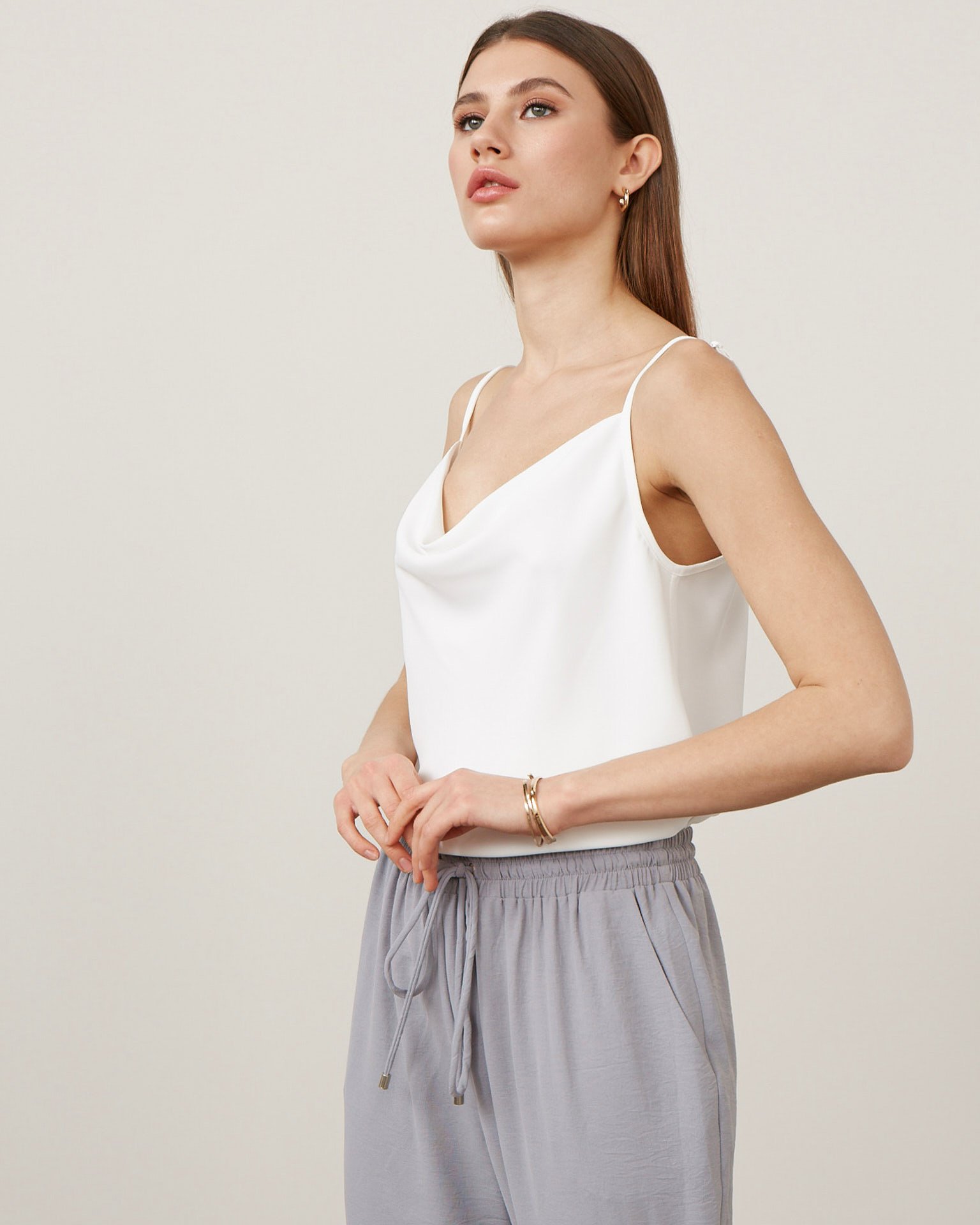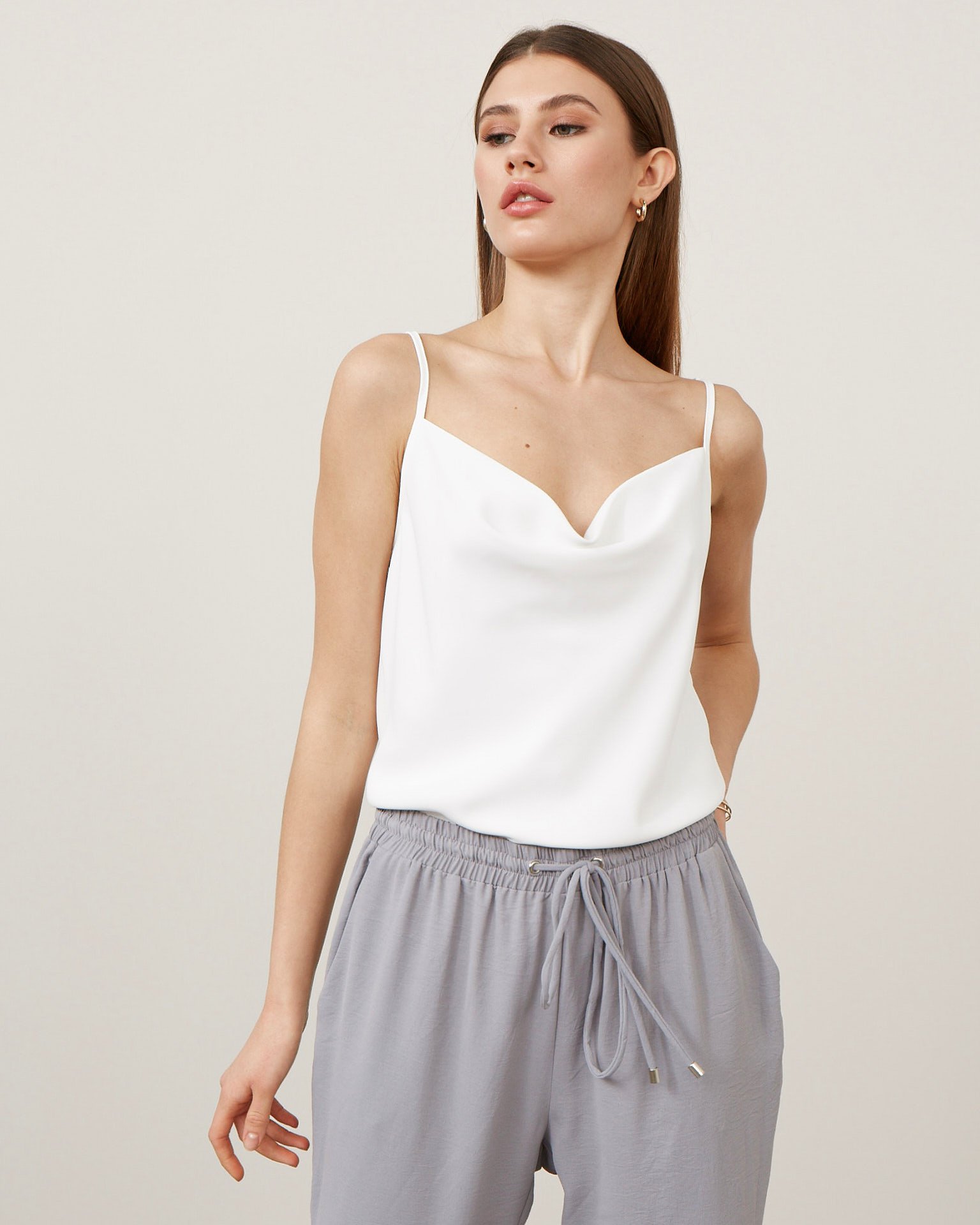 A satin top on thin straps – that essential base piece that makes it hard to imagine any modern woman's wardrobe. It inspires countless outfit ideas: wear it to work with a pencil skirt and blazer, layer it under a cosy sweater over one shoulder in cooler weather, or create layered looks by pairing it with a jumpsuit or a dress-jacket. Composition: 100% polyester Model's measurements: Height 172 cm, bust 80 cm, waist 59 cm, hips 89 cm