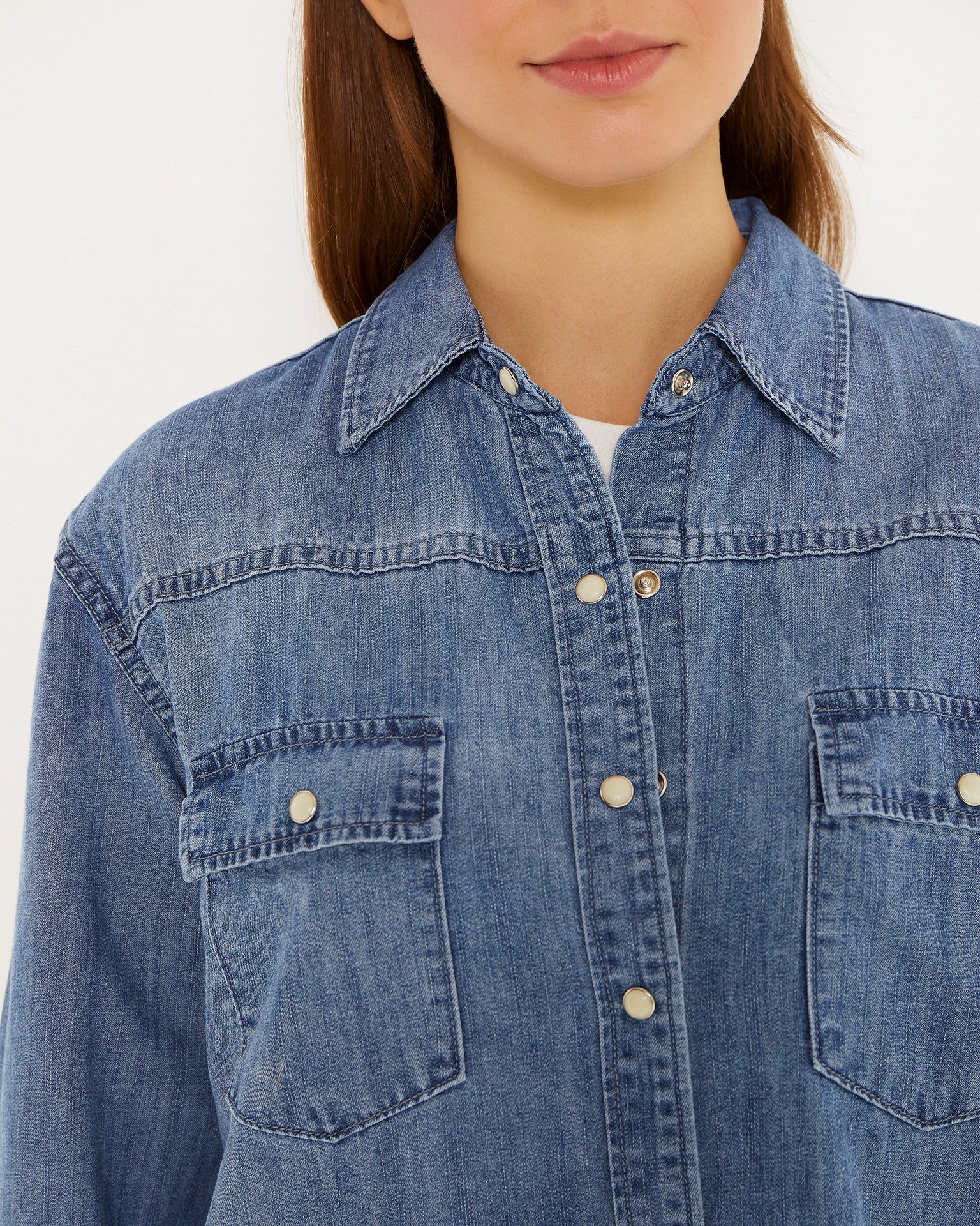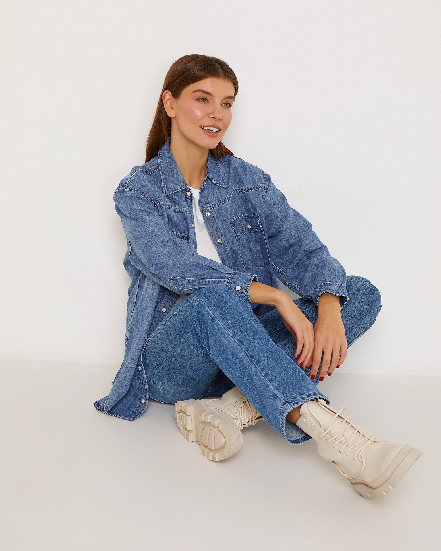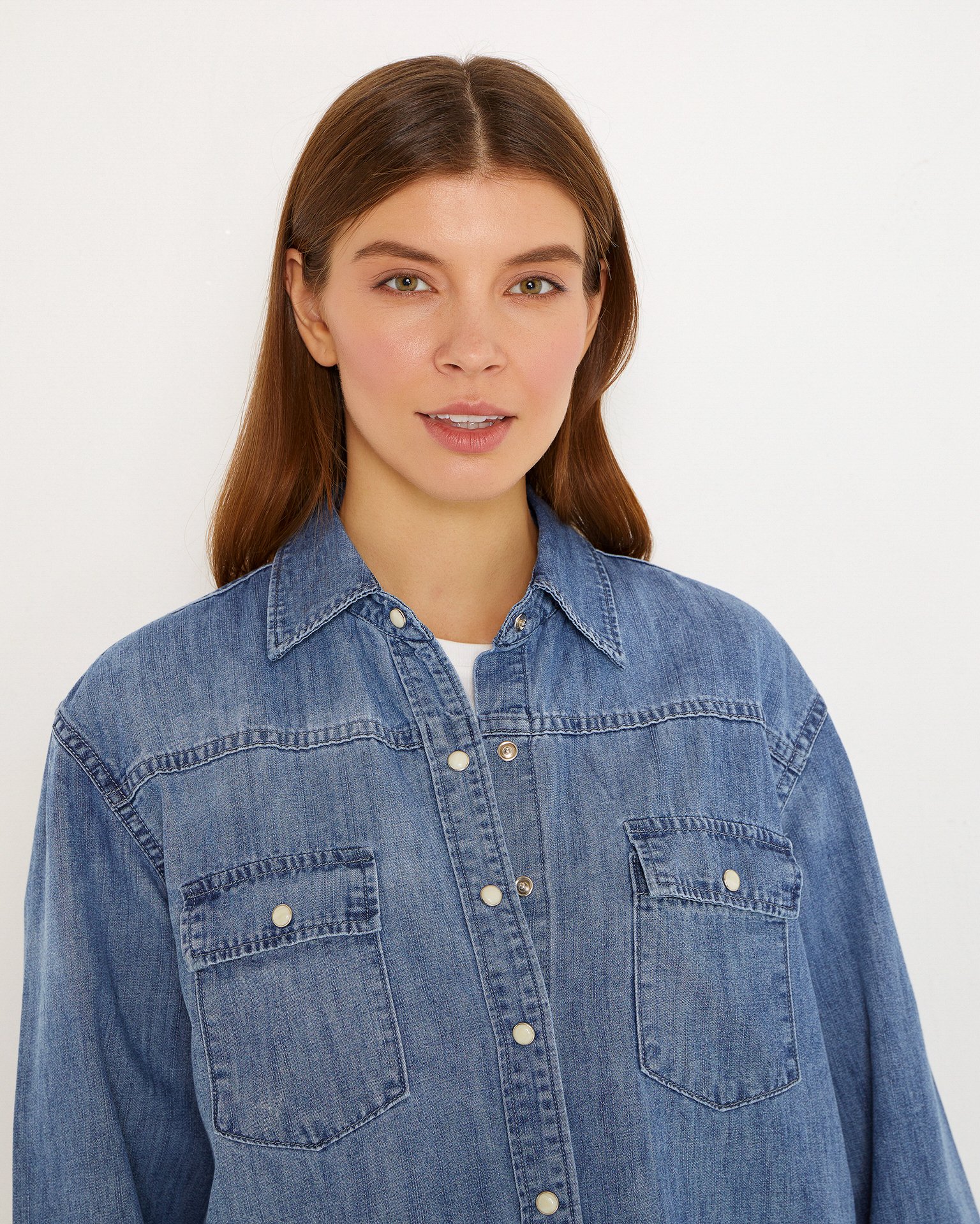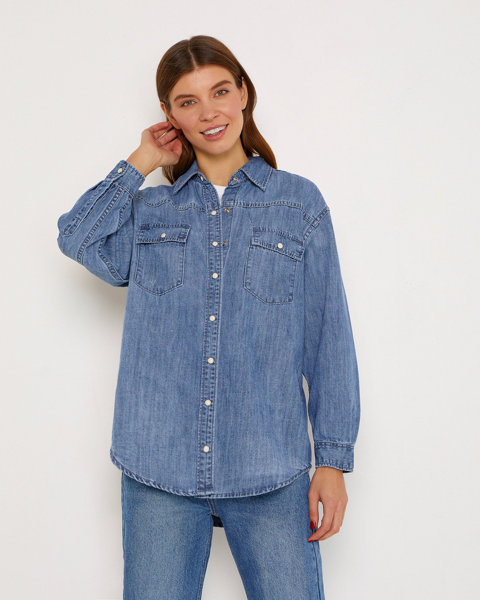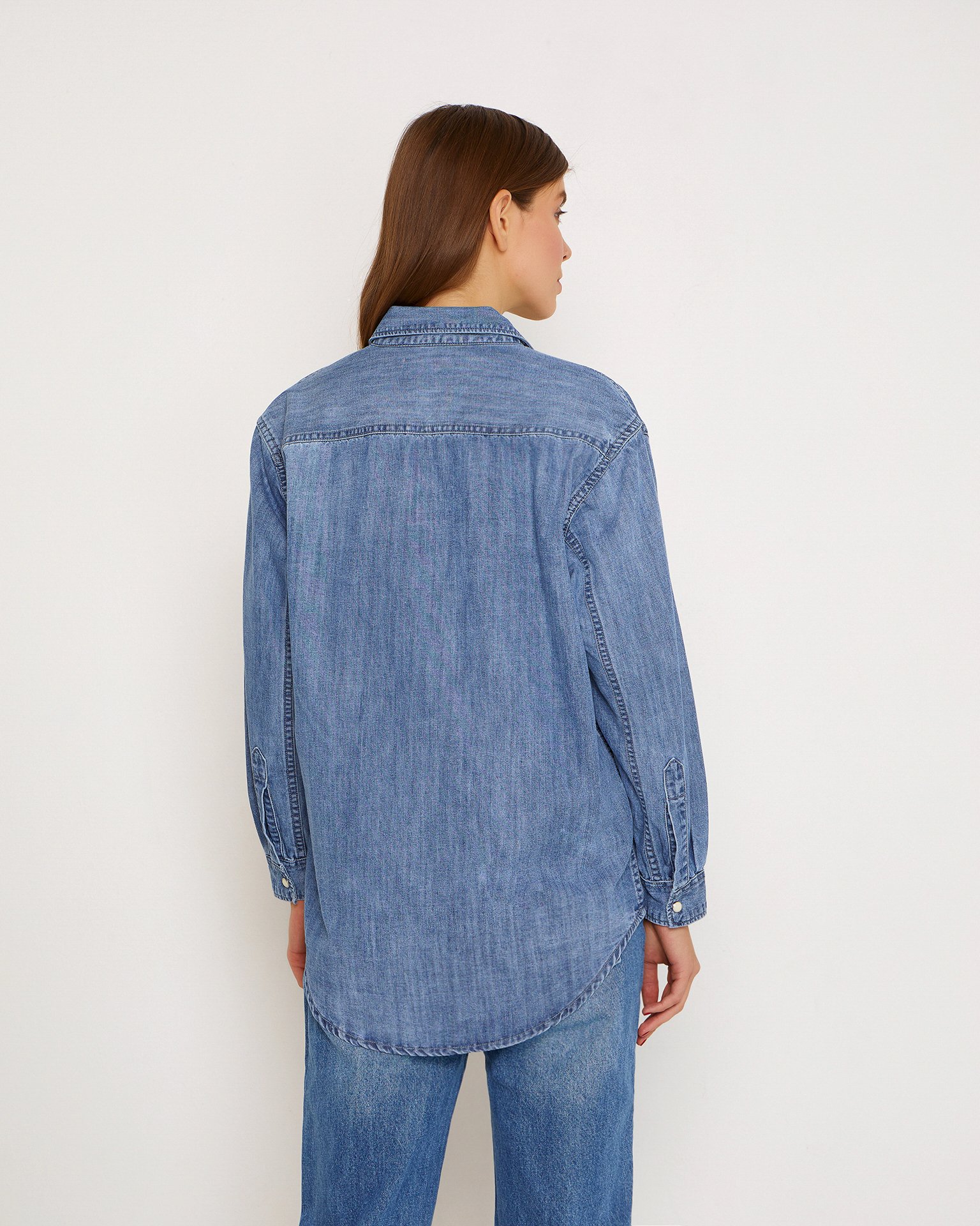 A relaxed-fit shirt made from 100% cotton. Features a collar, dropped shoulder line, two flap chest pockets, button-front placket, and a yoke back. This classic denim-coloured shirt can be worn open as a jacket or buttoned up with a turtleneck underneath for an ultra-trendy look. Composition: 100% cotton Model's measurements: Height 173 cm, bust 86 cm, waist 59 cm, hips 90 cm.