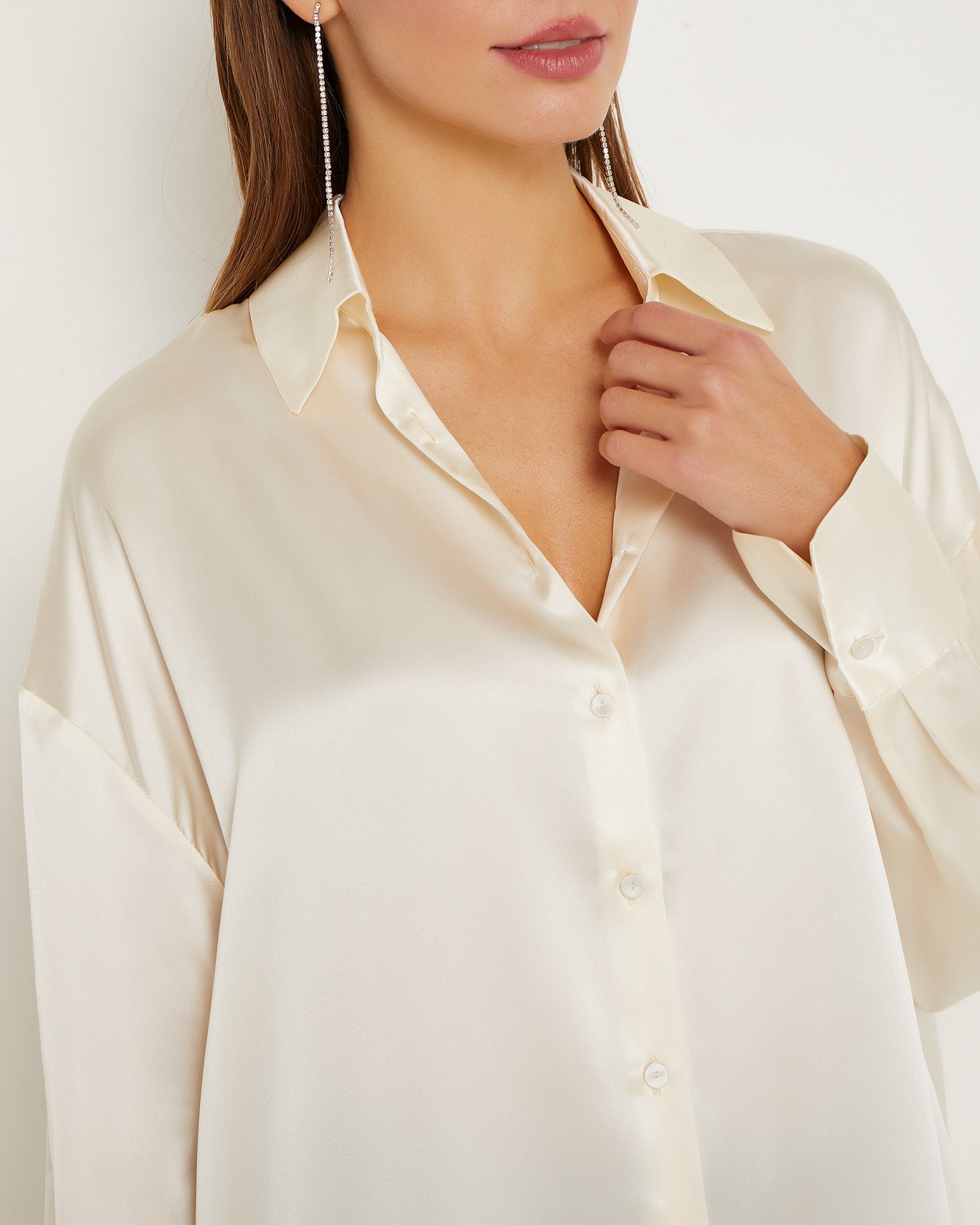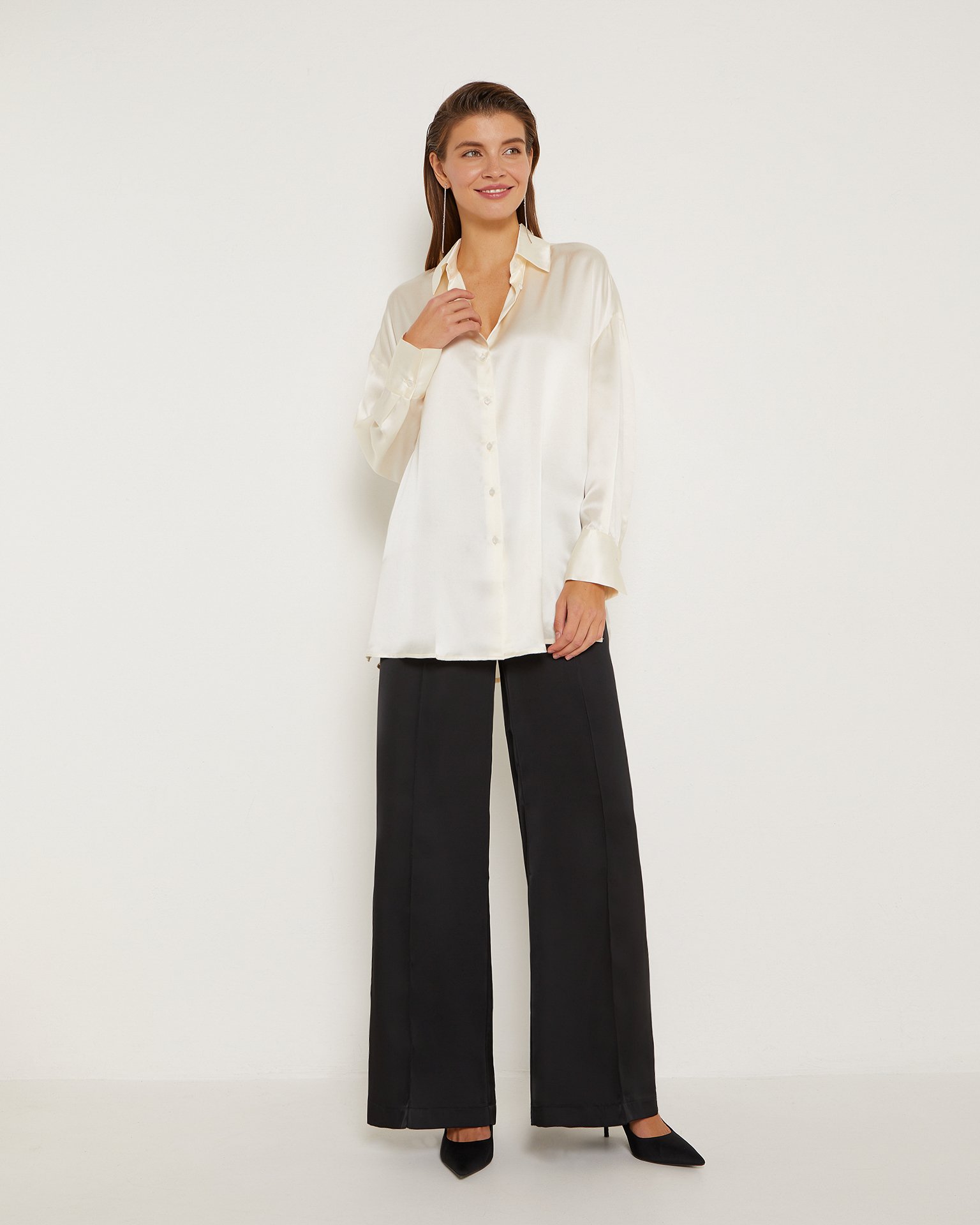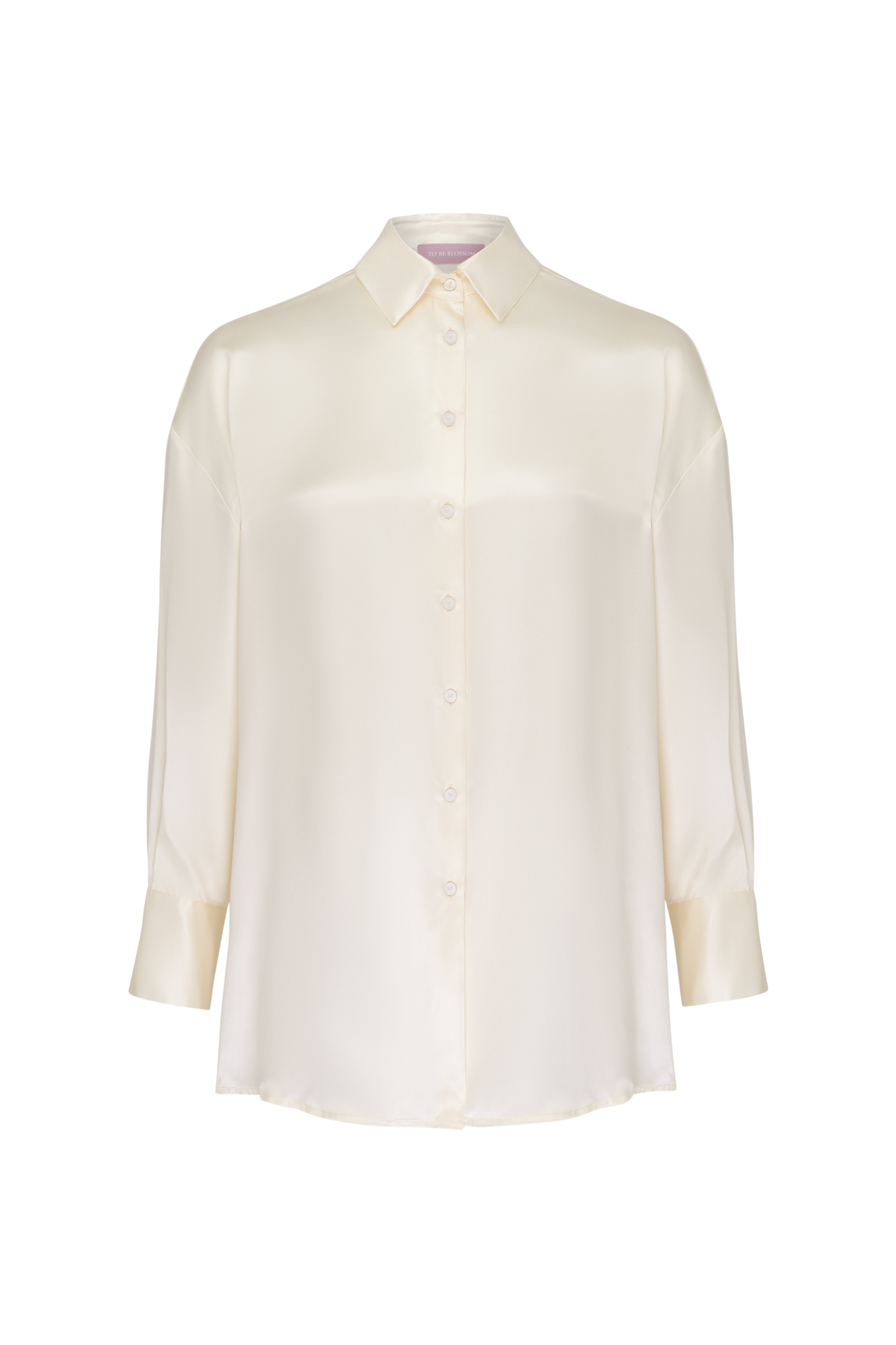 A solid-colour classic button-down shirt with long sleeves, slightly flaring towards the hem. A versatile and practical element for your wardrobe that can be paired with anything from tailored skirts to ripped jeans and strappy dresses.