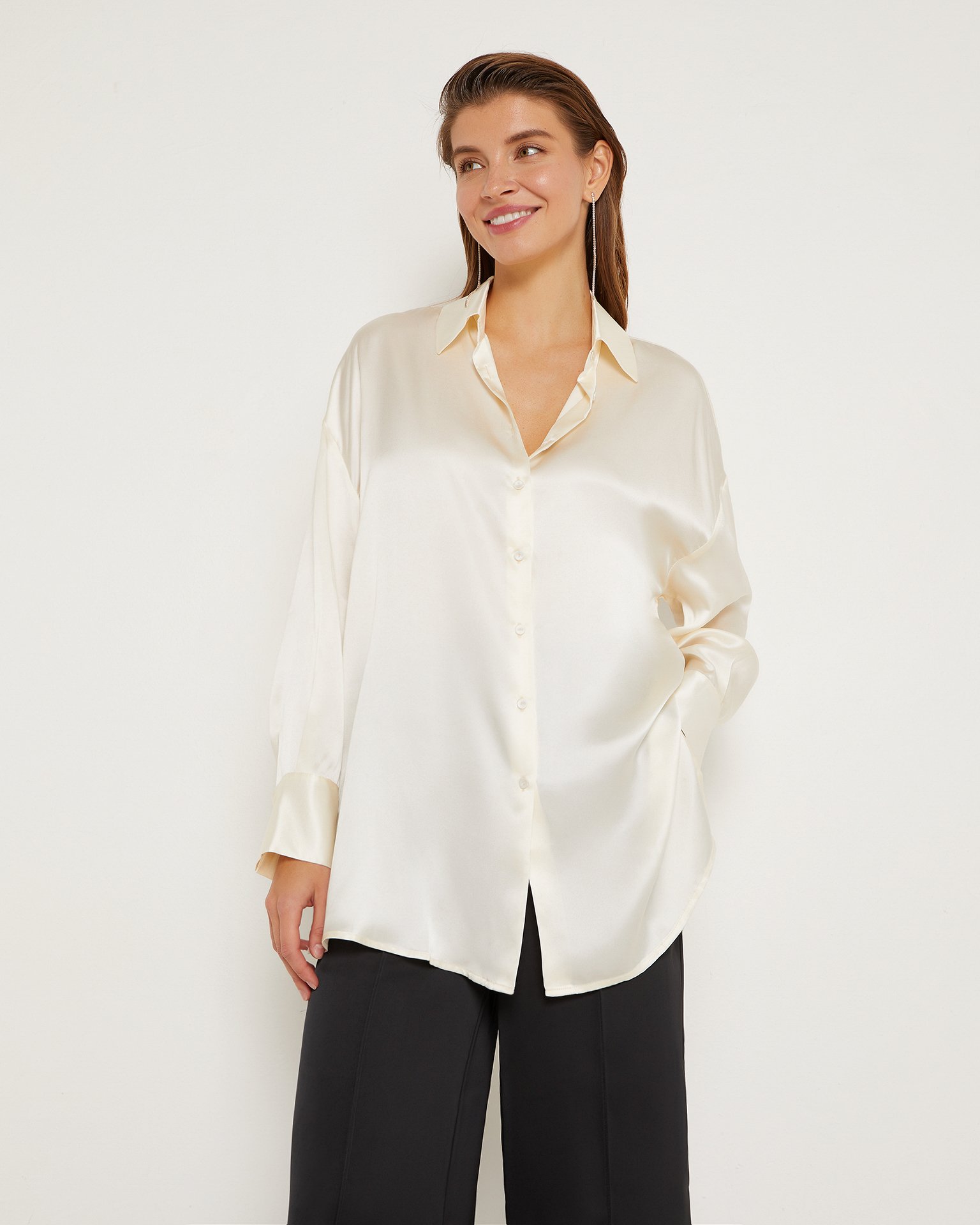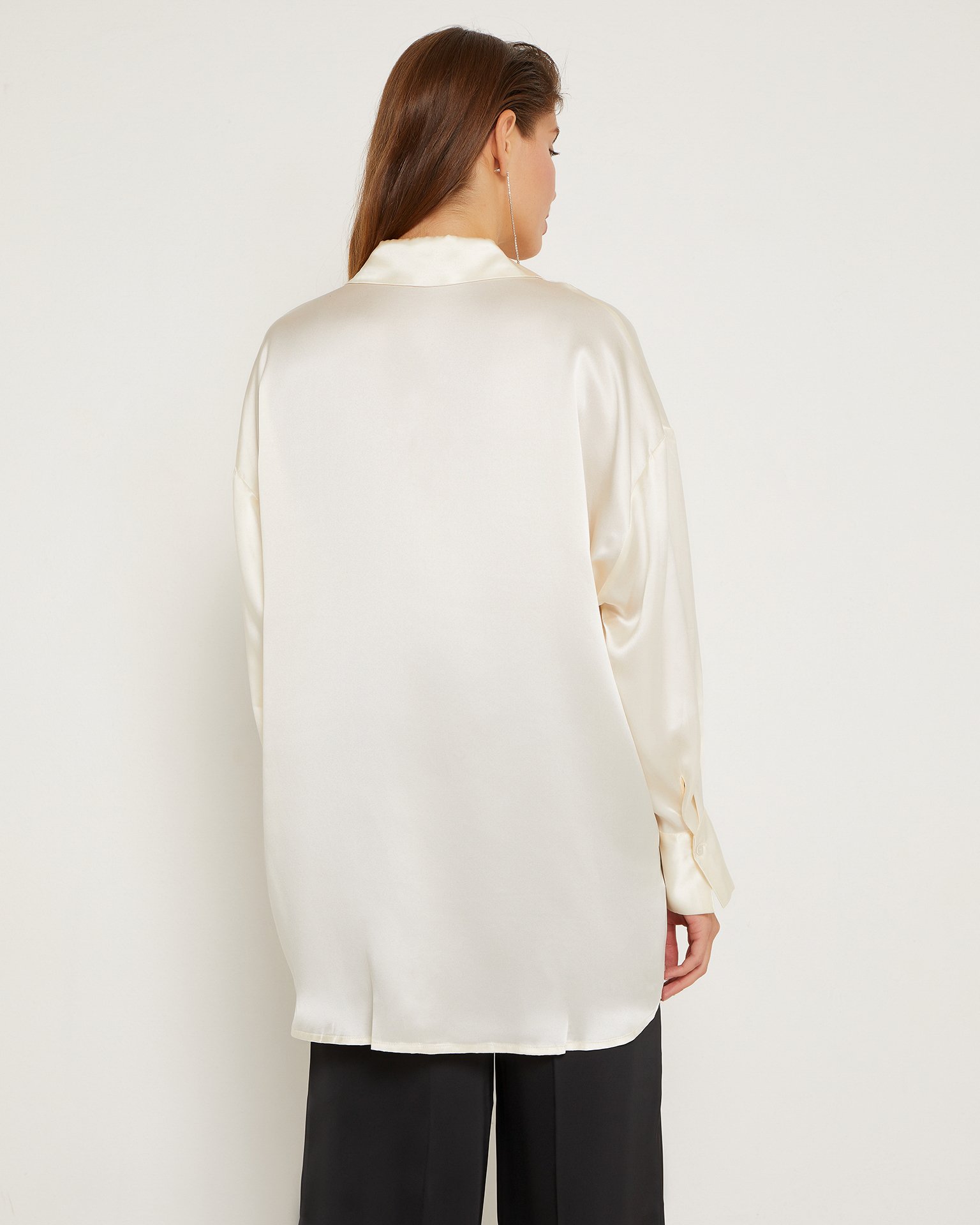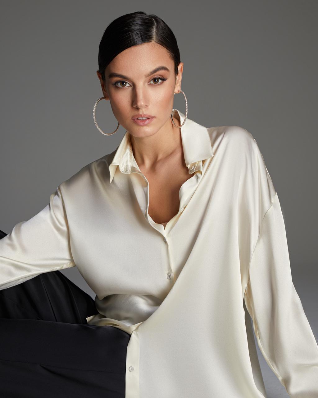 A solid-colour classic button-down shirt with long sleeves, slightly flaring towards the hem. A versatile and practical element for your wardrobe that can be paired with anything from tailored skirts to ripped jeans and strappy dresses.