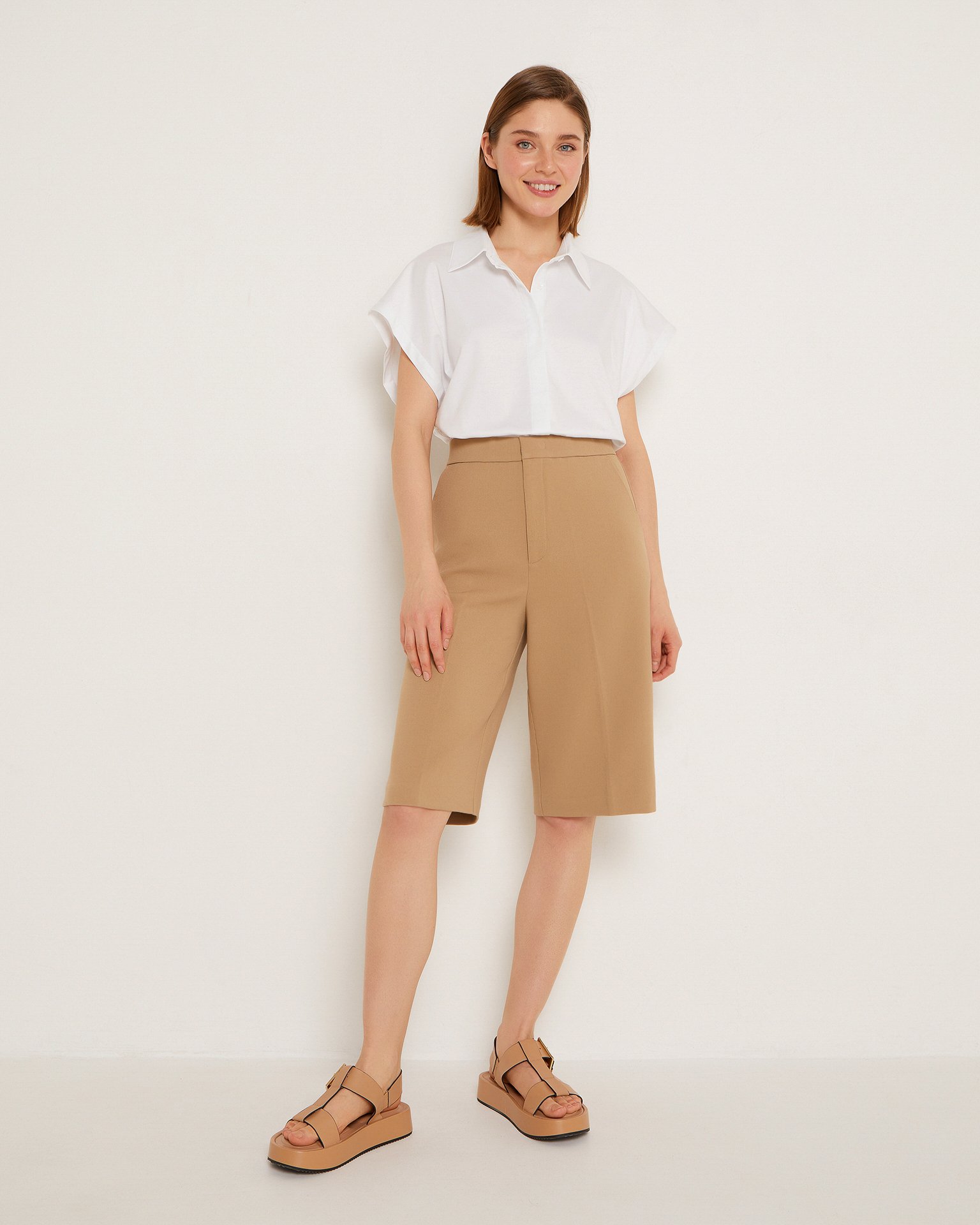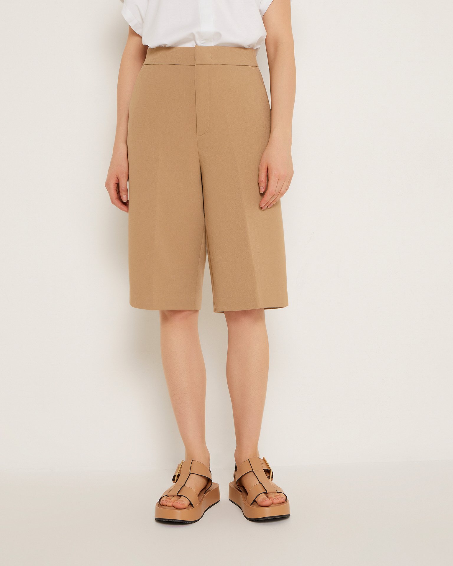 Bermuda shorts with creases, made from suiting fabric. High-rise waist, concealed front fastening, side seam pockets, and back pockets with a flap. The runways of the world's fashion houses have introduced a new generation of classic into the female wardrobe – Bermuda shorts made from suiting fabric. They are suitable with a shirt for the office, with a jumper for a city stroll, or with a simple top for meeting friends. Composition: 68% viscose, 30% polyester, 2% elastane Model's measurements: Height 176 cm, bust 84 cm, waist 60 cm, hips 90 cm