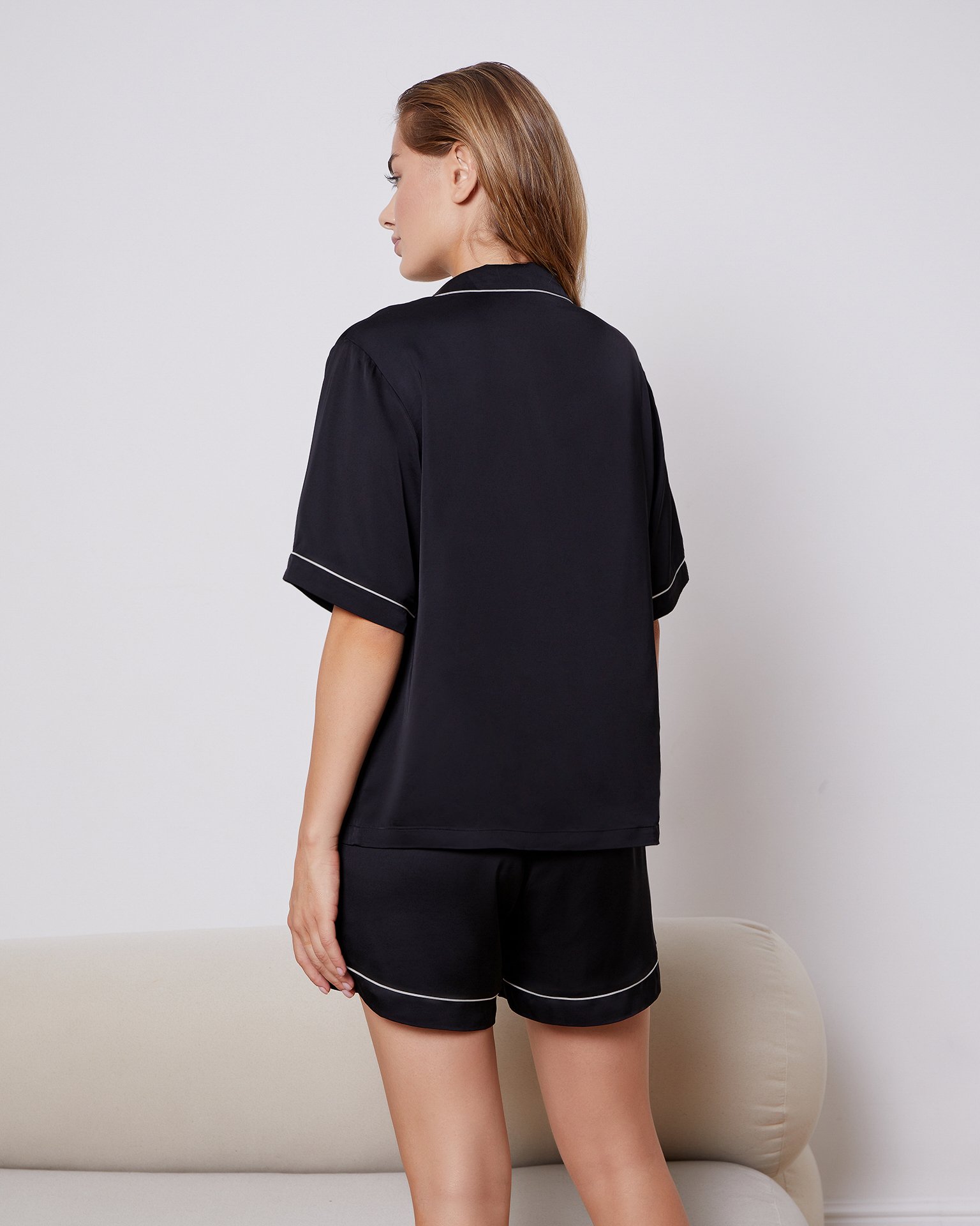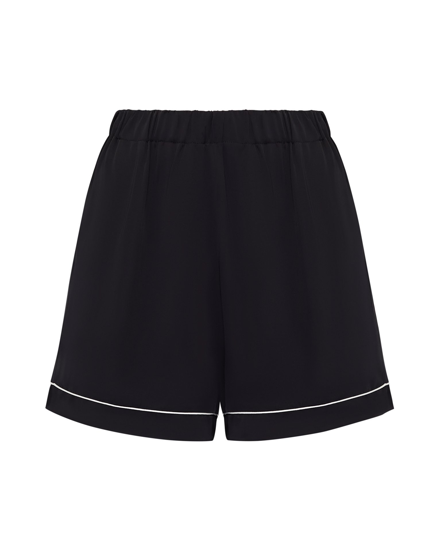 Viscose shorts with an elasticated waist and contrasting topstitching along the edges. Comfortable shorts in neutral shades – a must-have for creating stylish summer looks. This model pairs well with satin tops on thin straps or crop tops for a trendy beach party look. Can be paired with a TO BE BLOSSOM jacket for an elegant ensemble. Composition: 100% viscose Model's measurements: Height 176 cm, bust 86 cm, waist 62 cm, hips 91 cm