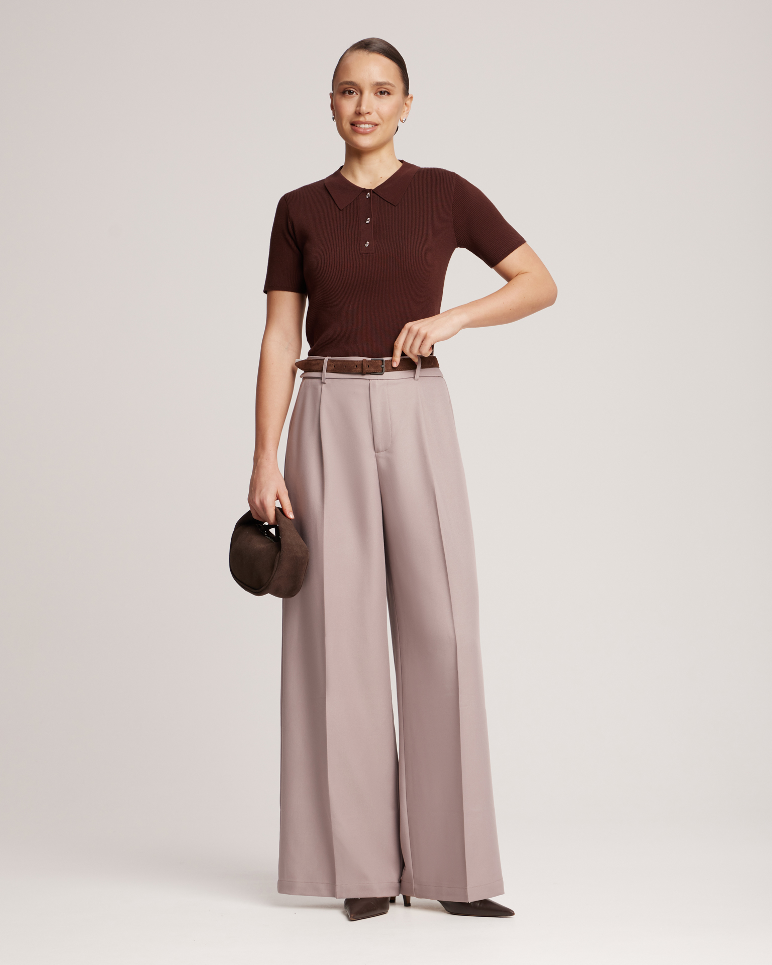 High-waisted trousers. Wide-leg, relaxed-fit trousers with pockets and creases. This is one of the season's trend-setting models that can serve as a base for creating both casual and elegant looks. Pair these trousers with an oversized cardigan for walks through the autumn city, or add a top and a classic blazer for the office. Model's measurements: Height 172 cm, bust 80 cm, waist 59 cm, hips 89 cm.