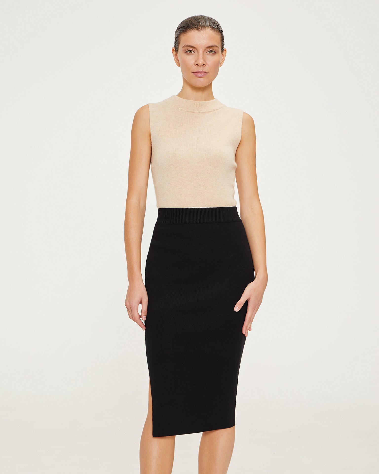 A midi skirt with a straight cut, slightly tapered towards the hem. This is one of the most versatile skirt models that suits all body types. Combine it with classic shirts for office outfits or with oversize jumpers from our collection for a relaxed look. Composition: 80% viscose, 20% polyester Model's measurements: height 175 cm, bust 80 cm, waist 59 cm, hips 88 cm