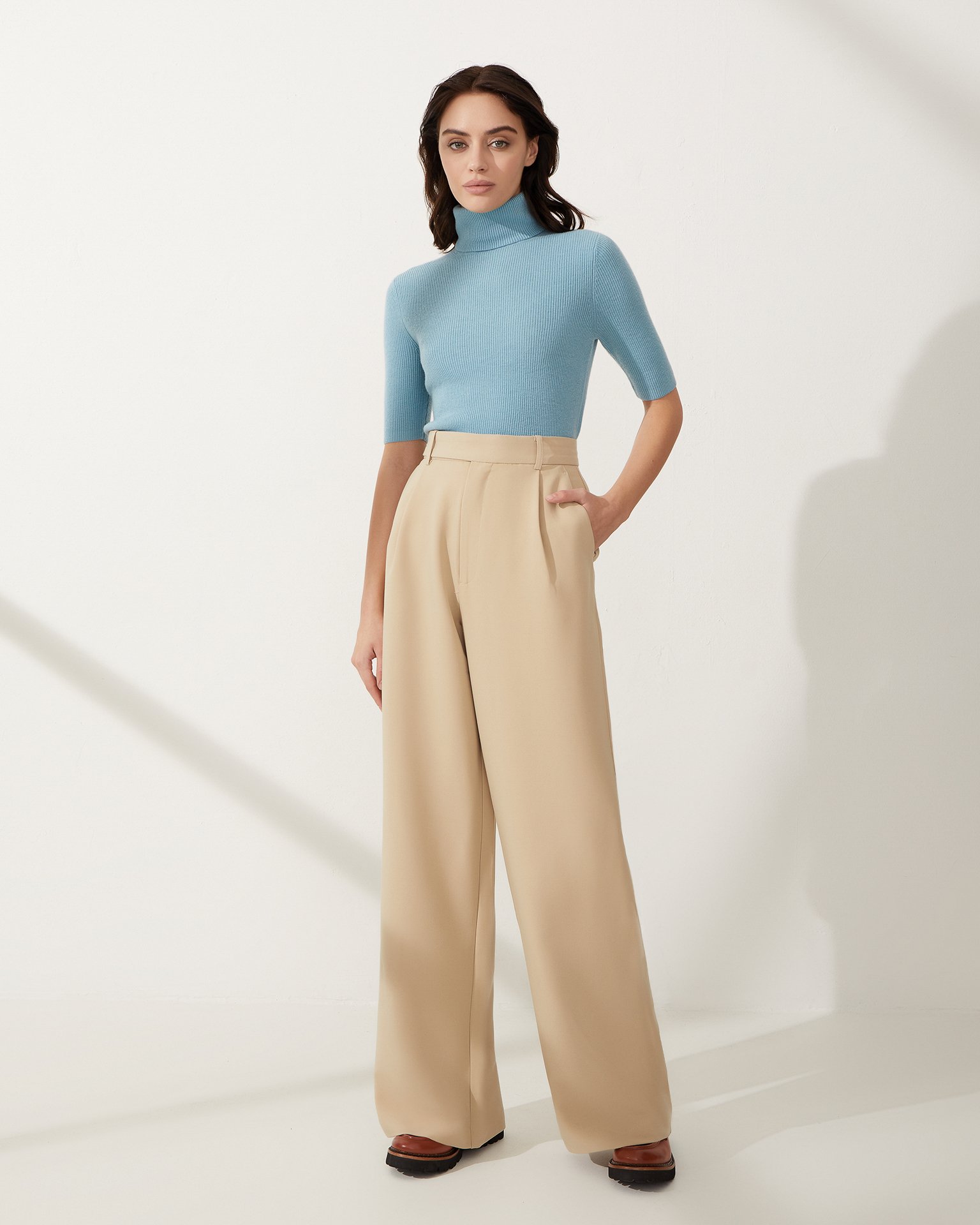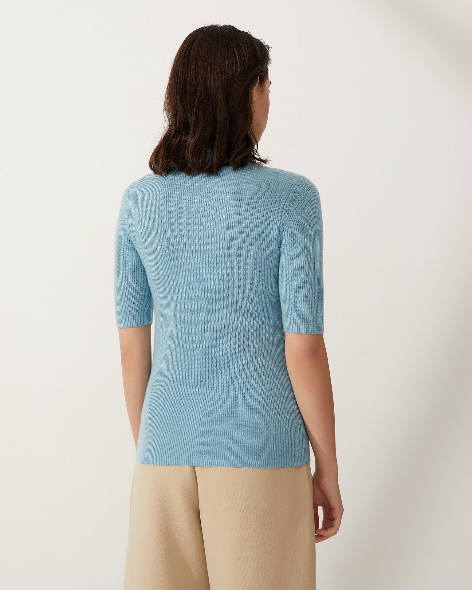 A short-sleeved turtleneck crafted from 100% wool. Features a high neck, ½ sleeve length, ribbed knit, and a fitted silhouette. A wardrobe essential for creating stylish looks with any bottom, from high-waisted jeans to midi-length skirts in eco-leather. Composition: 100% wool Model's measurements: Height 174 cm, bust 89 cm, waist 61 cm, hips 88 cm