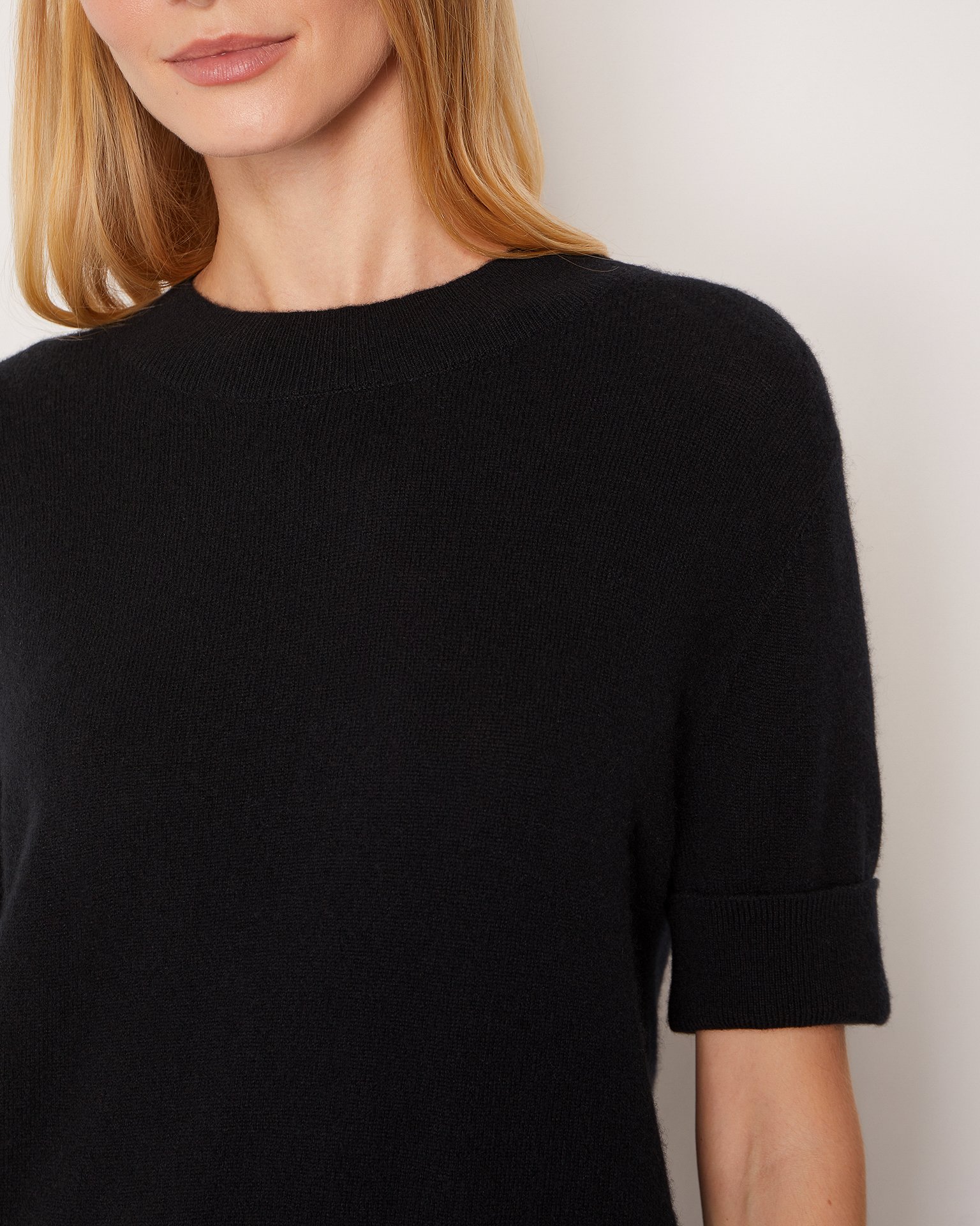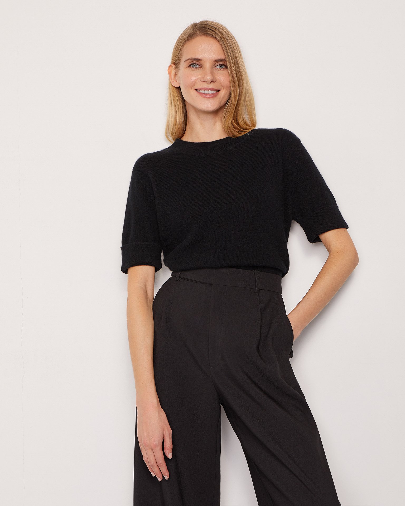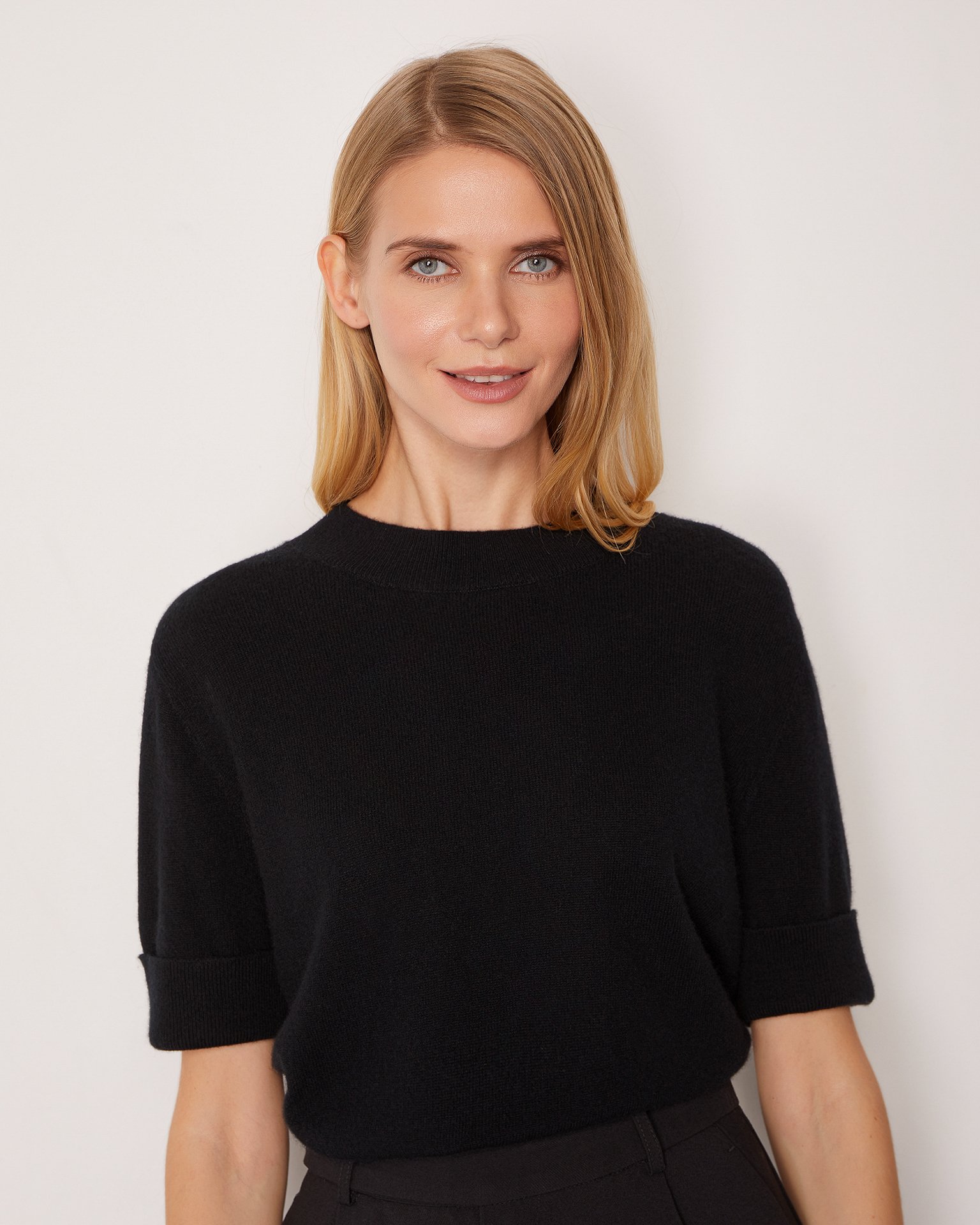 An elongated top of a wool and cashmere blend. Short sleeves, slightly dropped shoulder line, relaxed fit. Turn-back cuffs, a low stand-up collar, and ribbed bottom hem. When building a basic, stylish wardrobe, be sure to include a concise top in a basic black colour. Integrate it into any capsule; trendy pairing – a monochrome look with TOBEBLOSSOM Bermudas. Composition: 50% wool, 50% cashmere Model's measurements: Height 176 cm, bust 84 cm, waist 60 cm, hips 90 cm