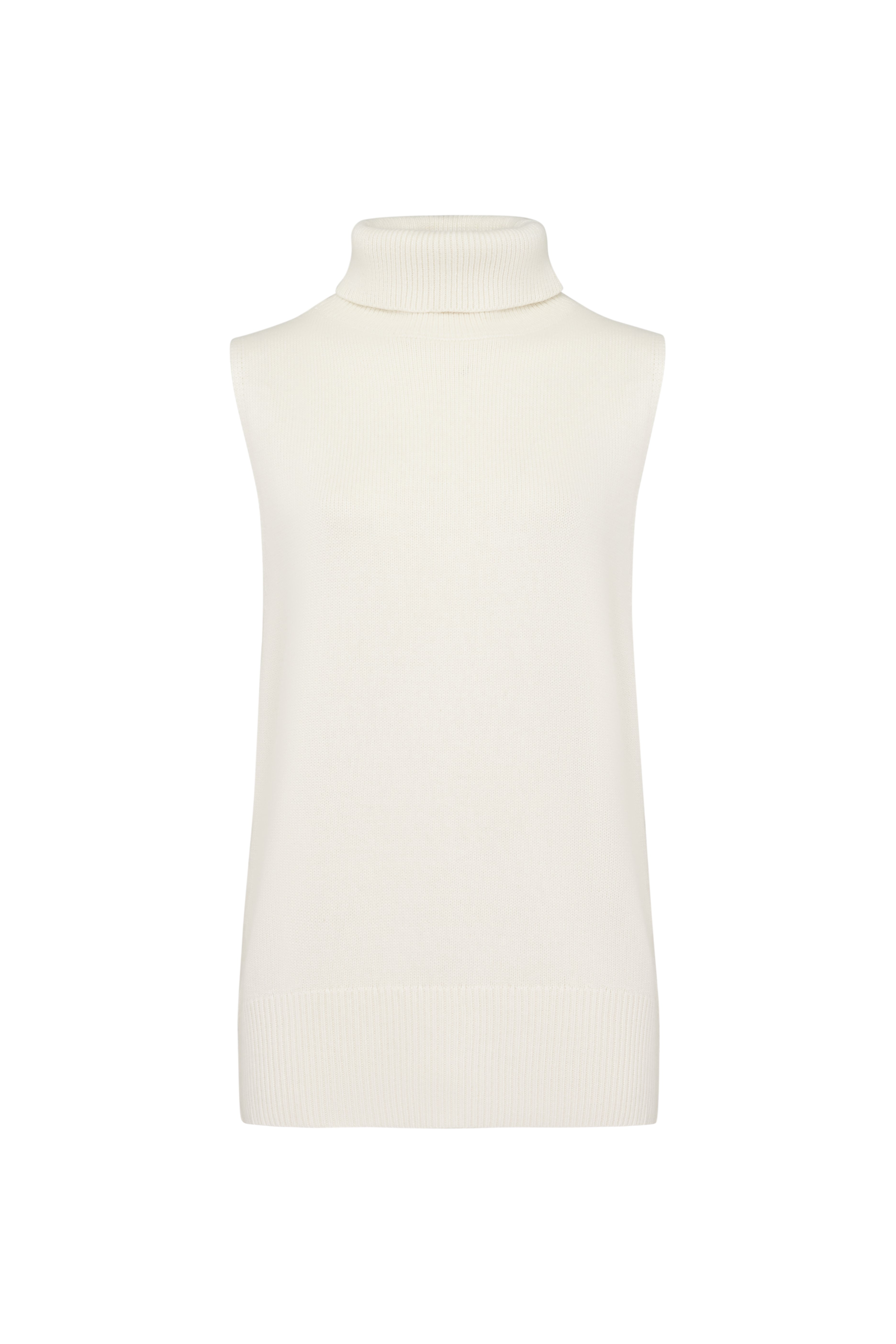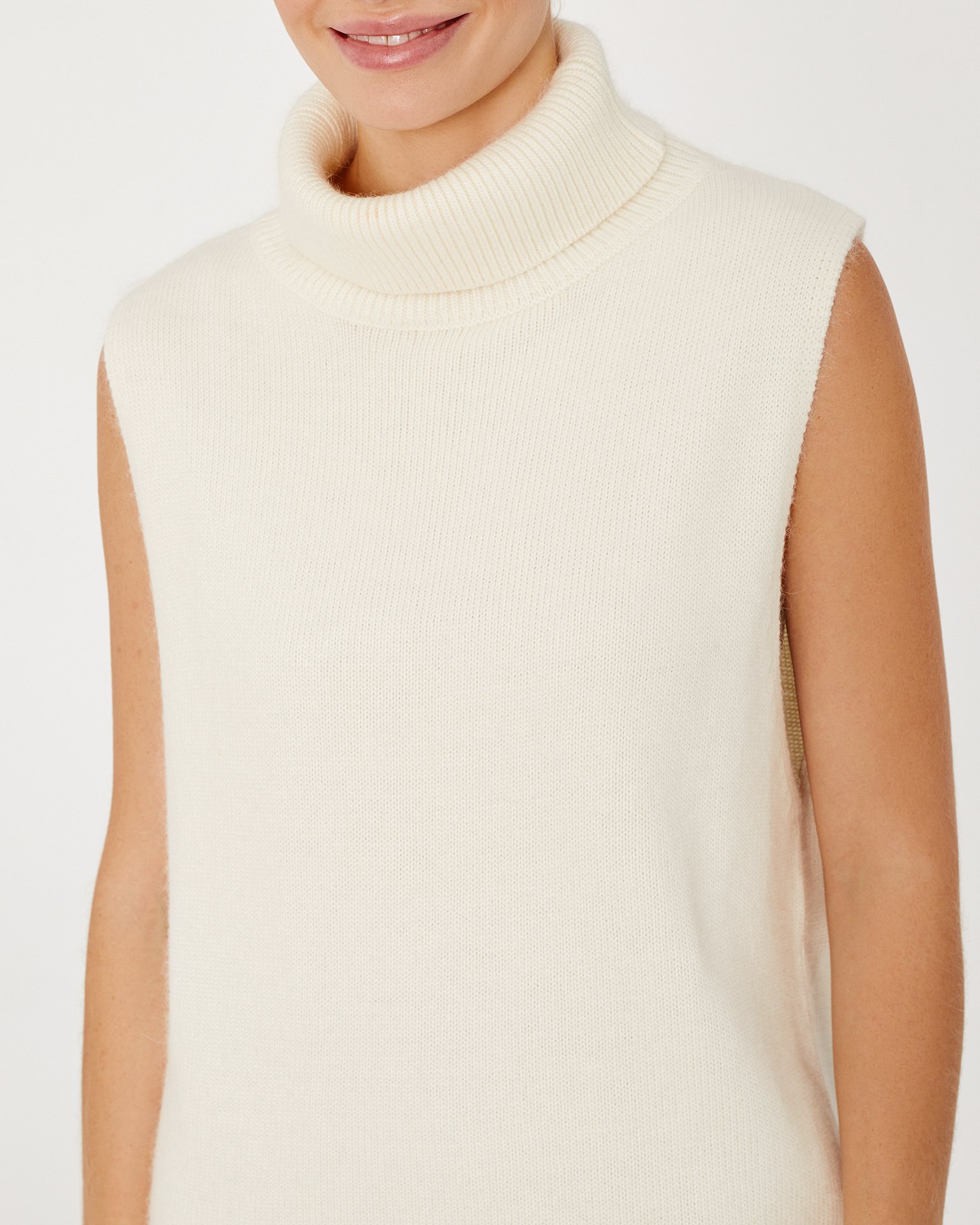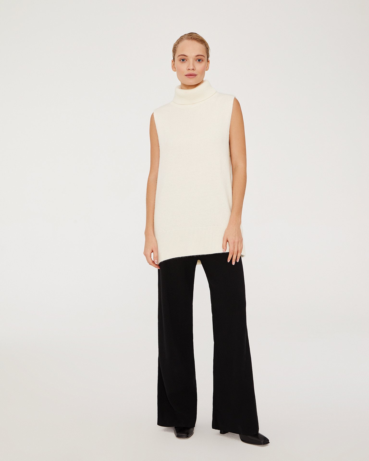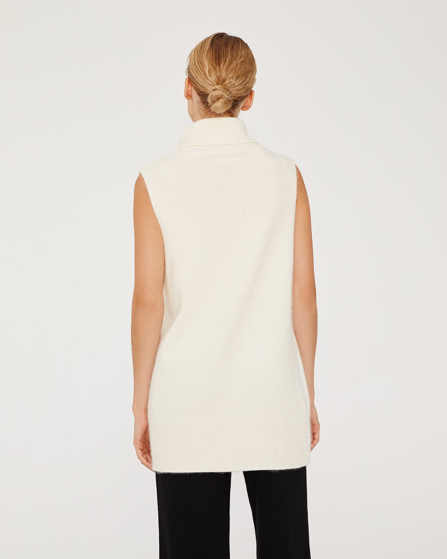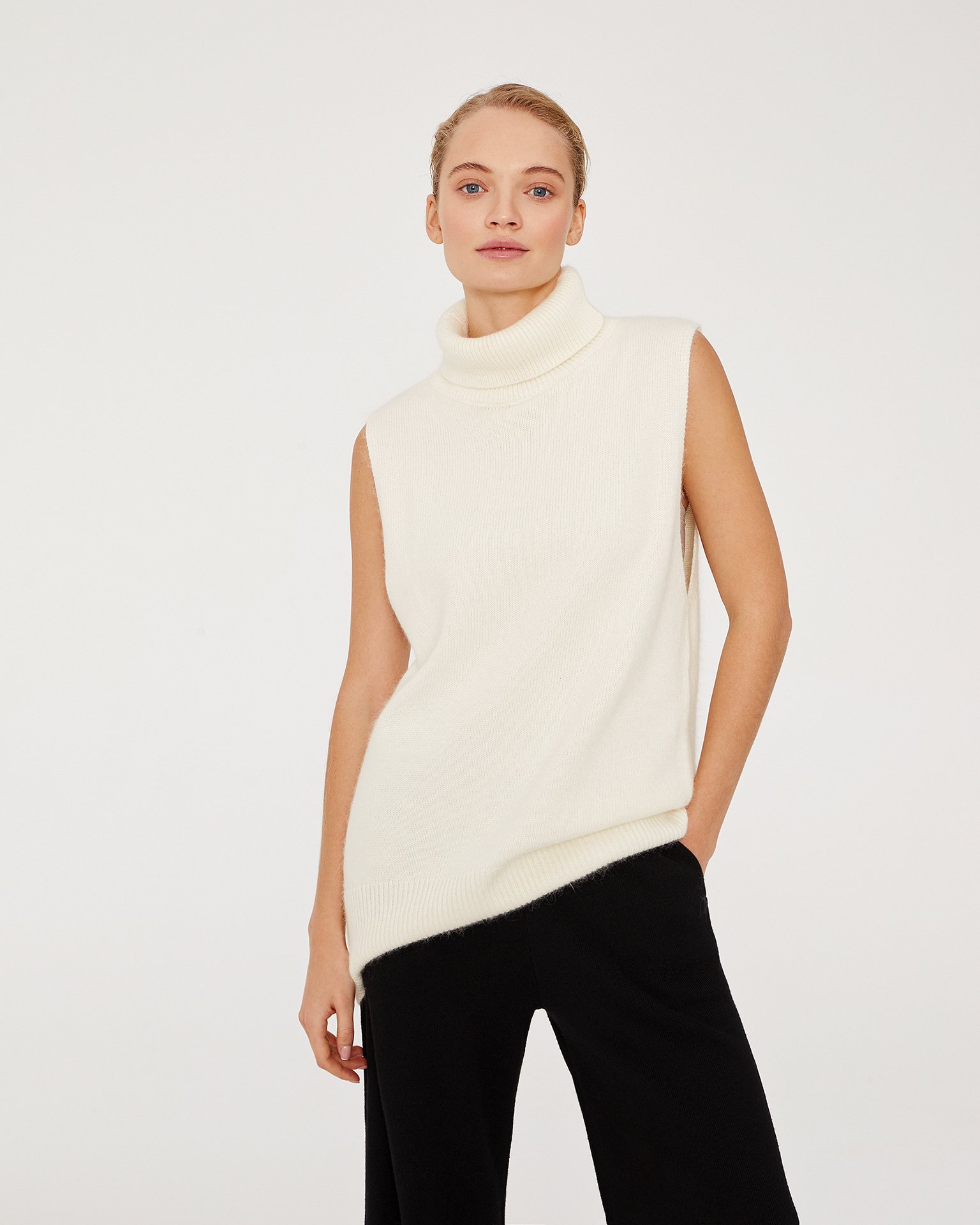 An elongated sleeveless jumper with a voluminous high neckline. Edges are finished with ribbing. Made from a blend of materials including cashmere and wool. This is a piece you will definitely take with you to a ski resort. Wear a basic thin turtleneck in a matching tone underneath and pair it with warm TOBEBLOSSOM trousers. Composition: 45% viscose, 20% nylon, 20% lamb wool, 15% cashmere Model's measurements: Height 175 cm, bust 81 cm, waist 59 cm, hips 88 cm.
