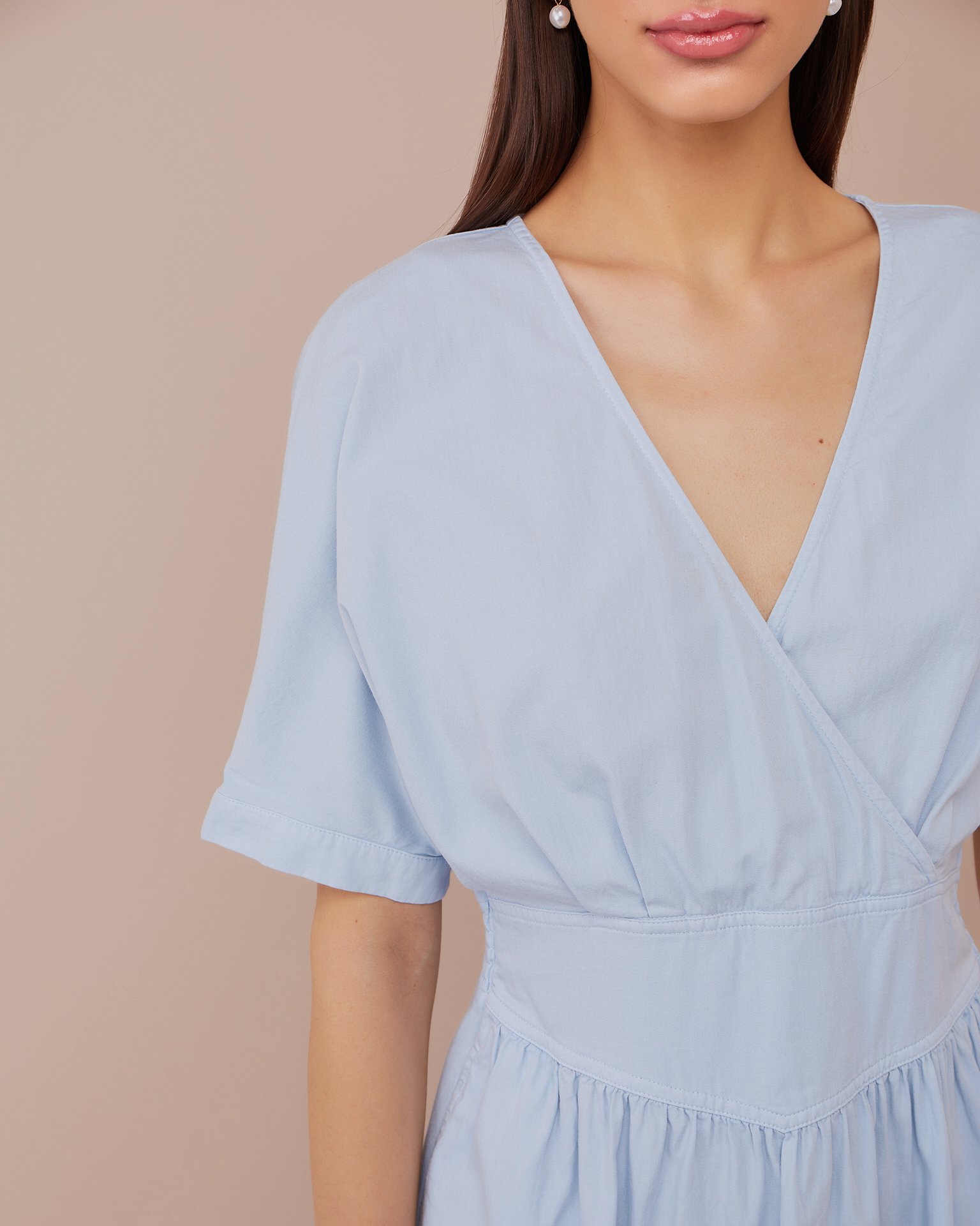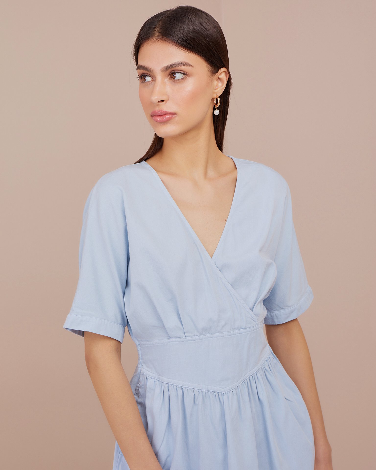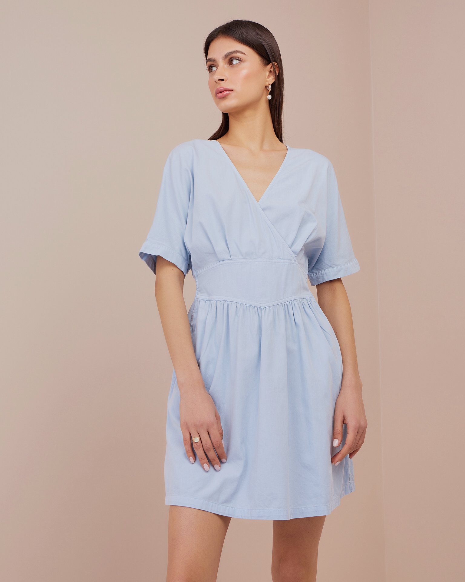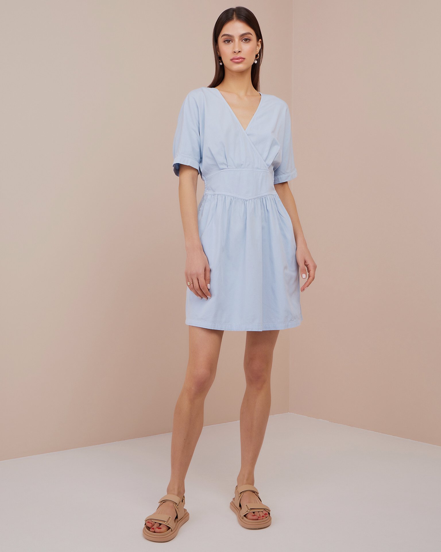 A model with a fitted silhouette, short raglan sleeves, and a romantic V-neckline. The dress features a comfortable elasticated belt, with vertical flowing pleats running the full length of the skirt.