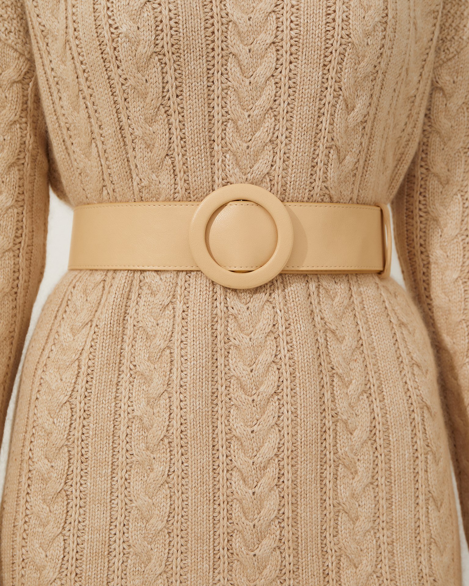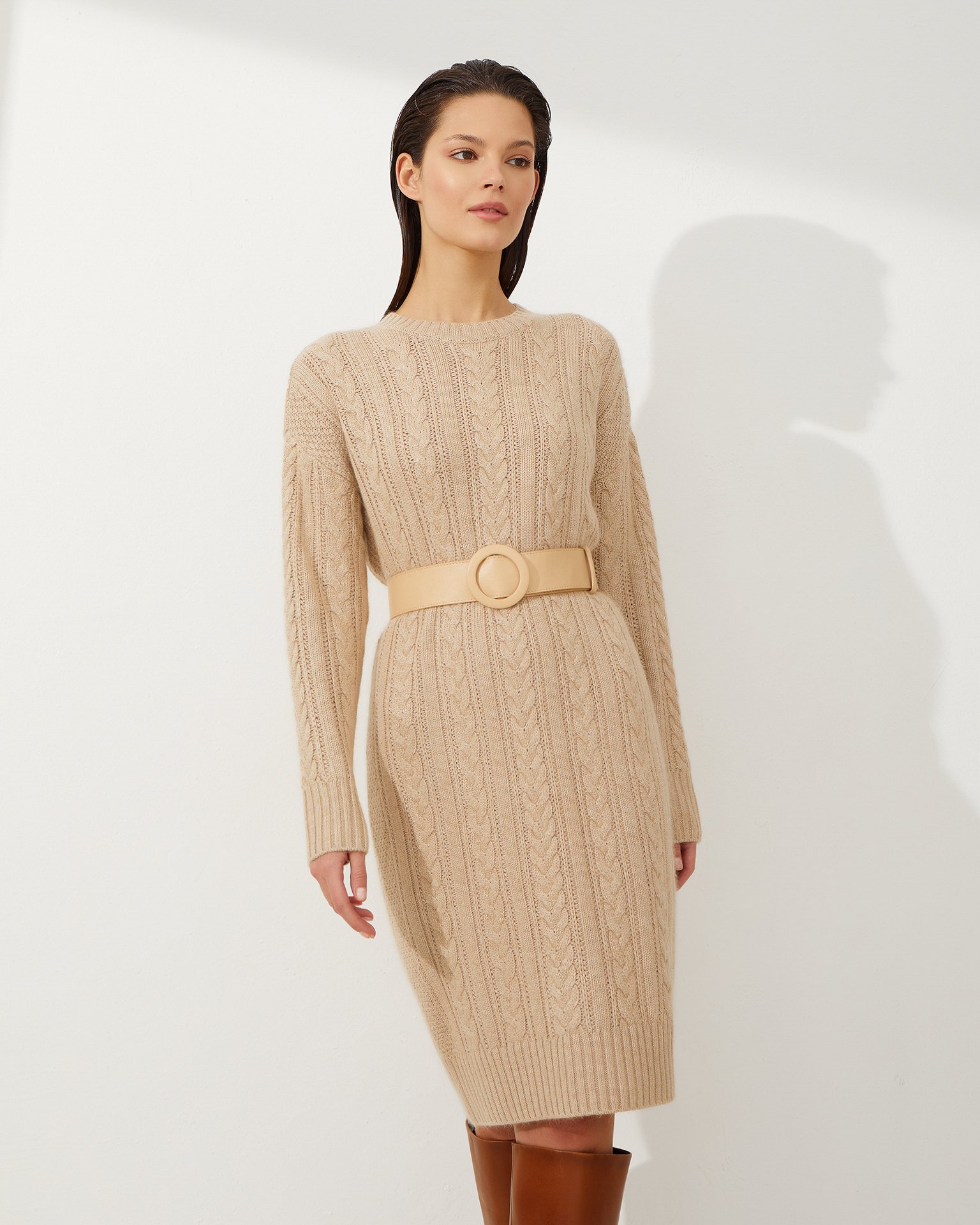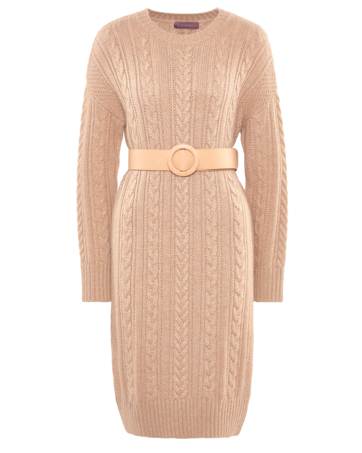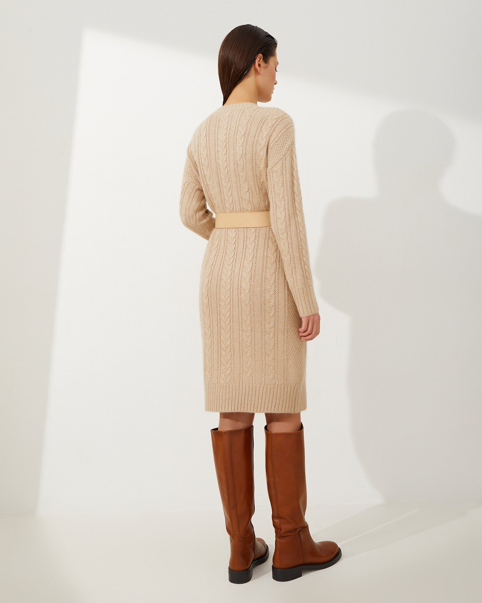 A dress made from a chunky knit, coming with an eco-leather belt. Features dropped shoulders, an oval neckline; the wide cuffs and hem are finished with a ribbed elastic trim. The dress is decorated with a textured cable-knit pattern throughout. A blended yarn of angora and lambswool provides a warm and delicate feel against the skin. This elegant, loose-fitting winter dress is the perfect choice for a feminine look. The wide belt at the waist adds an accent to the outfit. Composition: 45% viscose, 40% nylon, 11% angora, 4% lambswool Model's measurements: Height 174 cm, bust 89 cm, waist 61 cm, hips 88 cm