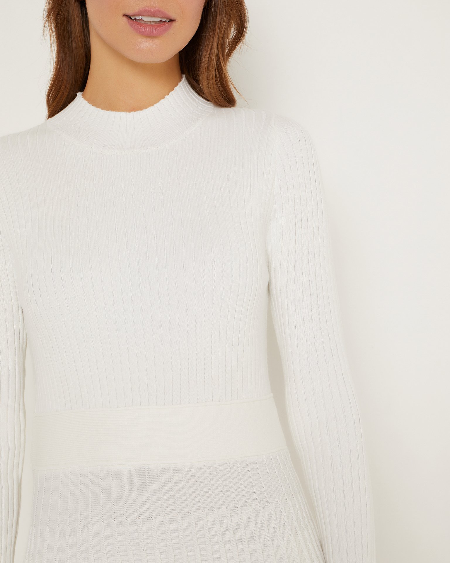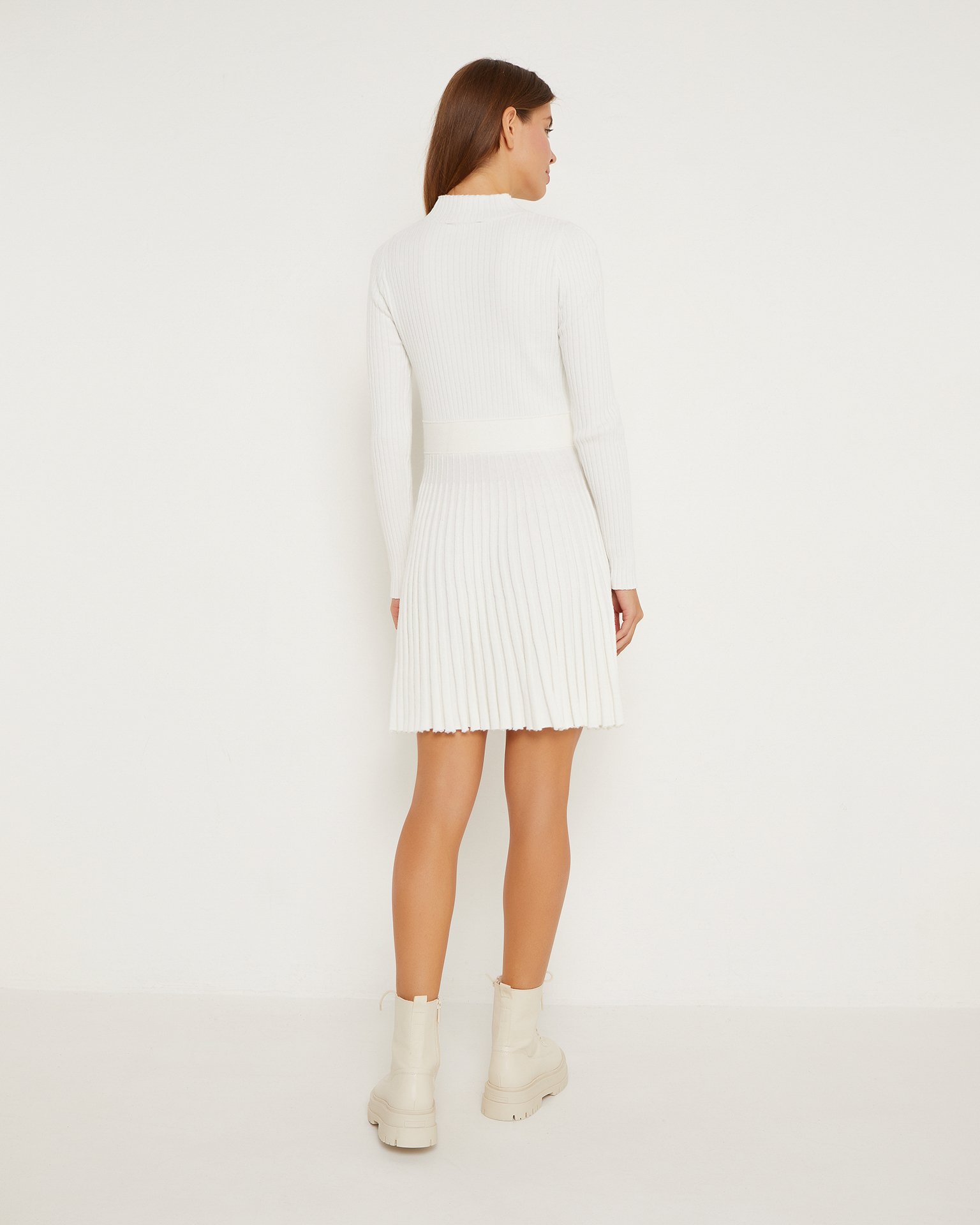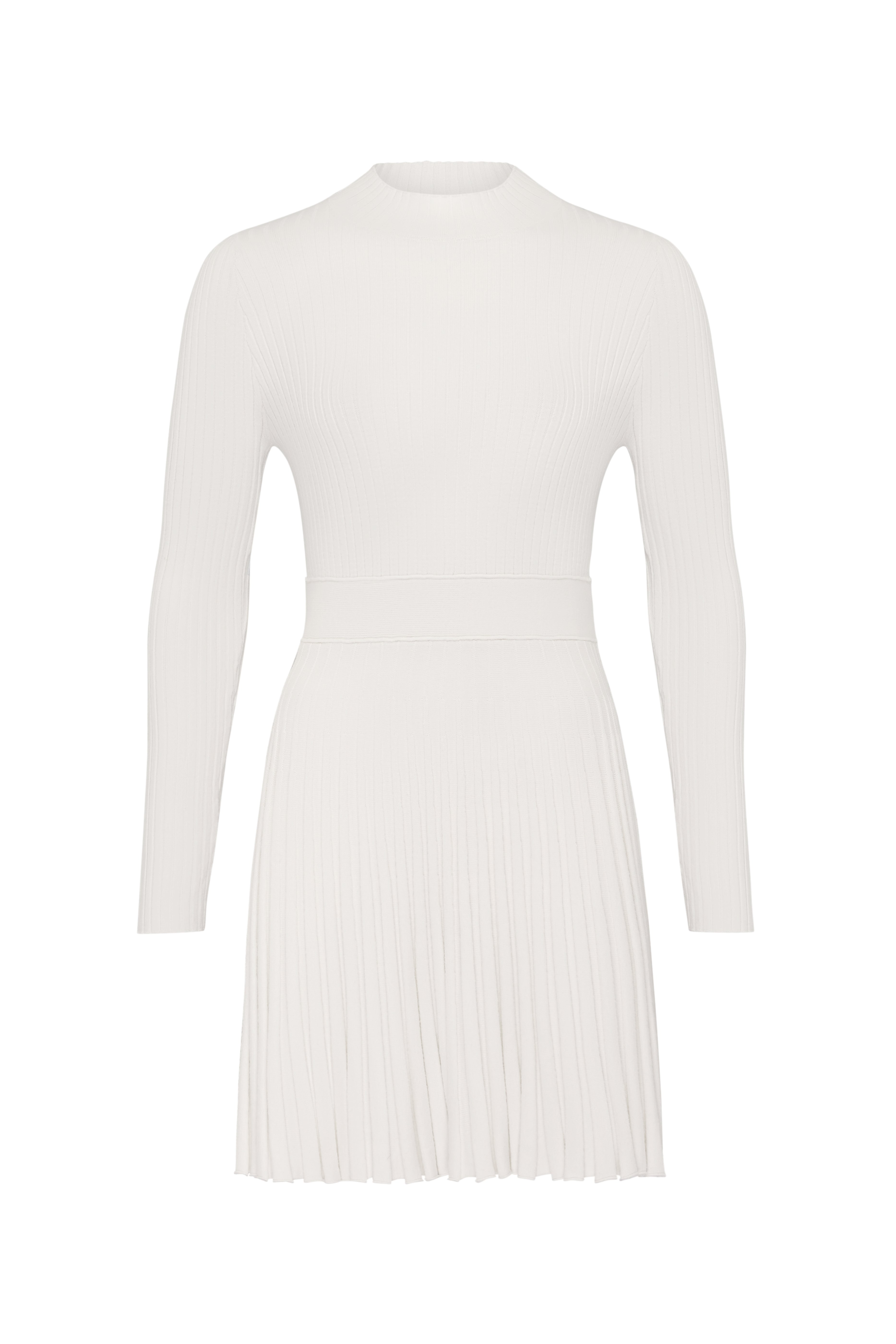 A ribbed knit dress with a pleated, flared skirt. Features a fitted silhouette, long sleeves, a low stand-up collar, and an elasticated, knitted-in waistband. This dress, at the intersection of contemporary trends and 60s style, awakens a flirtatious mood. Mix with chunky combat boots for an eclectic look or wear with high boots to accentuate femininity.