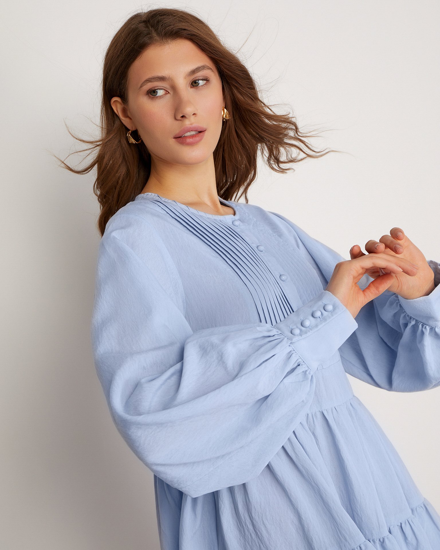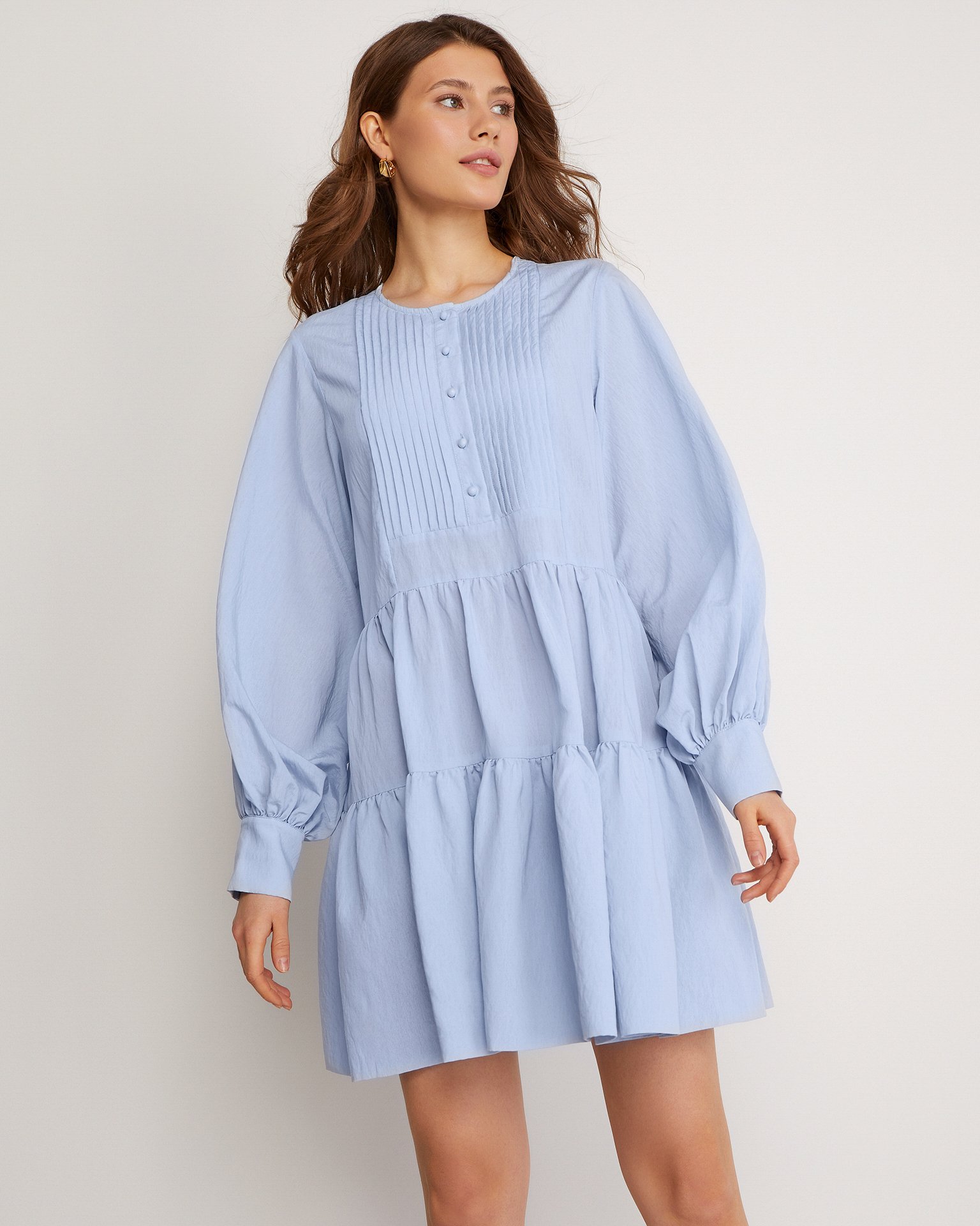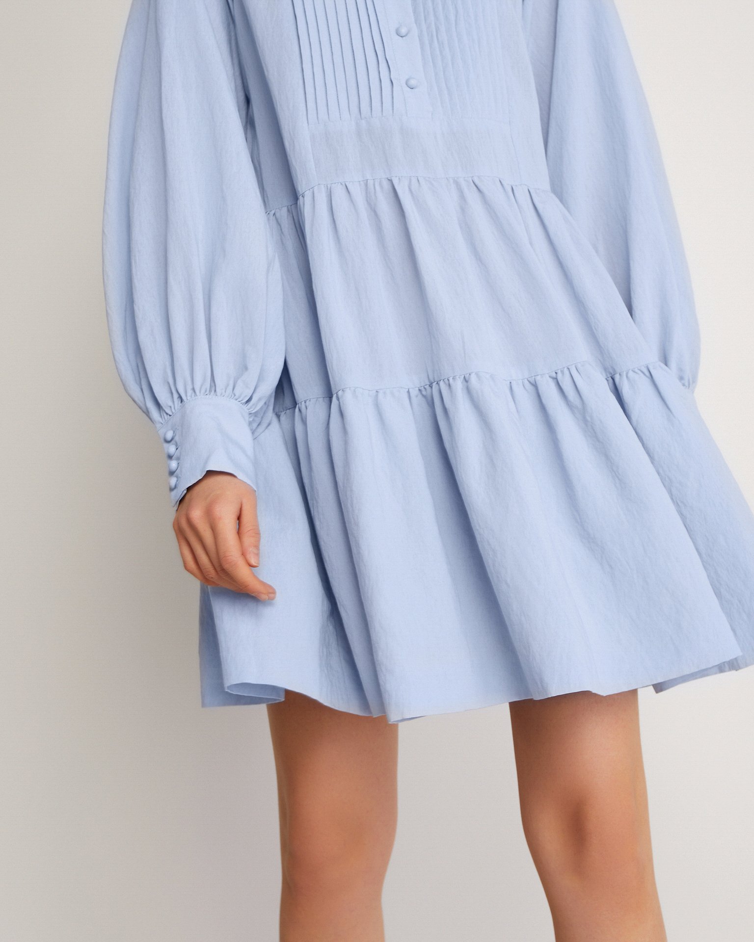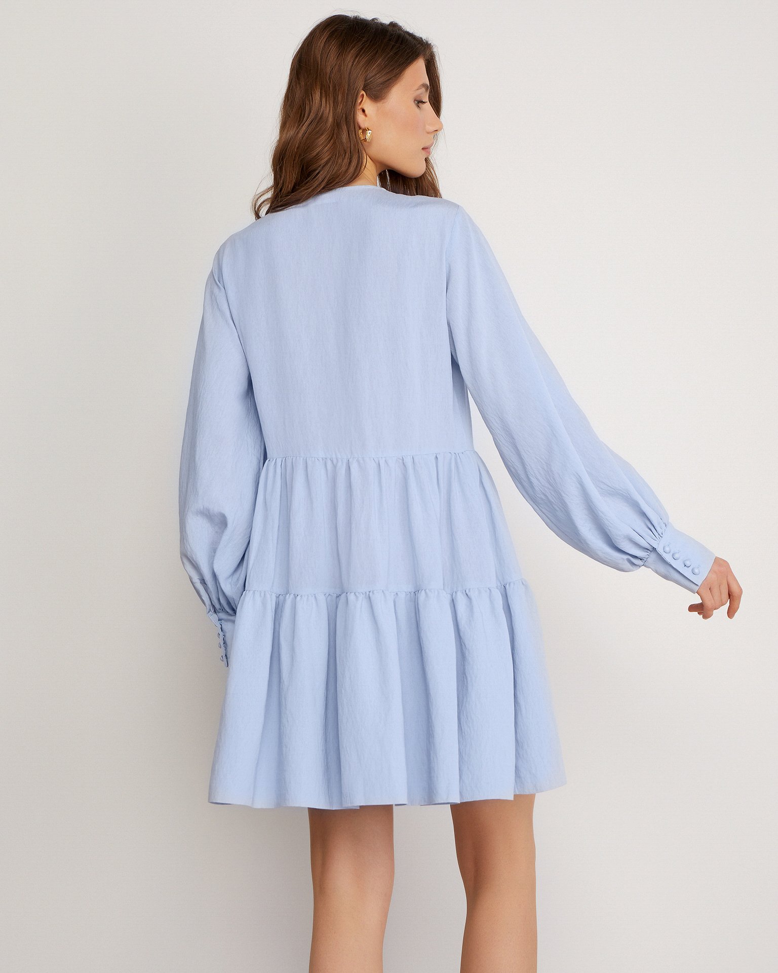 A lightweight tiered viscose dress with long voluminous sleeves, buttoned cuffs, and a flowing short skirt. This model is a prime candidate for your favourite piece in your spring-summer wardrobe. Composition: 80% viscose, 15% polyester, 5% nylon Model's measurements: 172 cm, bust 80 cm, waist 59 cm, hips 89 cm Model wears size: S