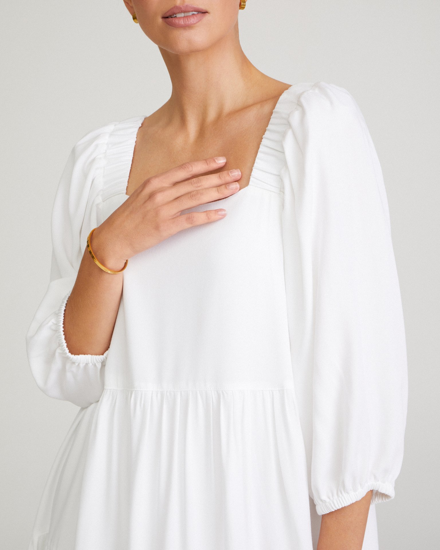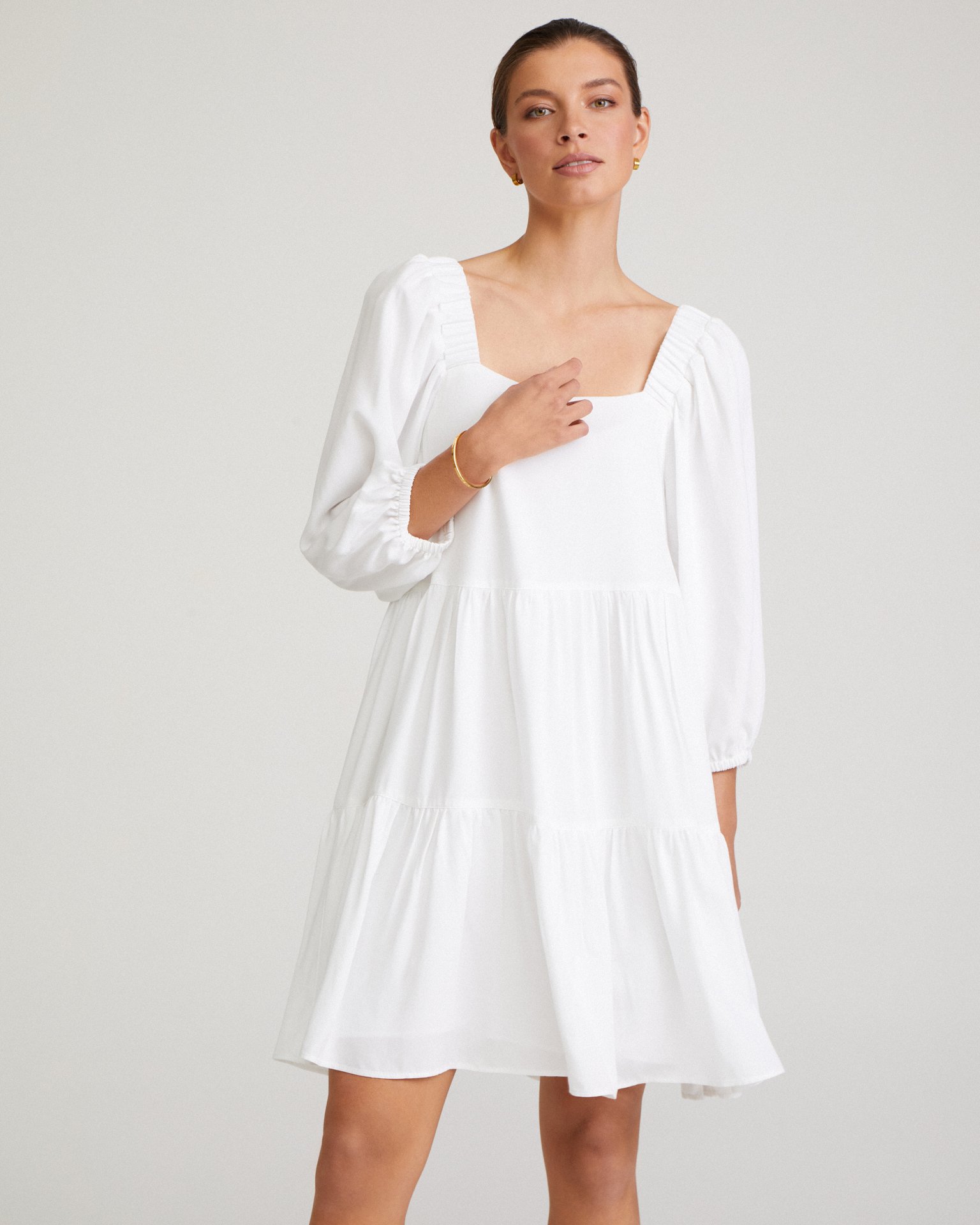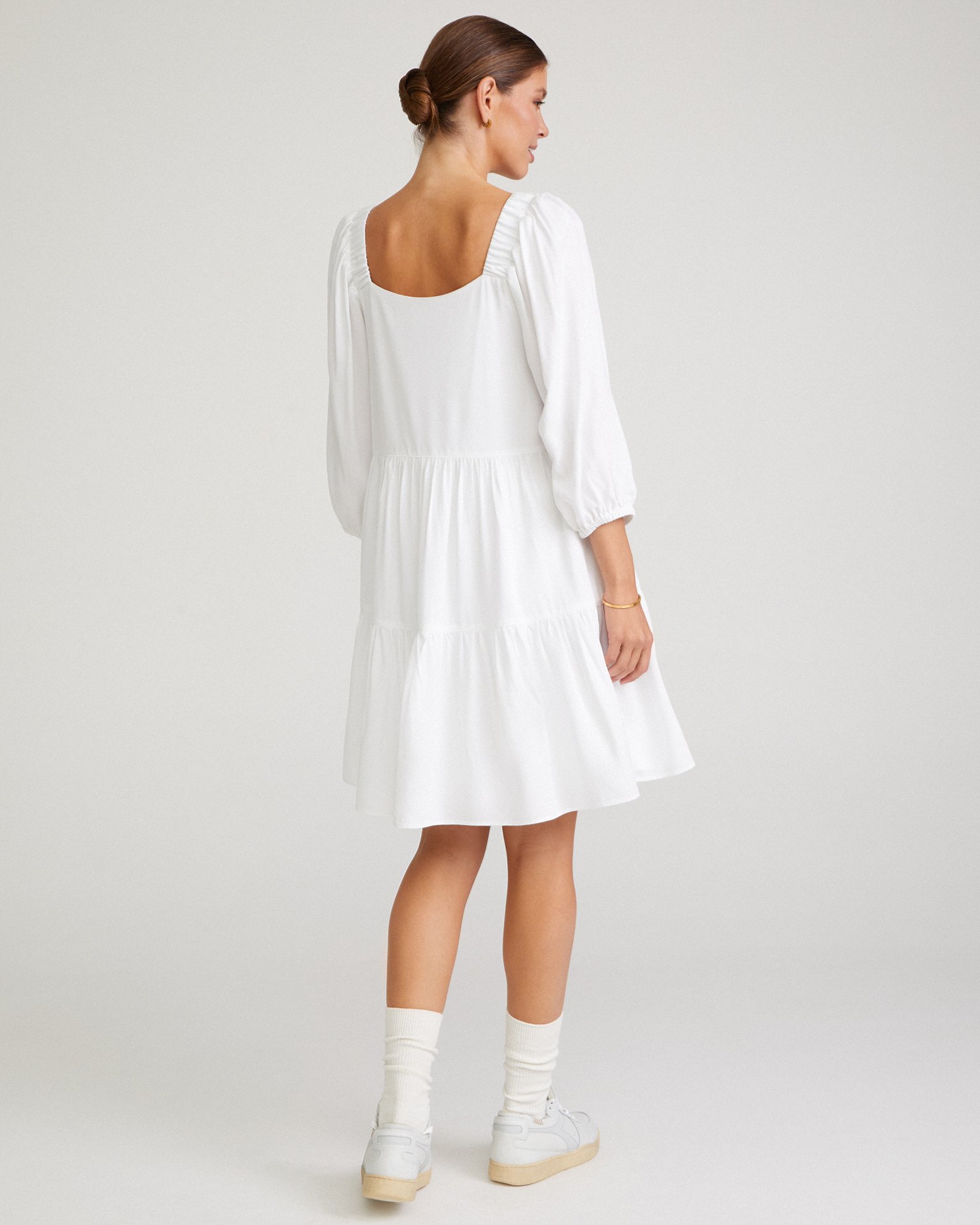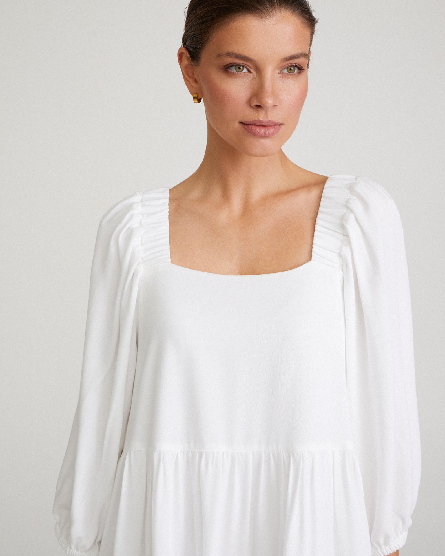 A relaxed-fit dress with a flared skirt and long sleeves. Features a shallow square neckline and a length just above the knee. The perfect dress for summer parties and strolls; pair with sandals, plimsolls, or heeled sandals and complement with your favourite accessories. Composition: 100% viscose Model's measurements: Height 176 cm, bust 80 cm, waist 59 cm, hips 89 cm.