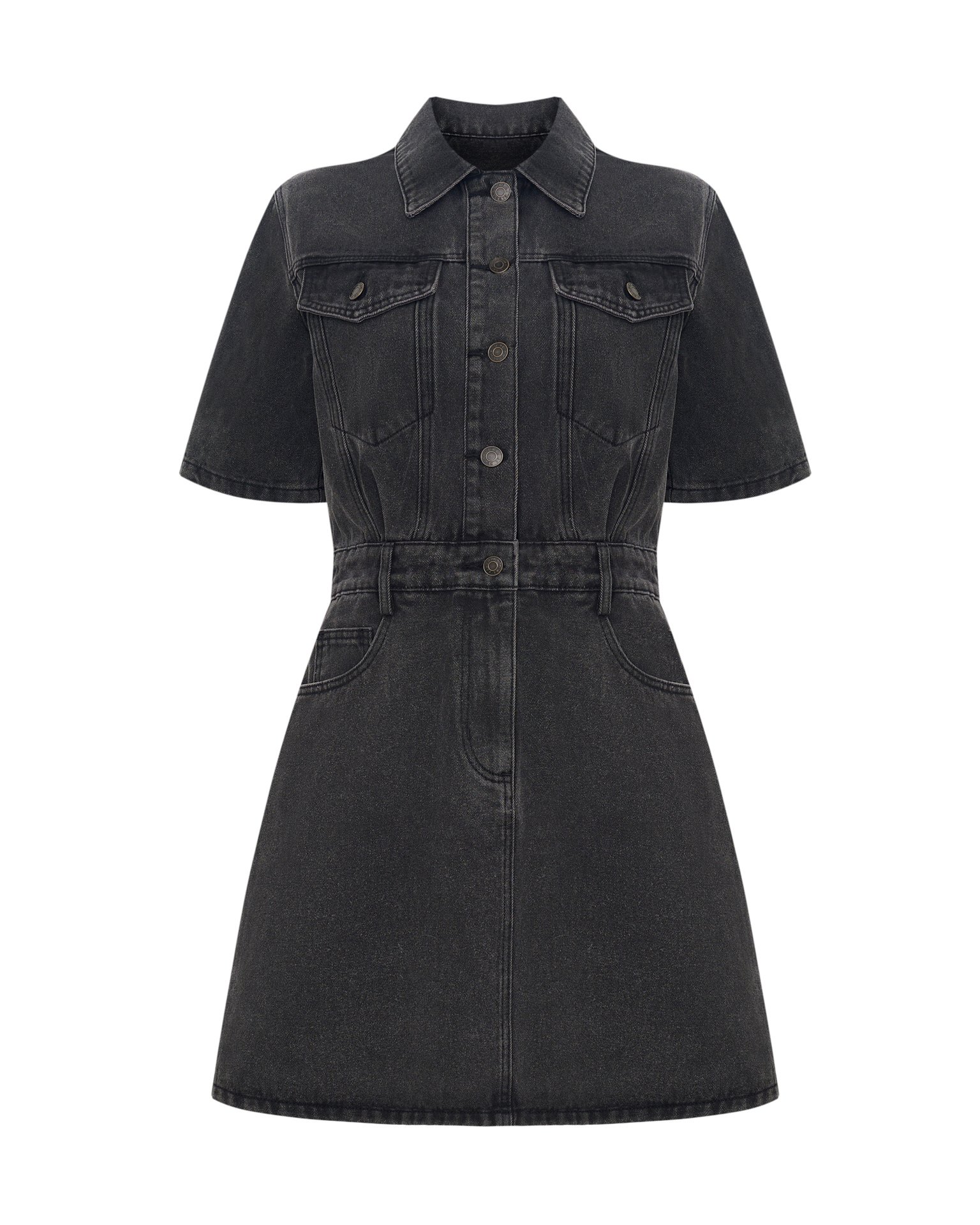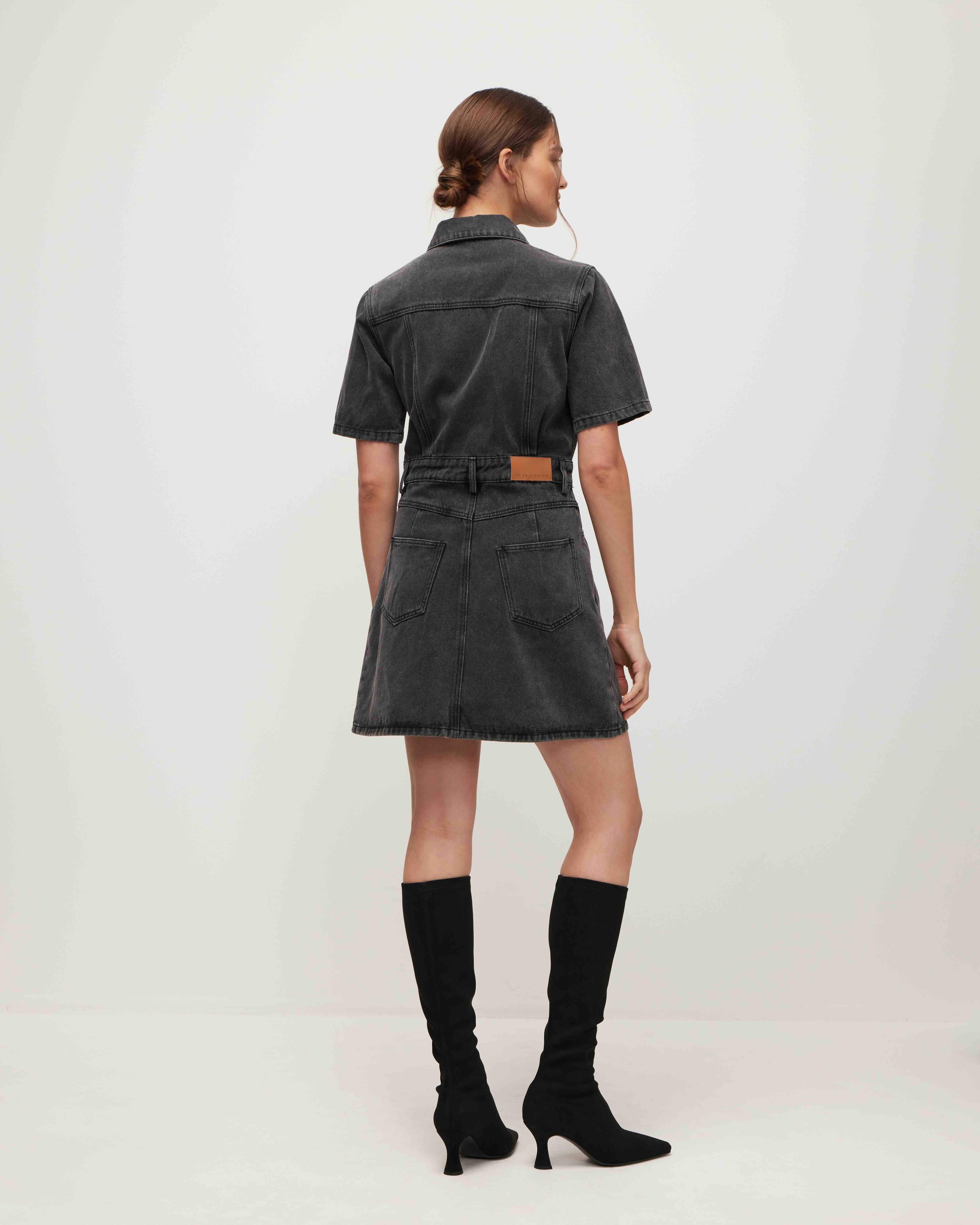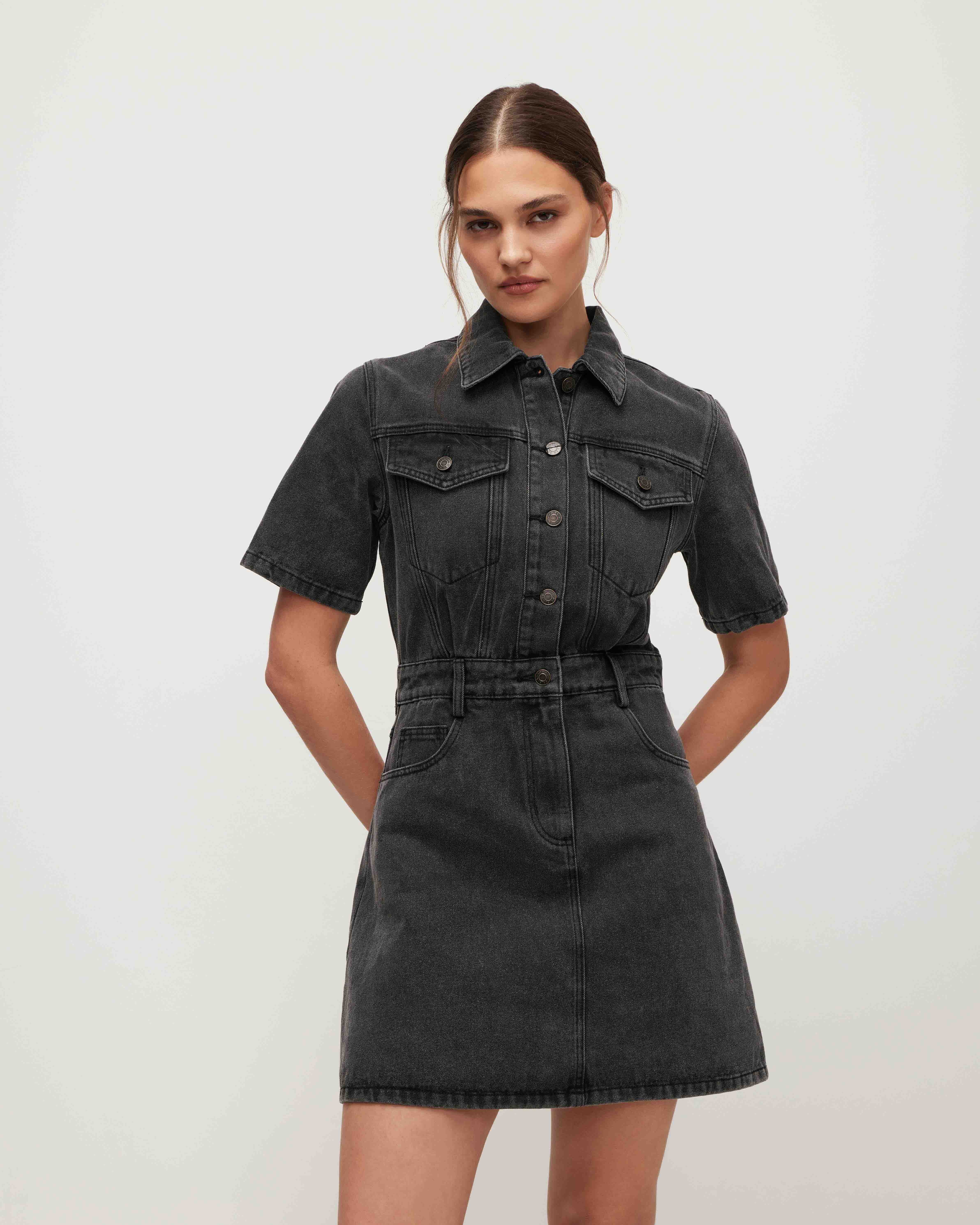 A fitted denim mini dress. It fastens with buttons, and a zip runs from the waist, concealed under a placket. A belt, belt loops, a turn-down collar, and two patch pockets with flaps on the chest add functional and stylish accents. Model's measurements: height 178 cm, bust 87 cm, waist 64 cm, hips 94 cm. Model wears size: S.