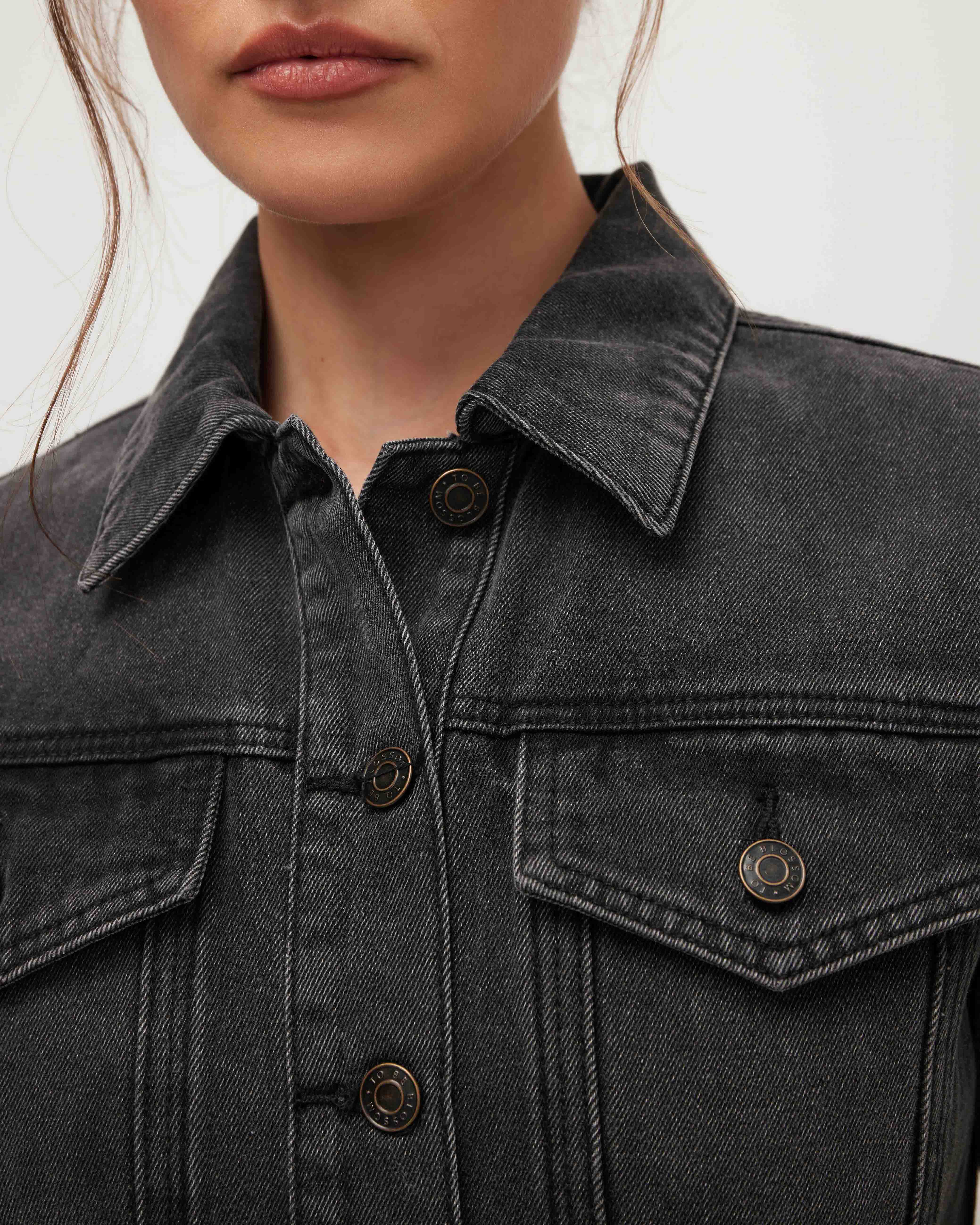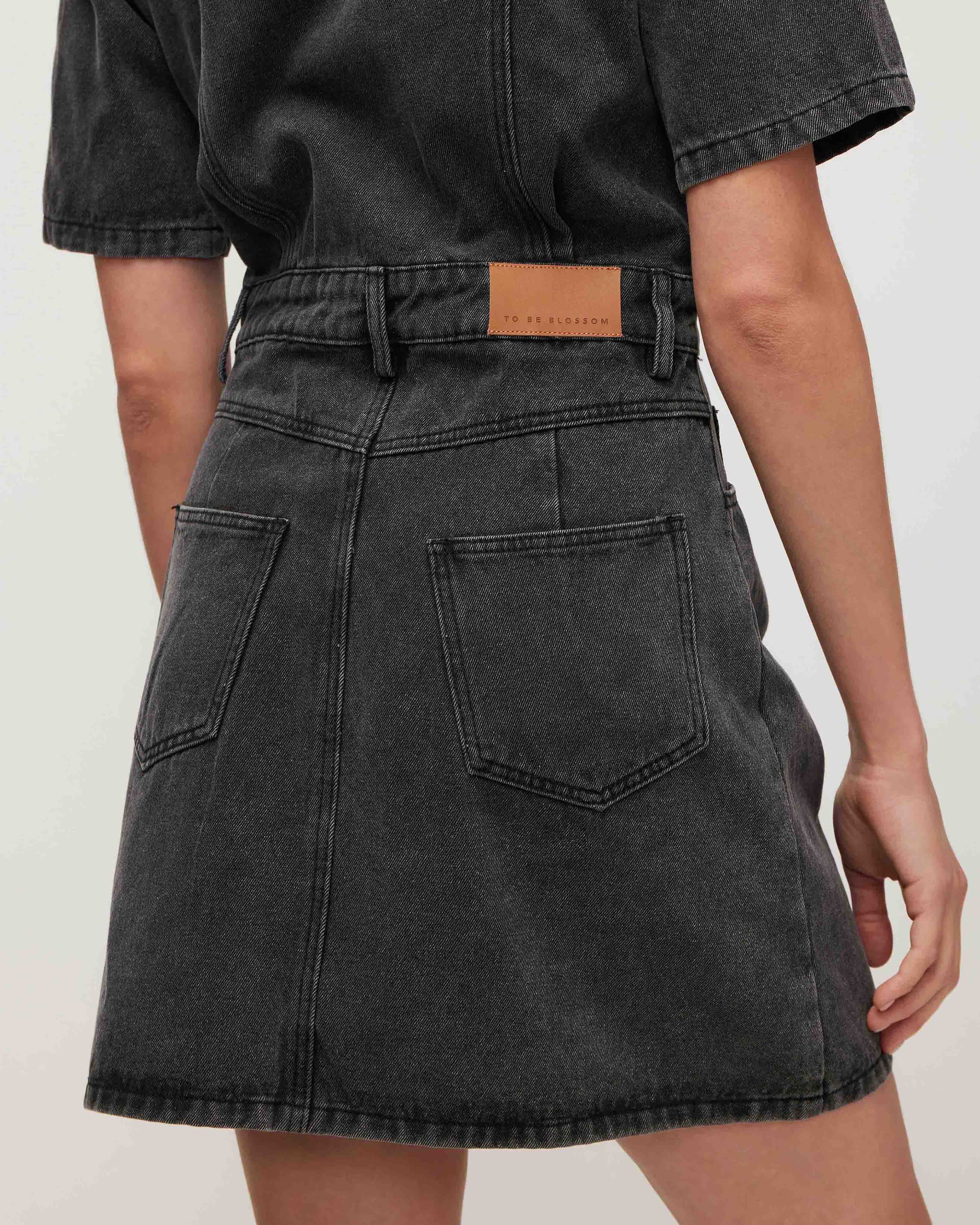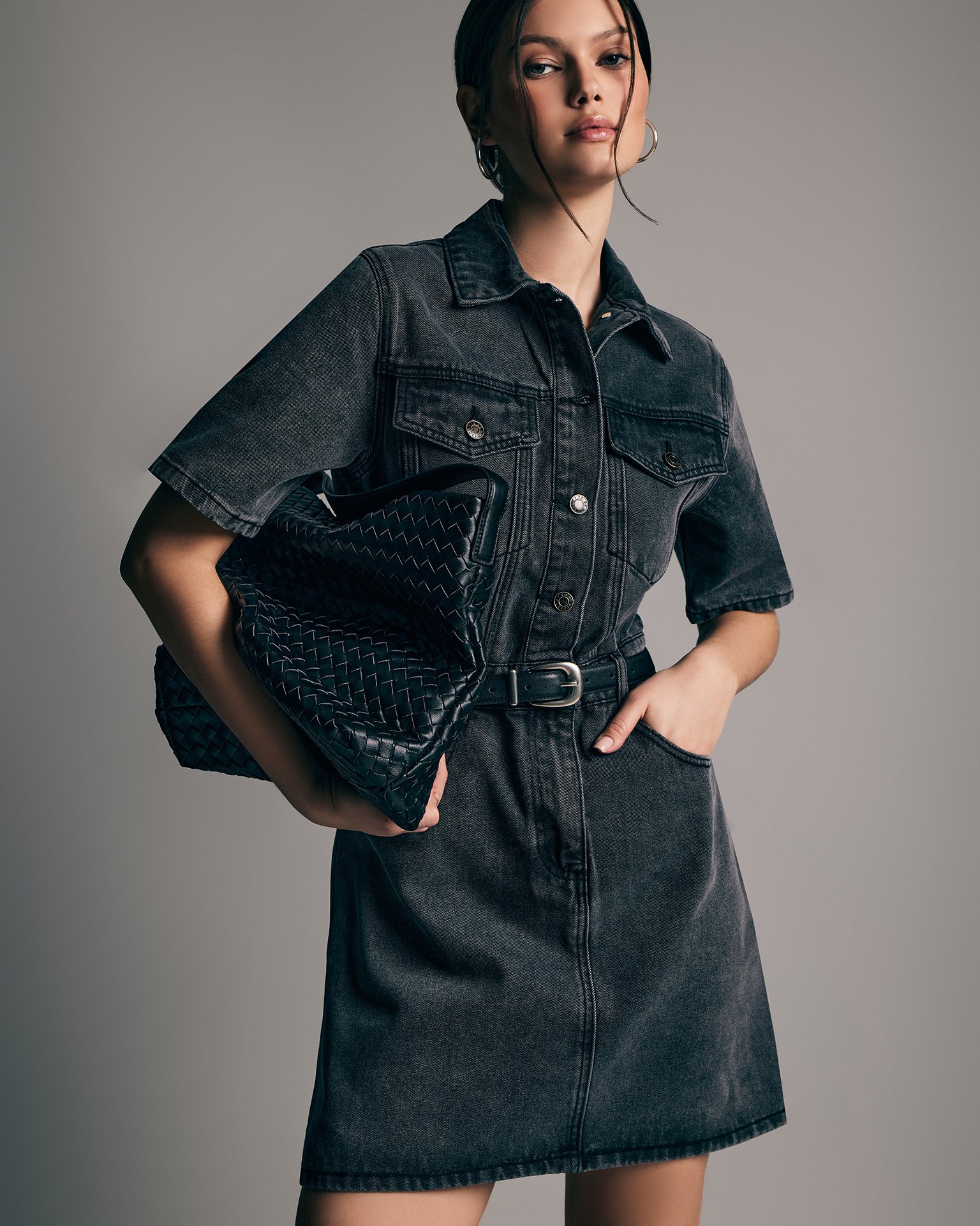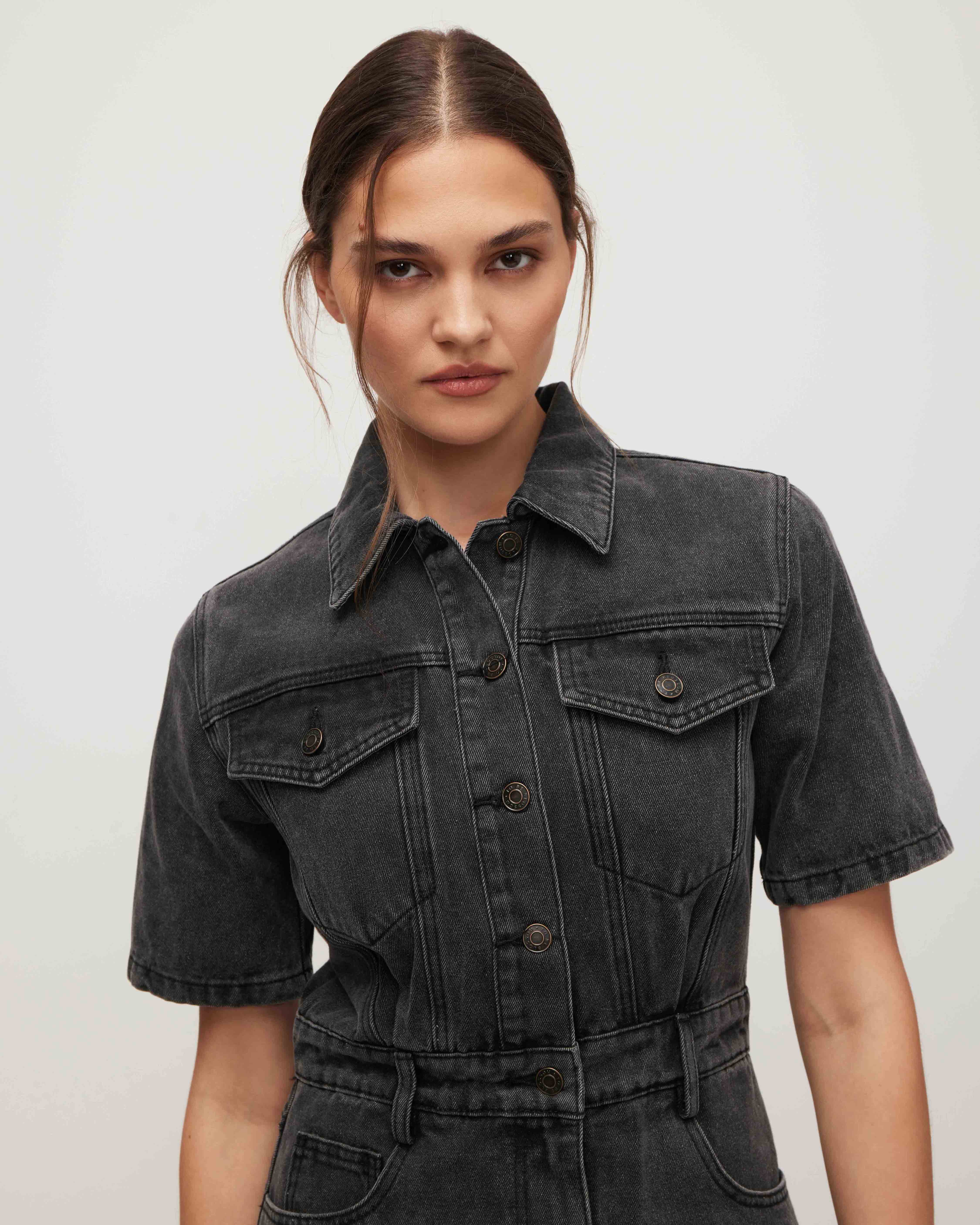 A fitted denim mini dress. It fastens with buttons, and a zip runs from the waist, concealed under a placket. A belt, belt loops, a turn-down collar, and two patch pockets with flaps on the chest add functional and stylish accents. Model's measurements: height 178 cm, bust 87 cm, waist 64 cm, hips 94 cm. Model wears size: S.