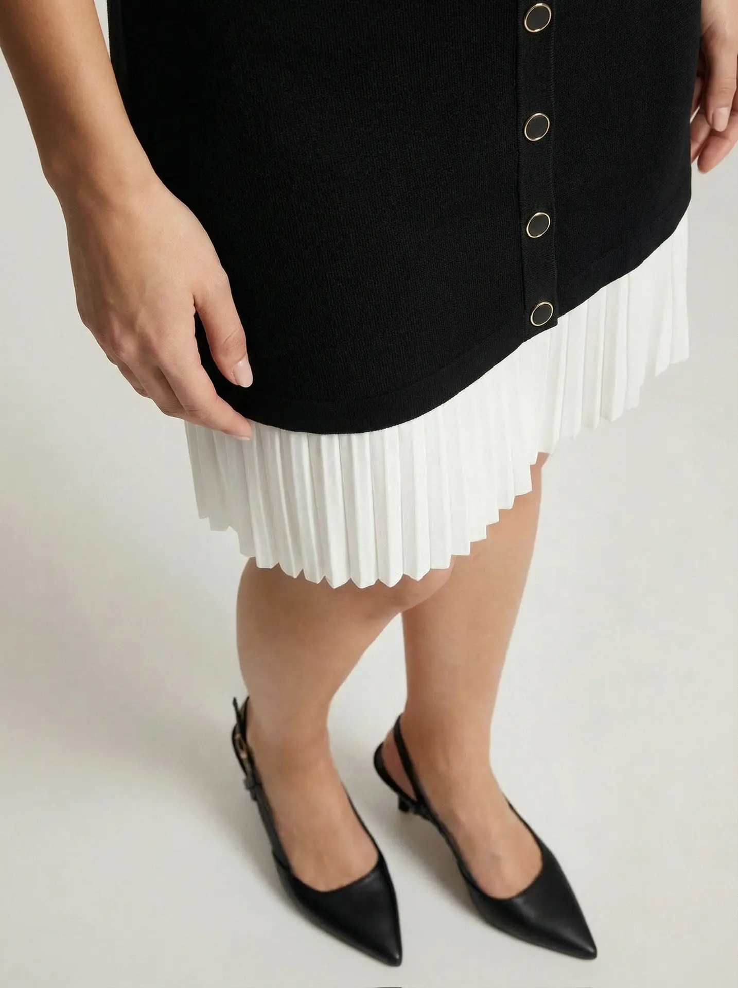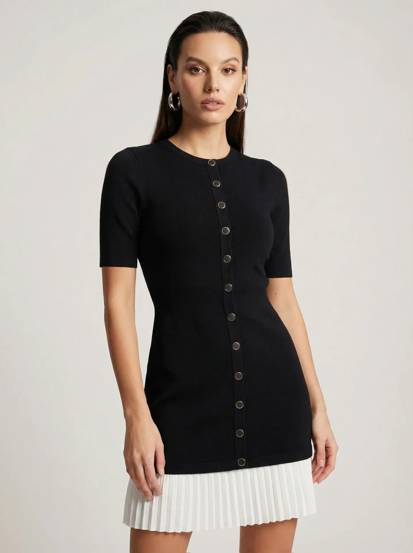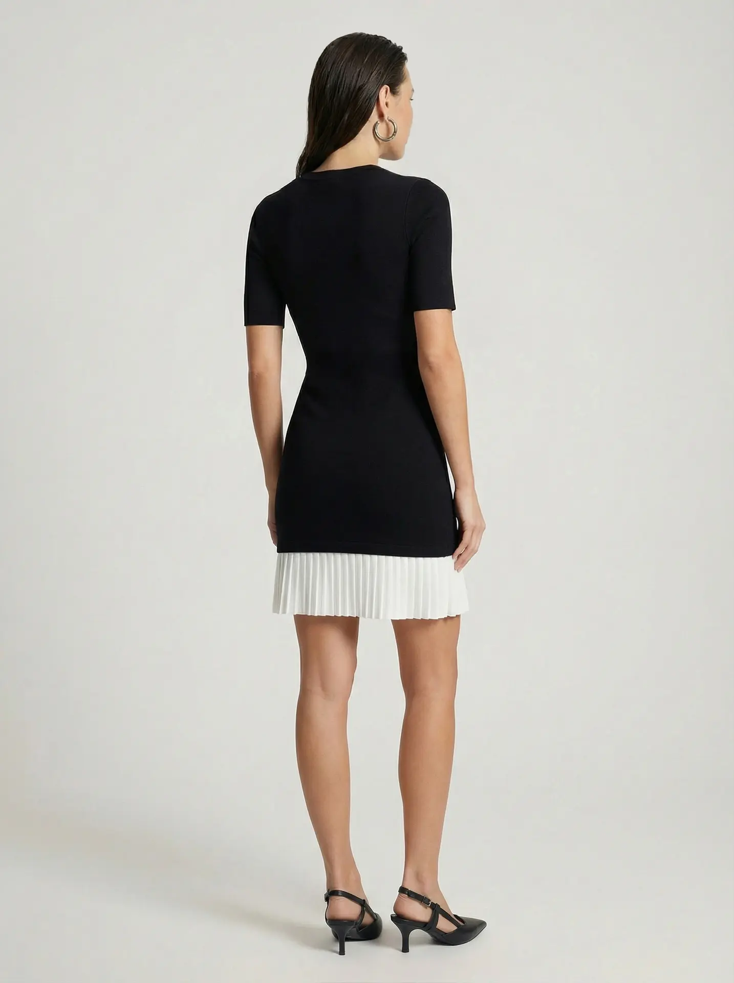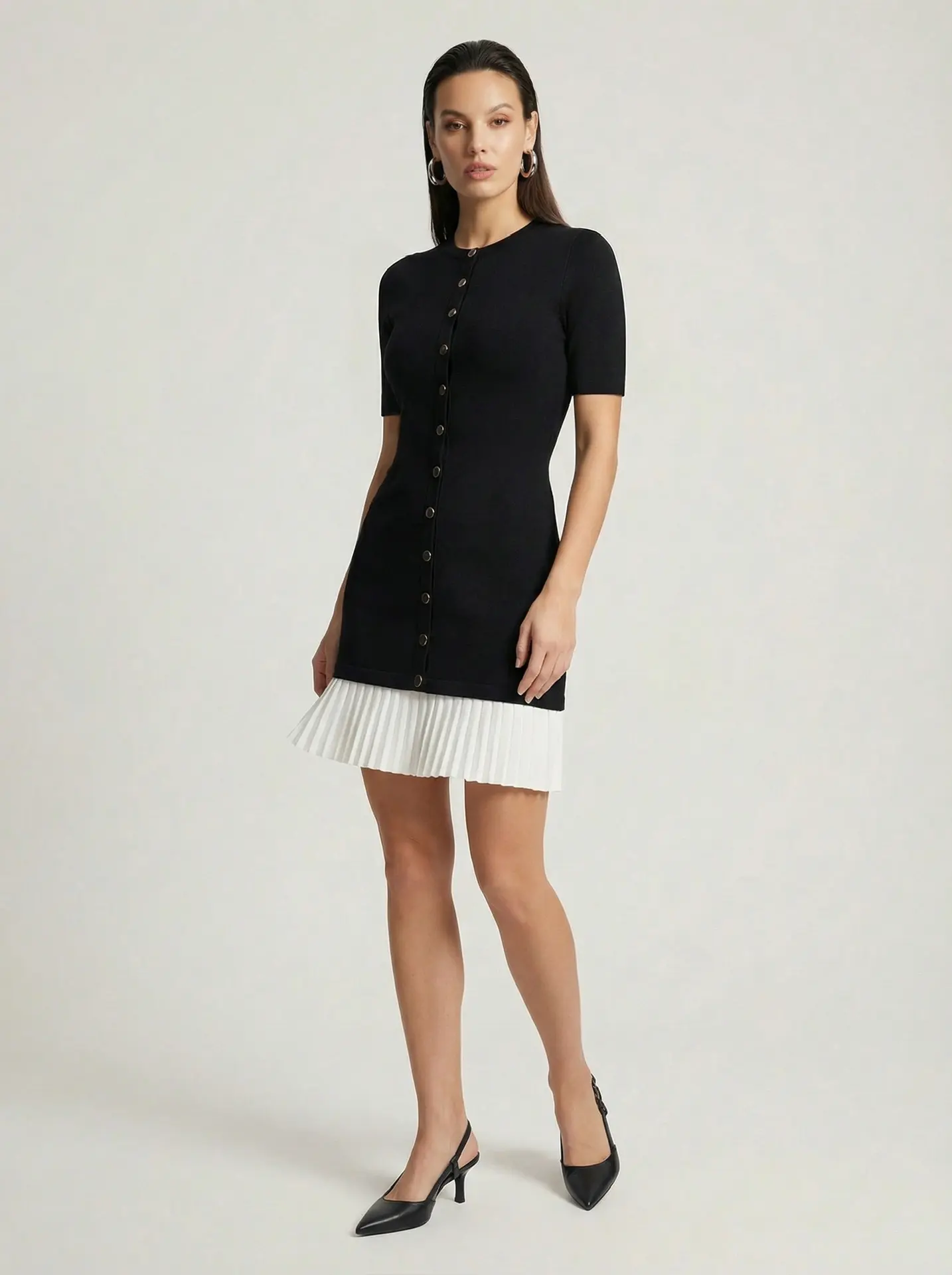 Это стильное чёрное платье привлекает внимание оригинальным дизайнерским решением — контрастной белой плиссированной полосой в нижней части. Такой элемент придаёт модели динамику и визуальную лёгкость, превращая классический фасон в модный и запоминающийся образ.Подходит для разных случаев — от повседневных образов до вечерних мероприятий. Можно комбинировать с праздничными аксессуарами, обувью на каблуке или лоферами для создания разных стилистических решений.