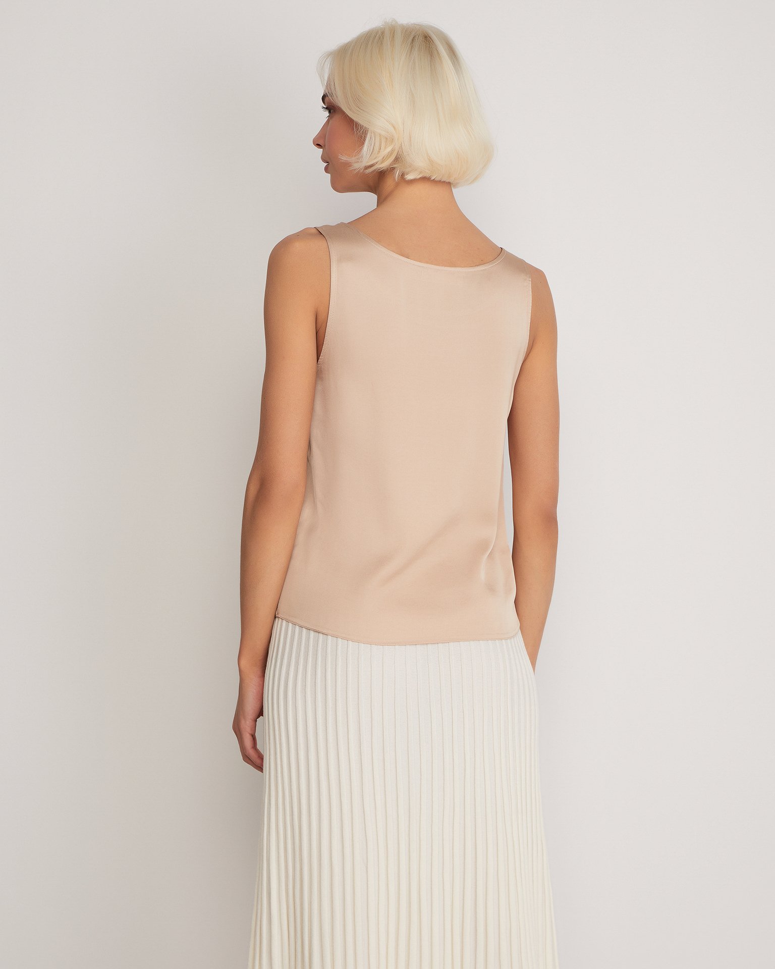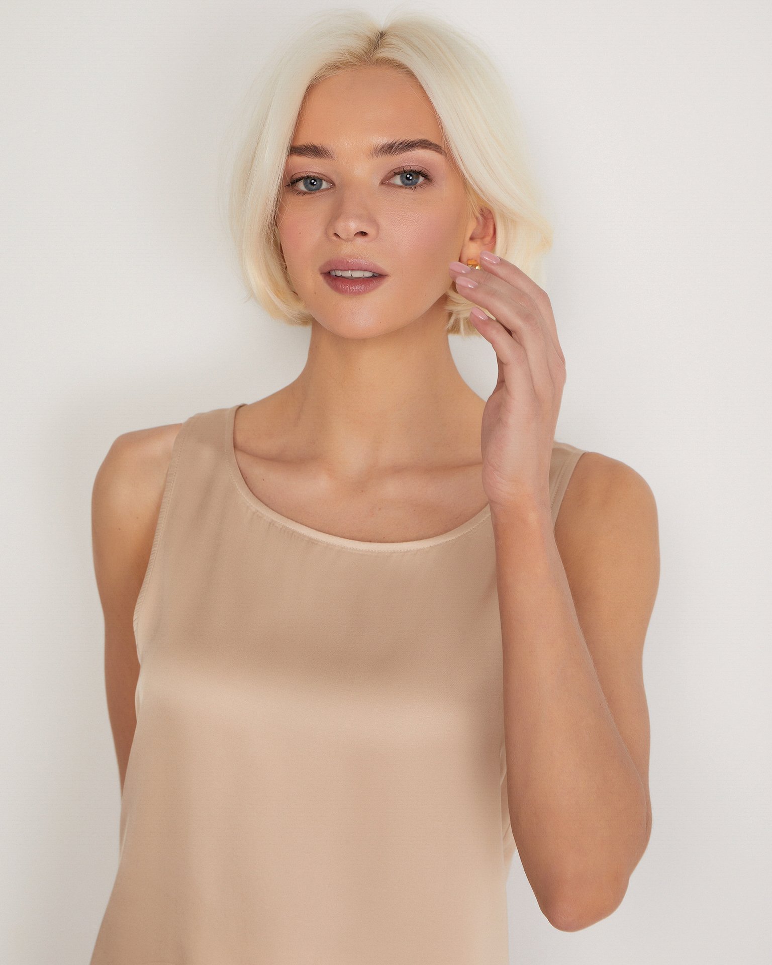 A lightweight silk sleeveless top. Its straight cut, shallow neckline, and wide straps make it a necessary element of a basic wardrobe. This viscose top can serve as the foundation for creating a vast number of summer looks, from sleek office styles to casual ones. Wear it with classic trousers or long, flowing skirts. In cooler weather, the top is ideal for wearing under a tailored blazer. Composition: 53% silk, 47% cotton Model's measurements: height 175 cm, bust 82 cm, waist 62 cm, hips 93 cm