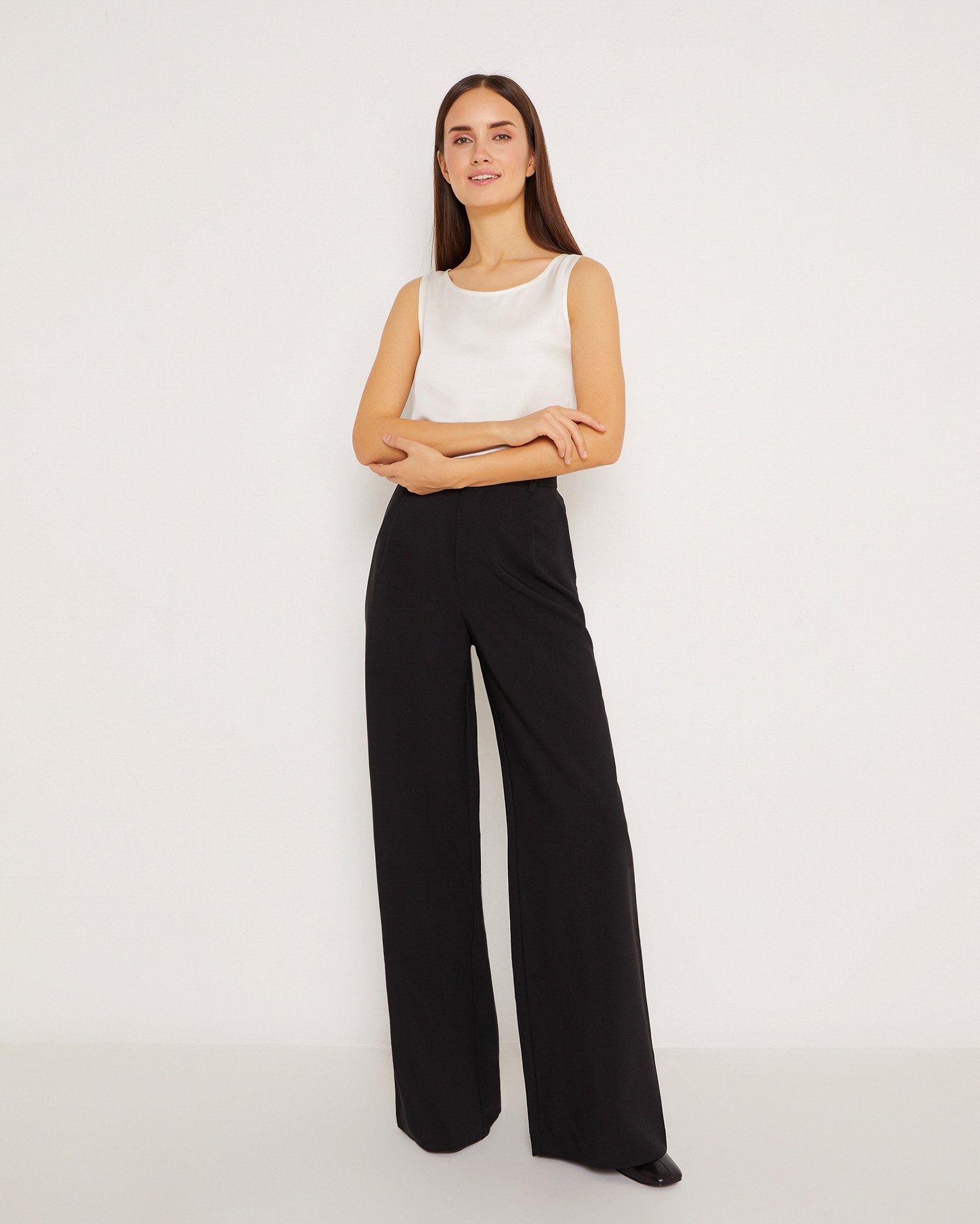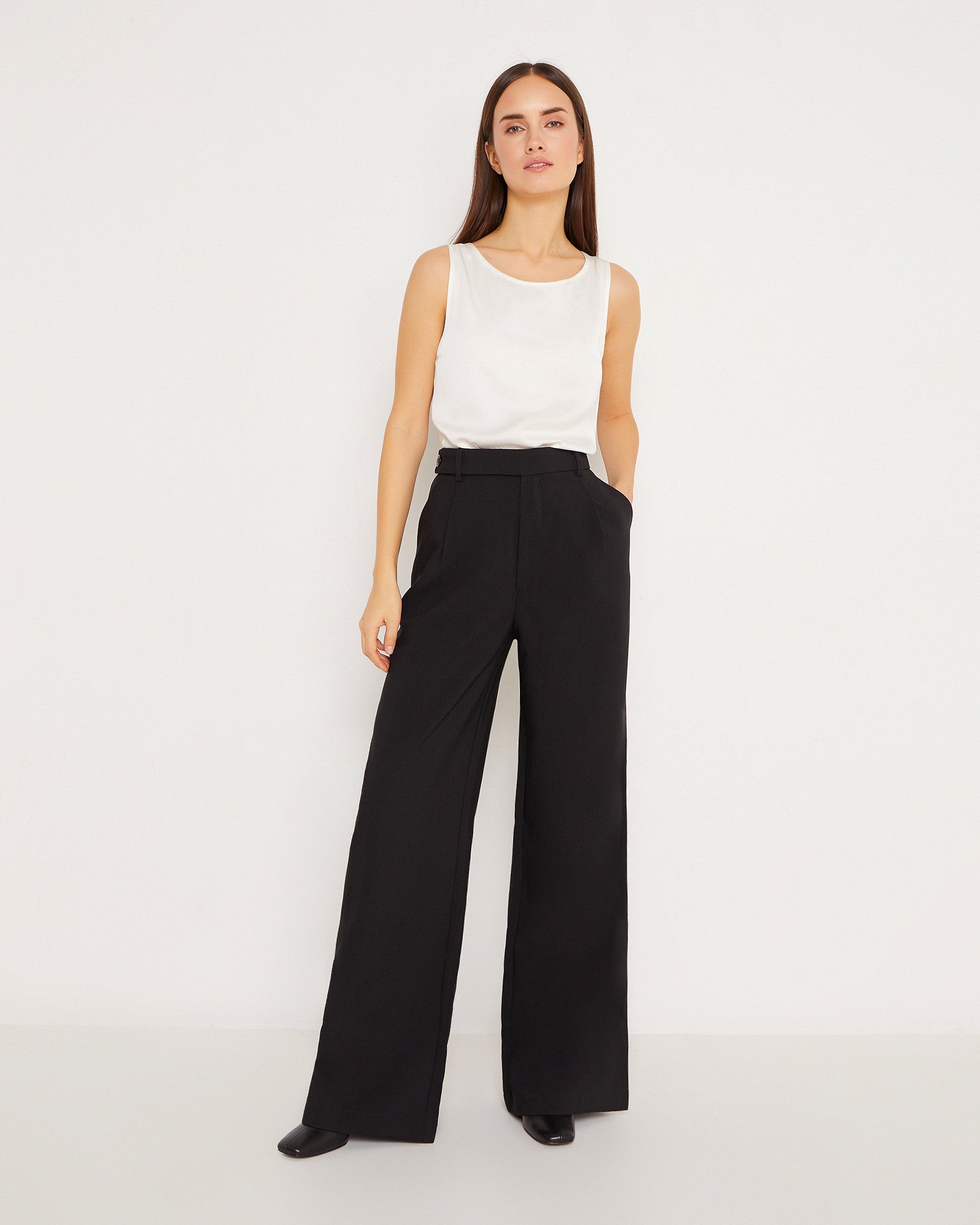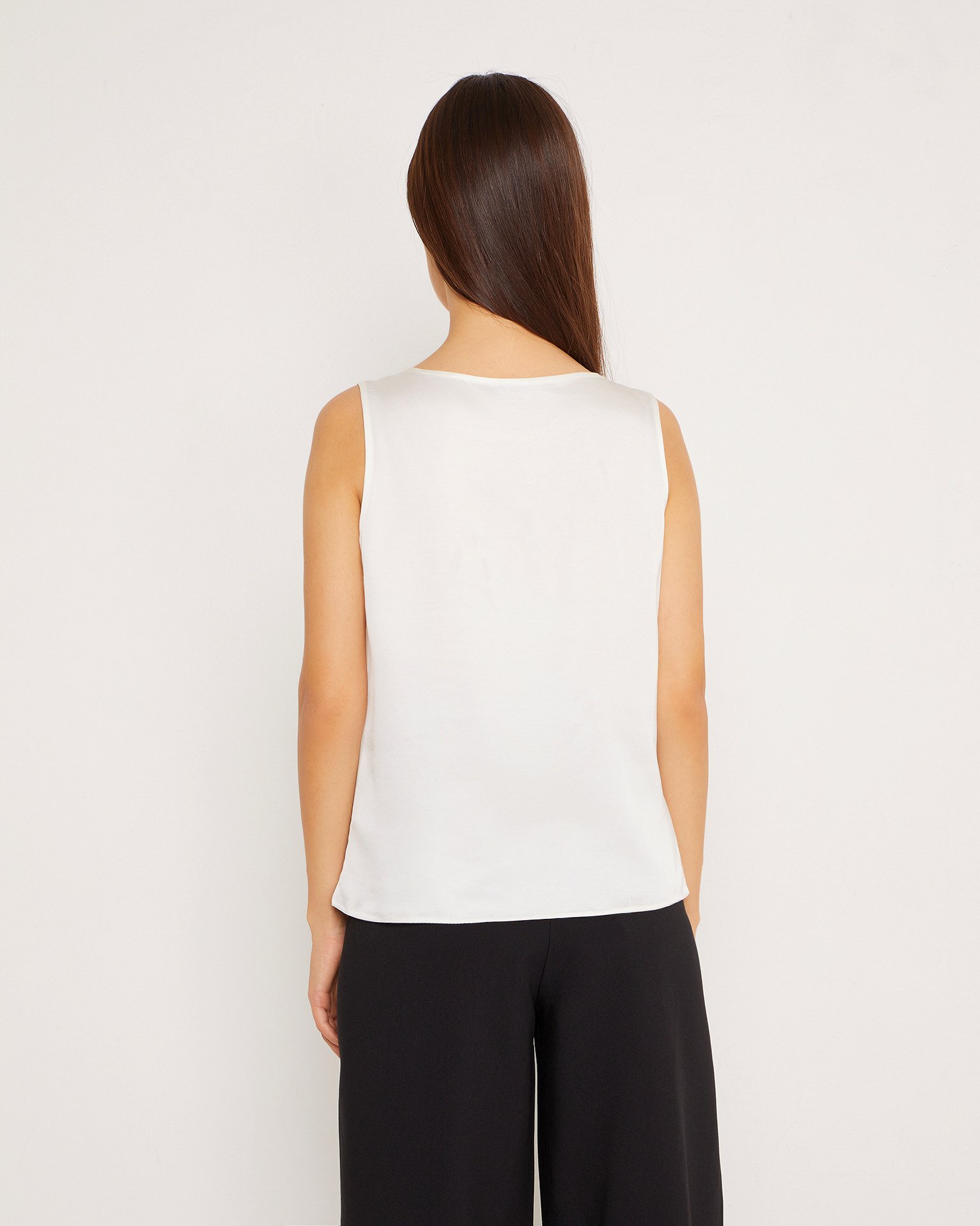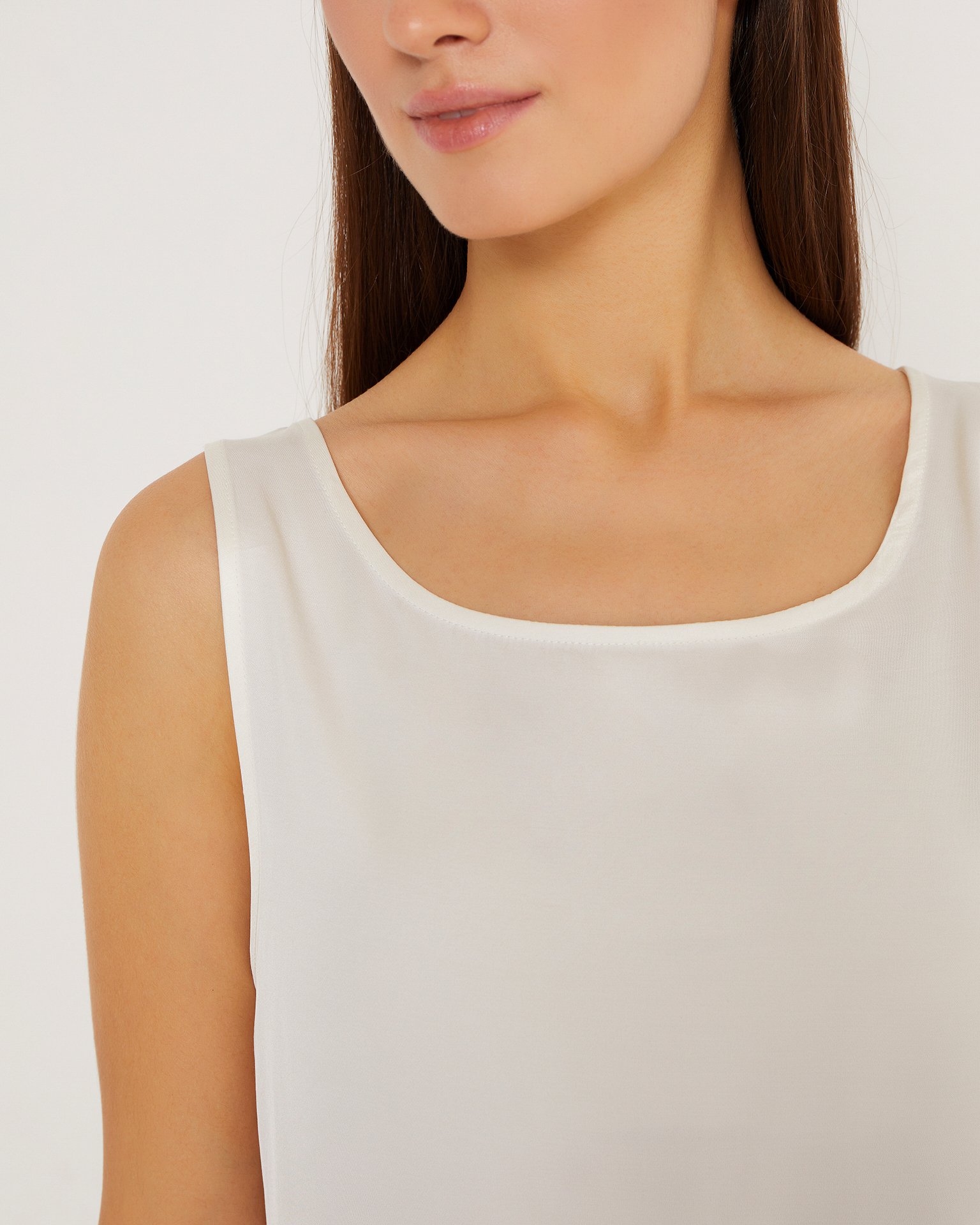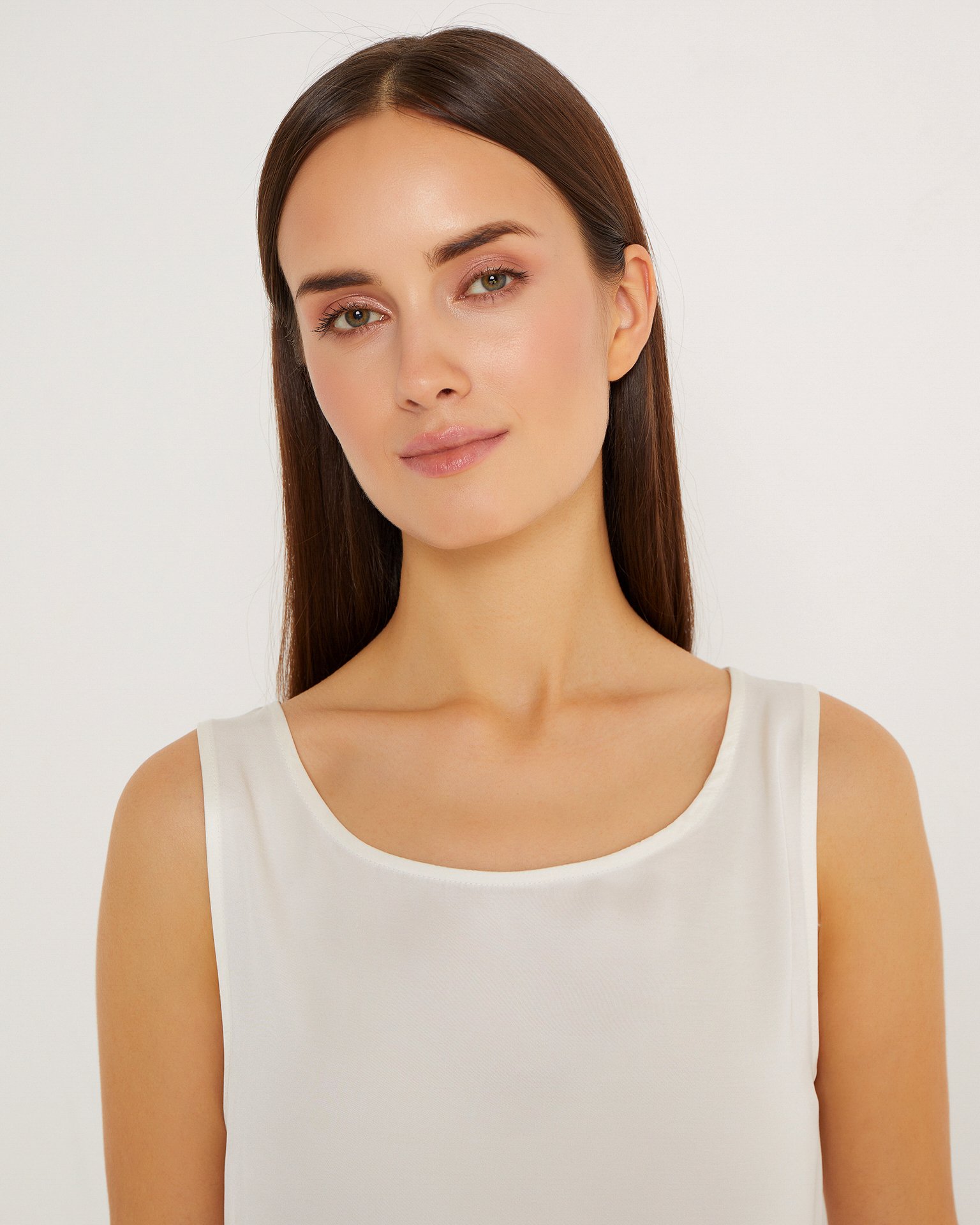 A lightweight, sleeveless silk top. Its straight cut, shallow neckline, and wide straps make it a necessary element of a basic wardrobe. The silk top can serve as a foundation for creating a vast number of summer outfits, from formal office wear to casual looks. Wear it with classic trousers or long, flowing skirts. During colder seasons, the top is ideal for wearing under a tailored blazer. Composition: 53% silk, 47% cotton Model's measurements: Height 170 cm, bust 79 cm, waist 59 cm, hips 88 cm