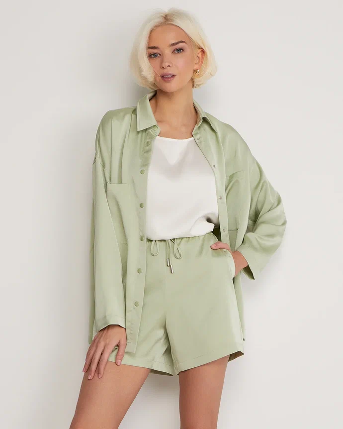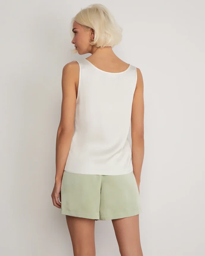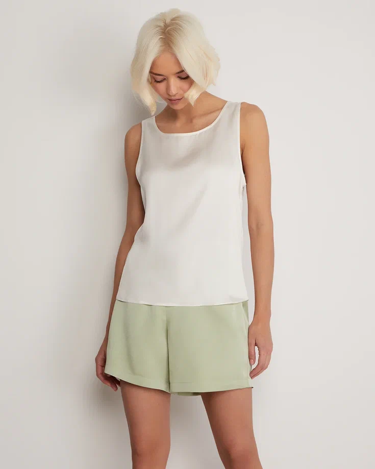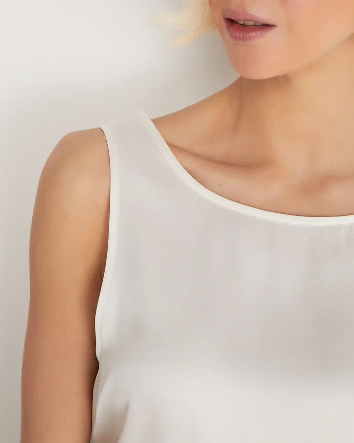 A lightweight, sleeveless silk top. Its straight cut, shallow neckline, and wide straps make it a necessary element of a basic wardrobe. The silk top can serve as a foundation for creating a vast number of summer outfits, from formal office wear to casual looks. Wear it with classic trousers or long, flowing skirts. During colder seasons, the top is ideal for wearing under a tailored blazer. Composition: 53% silk, 47% cotton Model's measurements: Height 175 cm, bust 82 cm, waist 62 cm, hips 93 cm