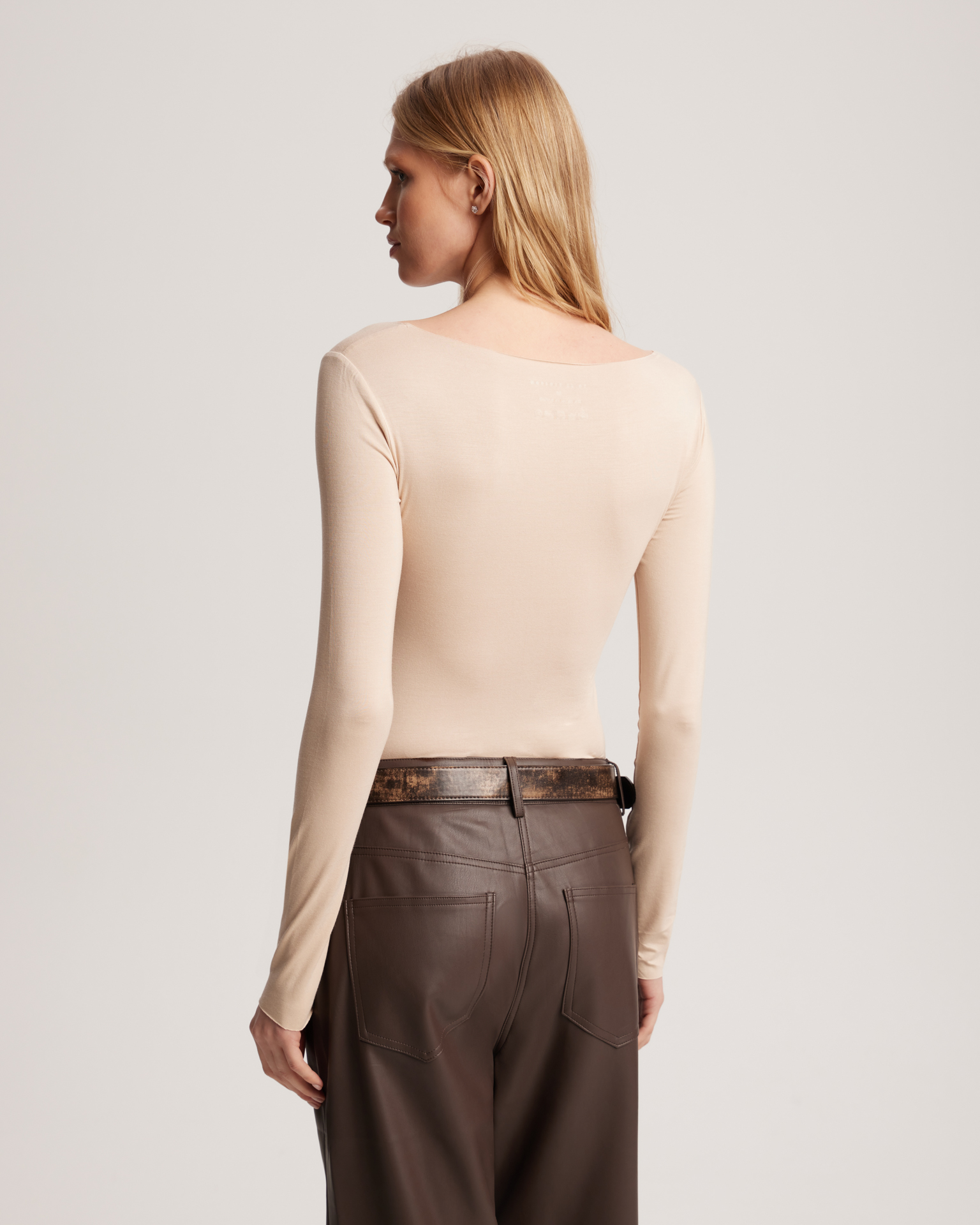 A long-sleeved top with a deep round neckline. A basic wardrobe staple for creating casual, sporty looks or for wearing in smart office outfits. Pair with skirts or jeans from our collection, or wear under a sweater or jumper as an extra layer. Composition: 95% viscose, 5% elastane Model's measurements: height 175 cm, bust 87 cm, waist 64 cm, hips 92 cm Model wears size: S