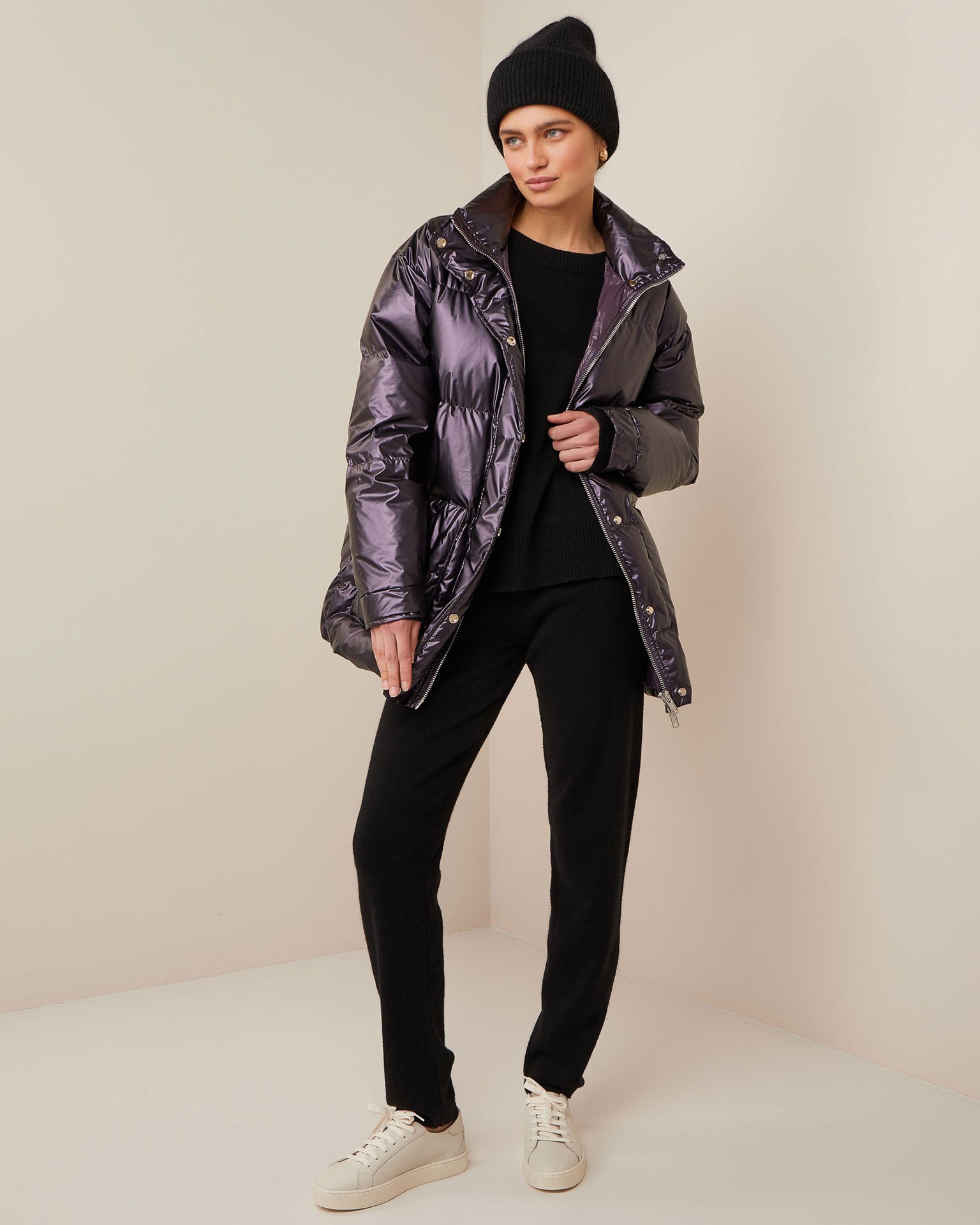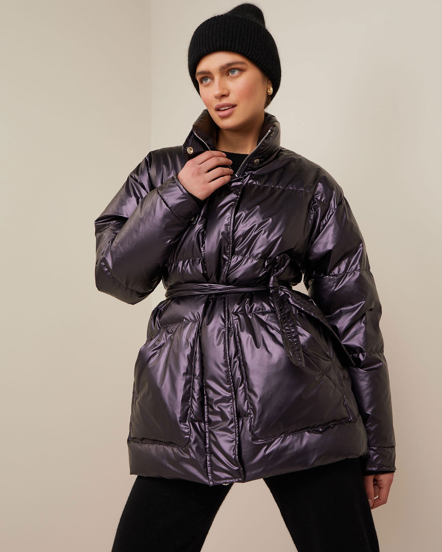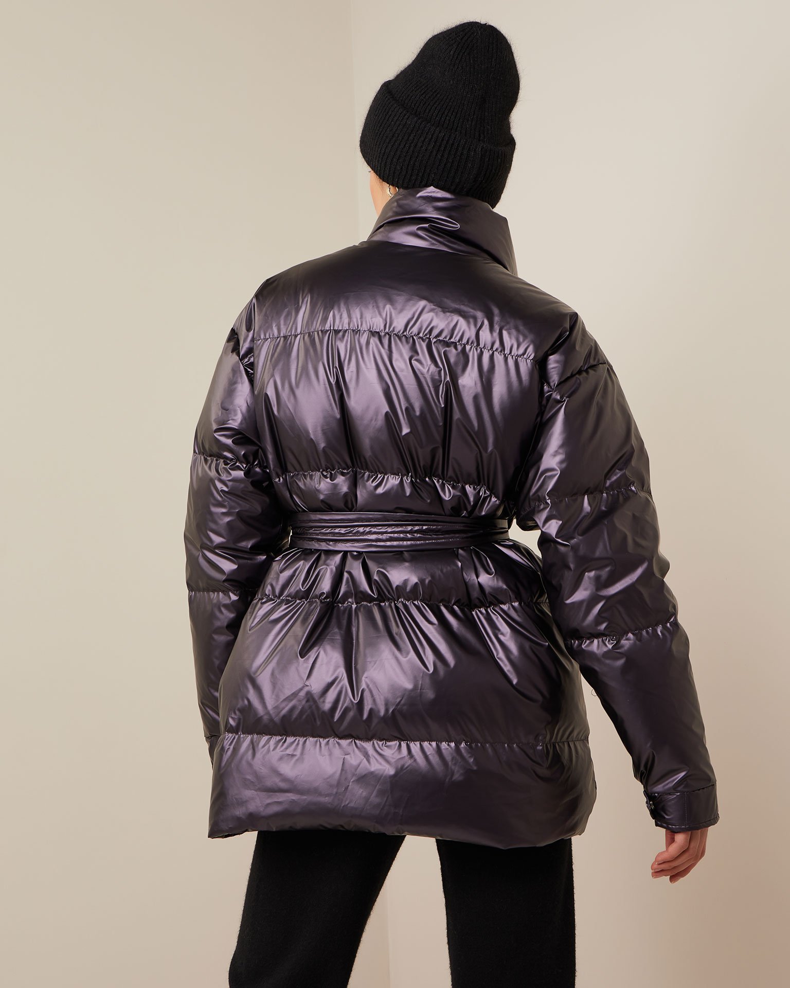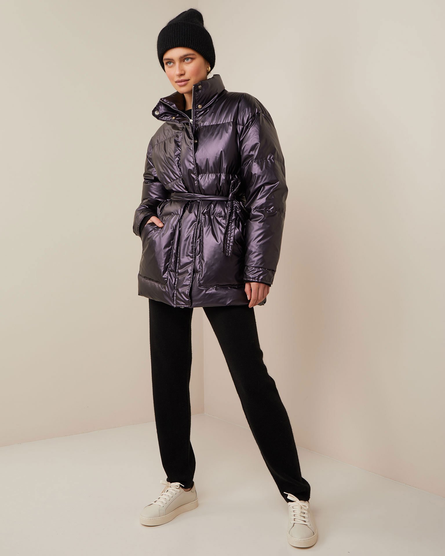 A mid-length A-line down jacket with a waist belt. Features a zip fastening concealed under a placket and two deep patch pockets. Filled with natural down insulation and crafted from a metallic-effect fabric. The piece is fully quilted. An aubergine hue with a glossy, radiant effect—a fresh alternative to conventional, sombre outerwear. Composition: 100% polyester, filling: 90% down, 10% feather Model's measurements: Height 176 cm, bust 84 cm, waist 60 cm, hips 90 cm.