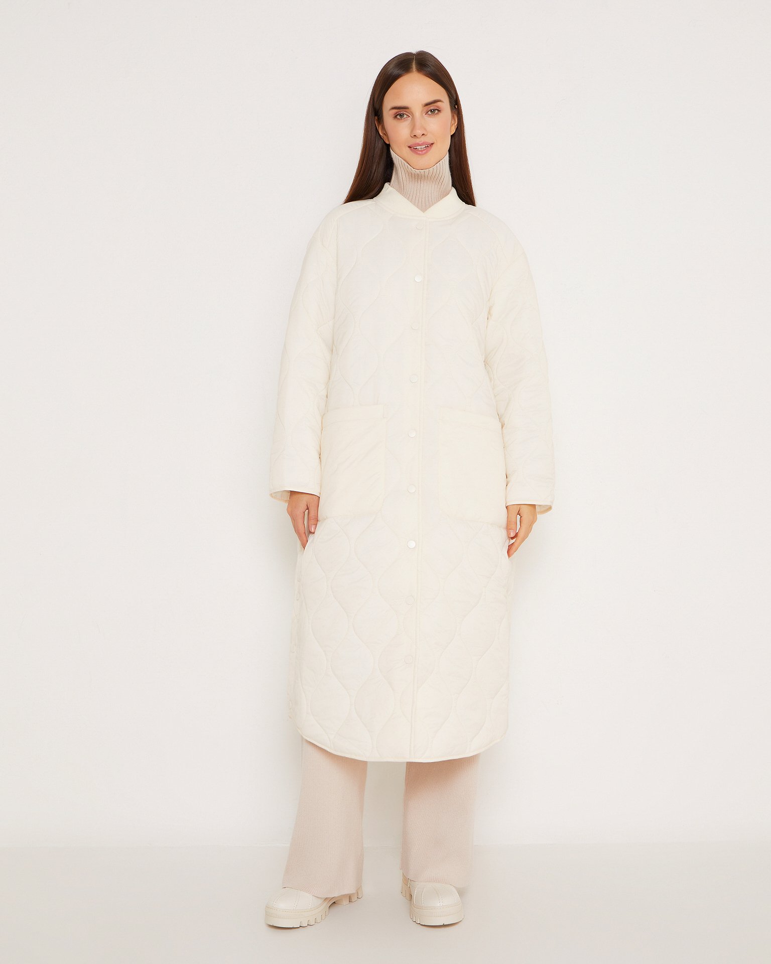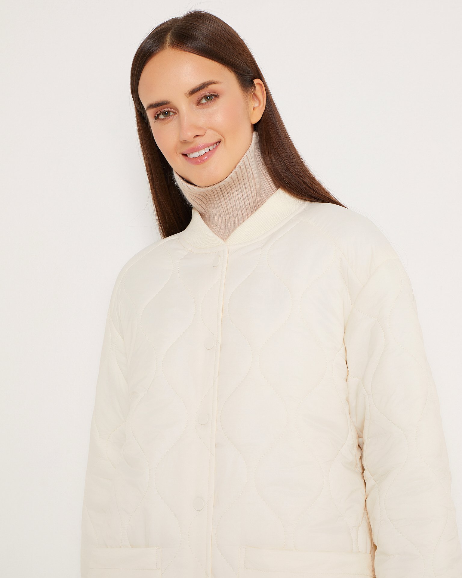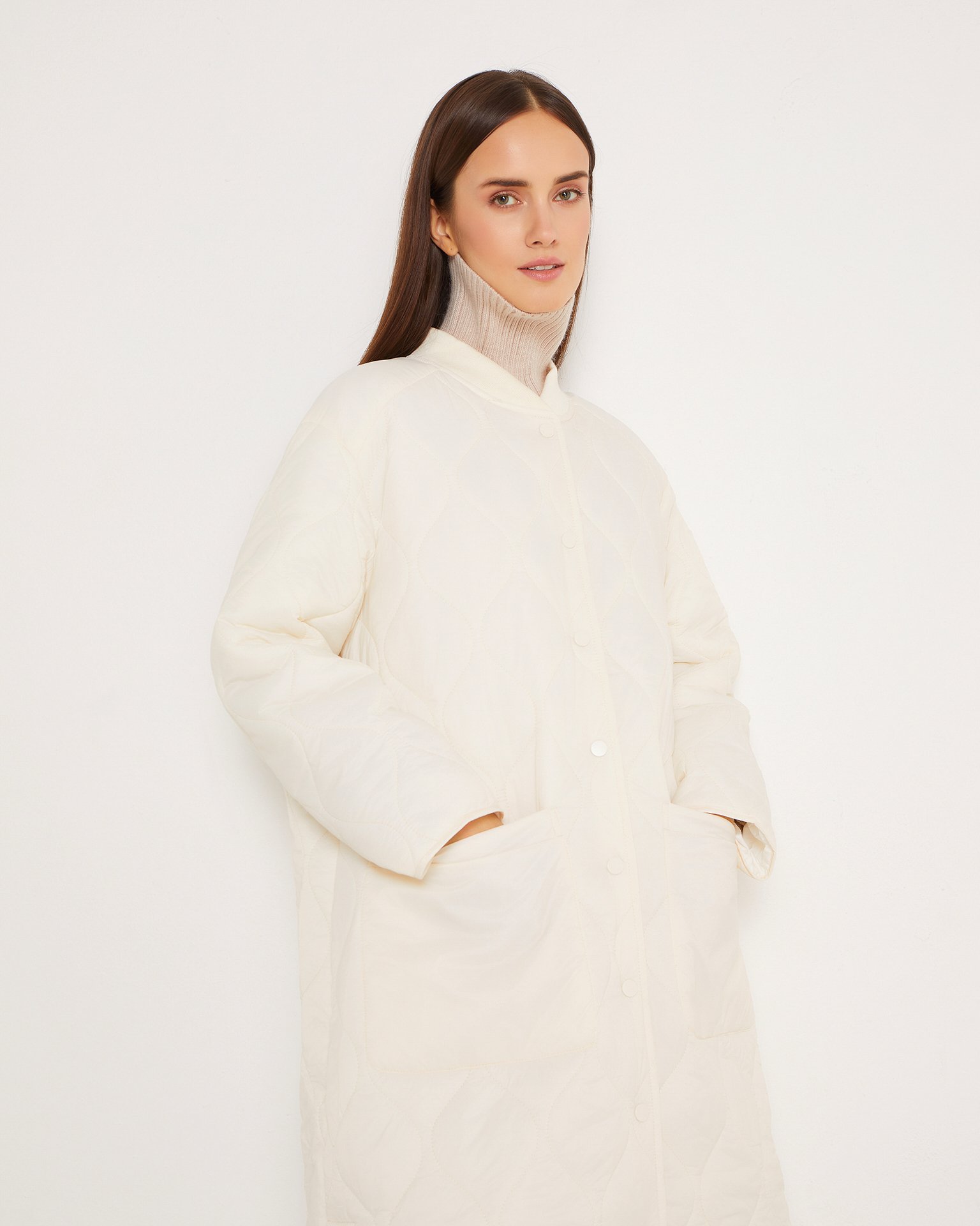 A quilted coat with two patch pockets at the sides, raglan sleeves, and a stand-up collar. Fastens with snap buttons. This coat is one of the season's trends. Lightweight, comfortable, and practical, it will become your favourite wardrobe item. Pair with trainers, low-heeled boots, or chunky boots. Composition: 100% polyamide, lining: 100% polyester Model's measurements: height 170 cm, bust 79 cm, waist 59 cm, hips 88 cm