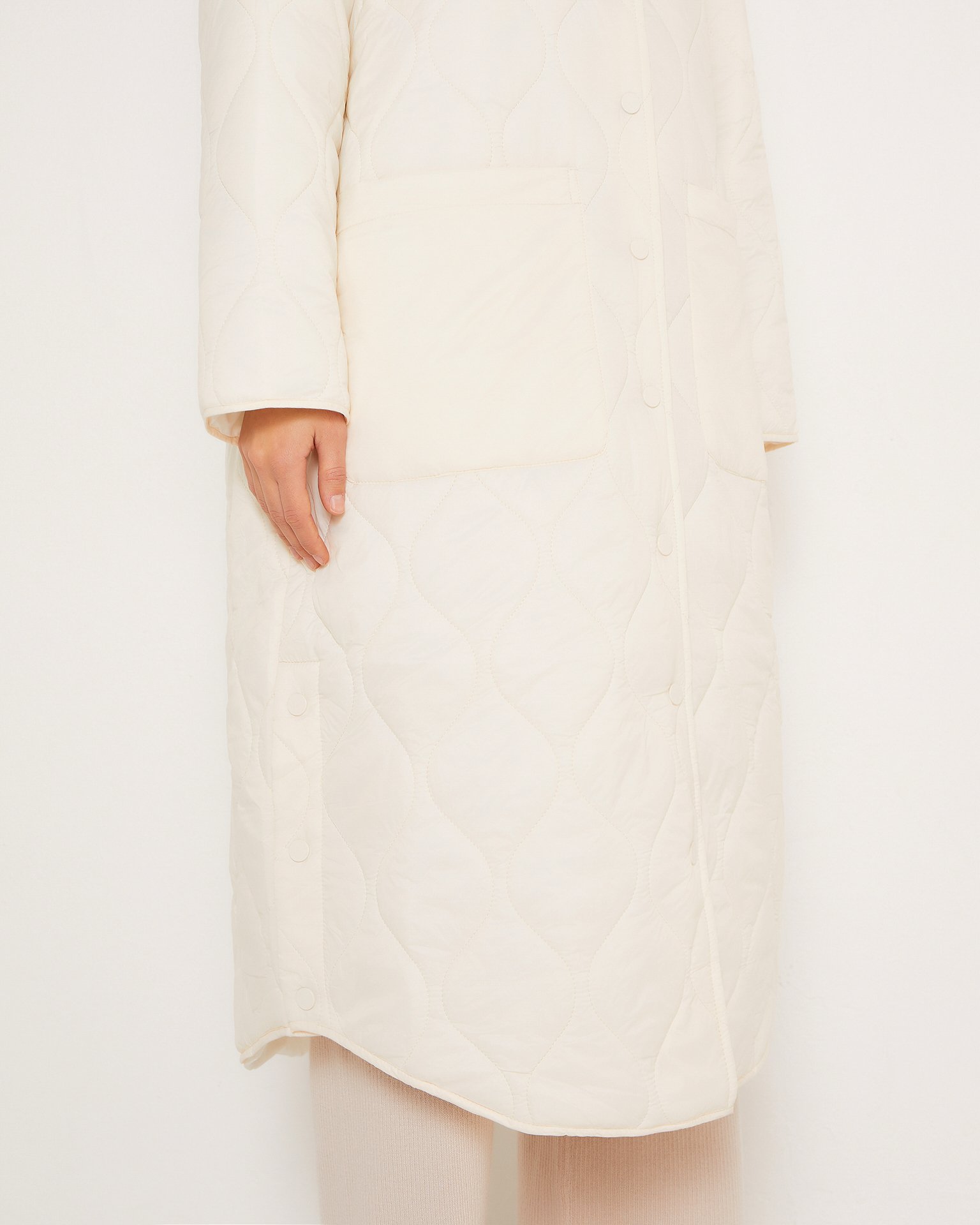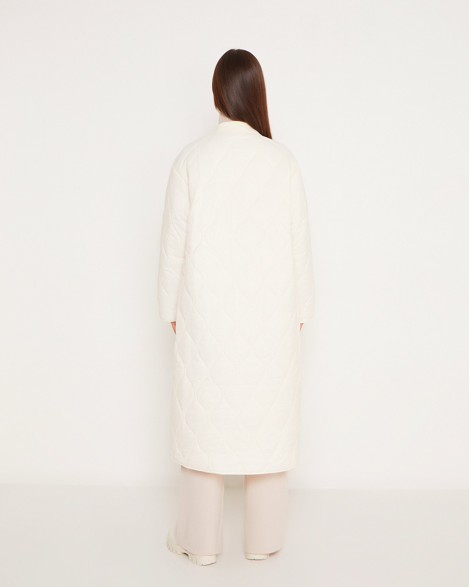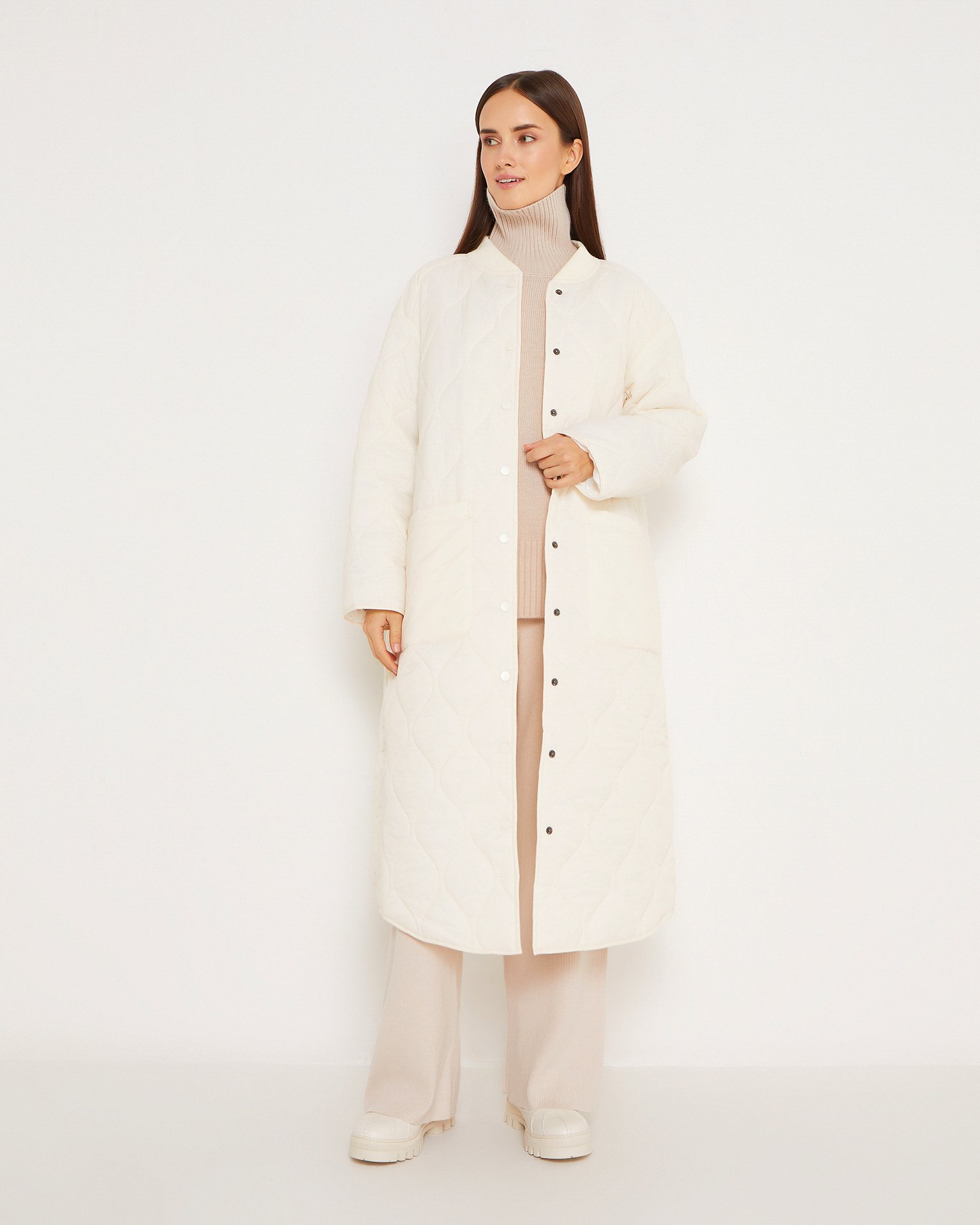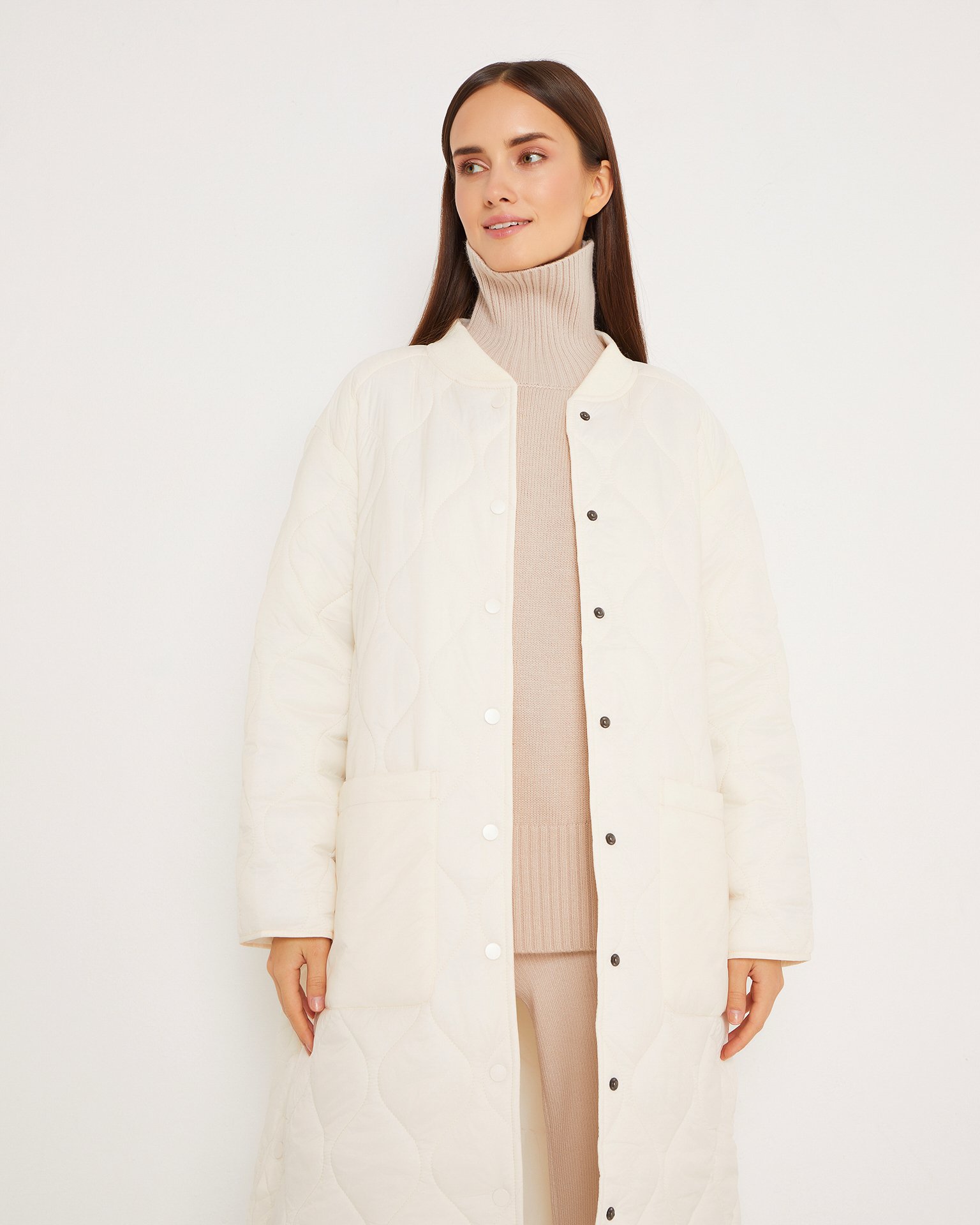 A quilted coat with two patch pockets at the sides, raglan sleeves, and a stand-up collar. Fastens with snap buttons. This coat is one of the season's trends. Lightweight, comfortable, and practical, it will become your favourite wardrobe item. Pair with trainers, low-heeled boots, or chunky boots. Composition: 100% polyamide, lining: 100% polyester Model's measurements: height 170 cm, bust 79 cm, waist 59 cm, hips 88 cm