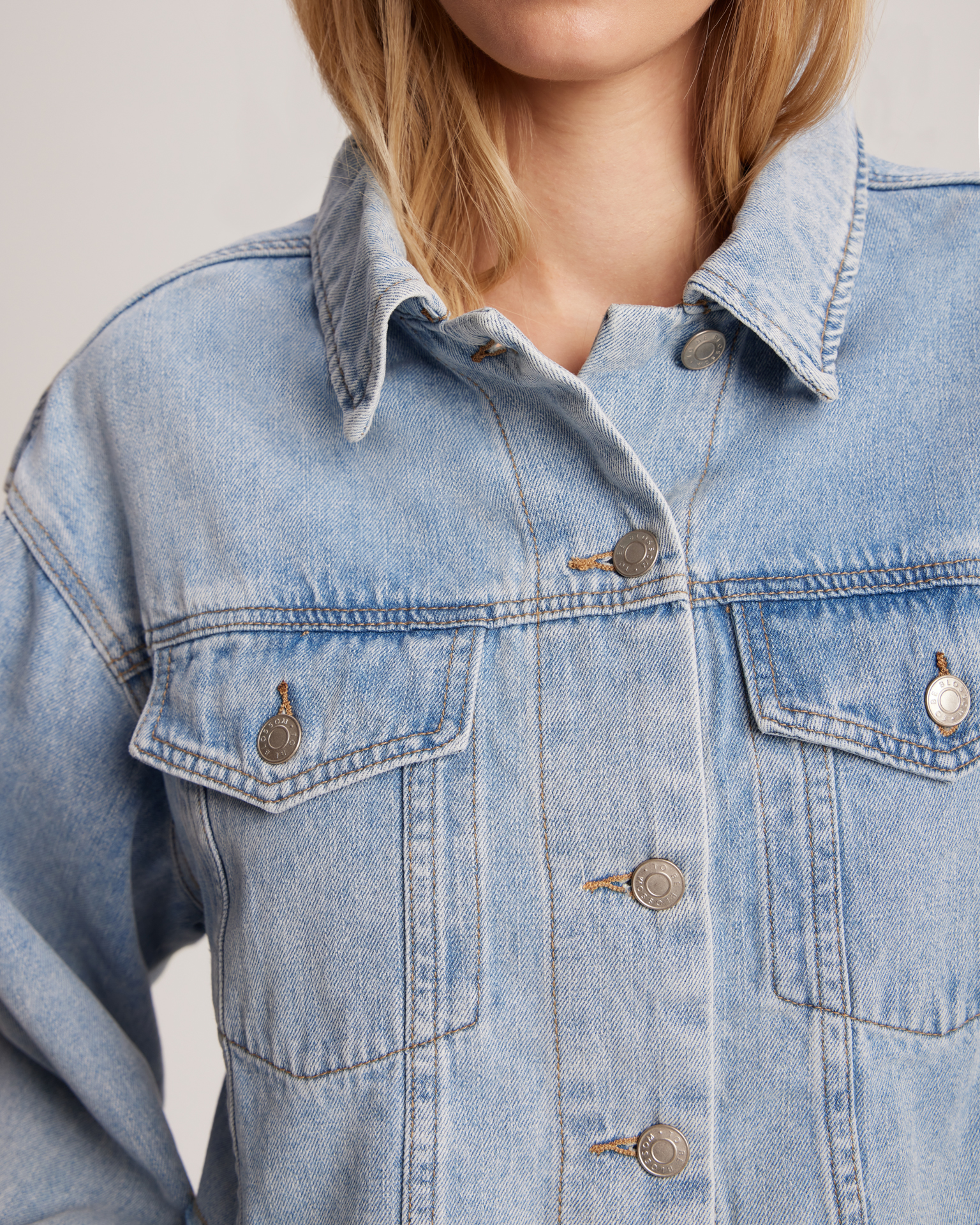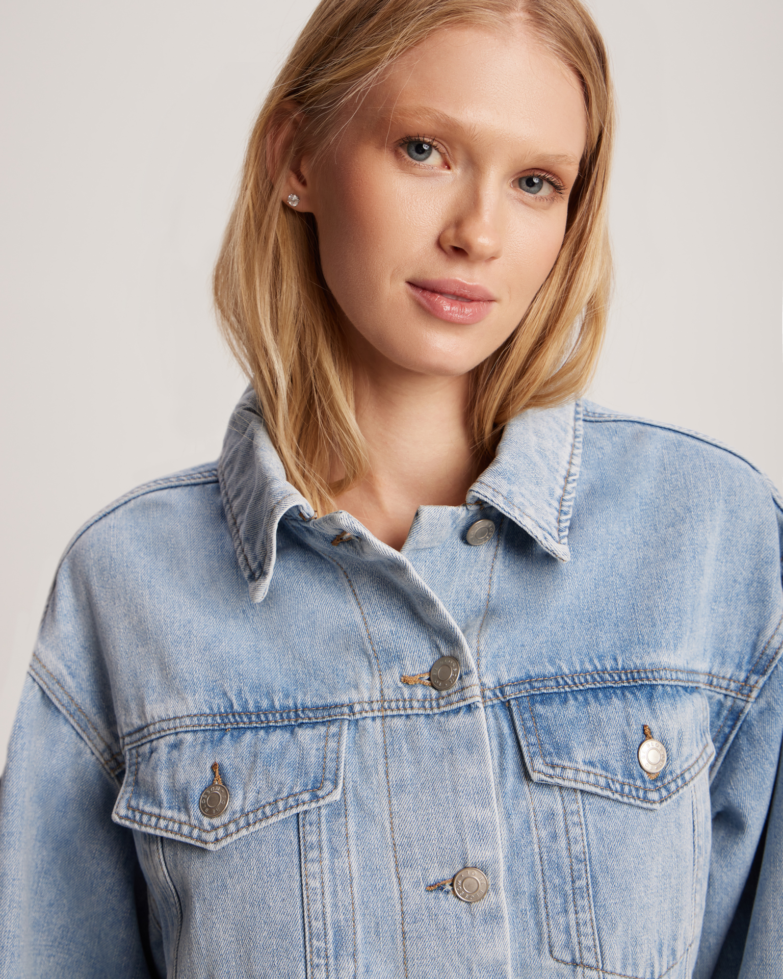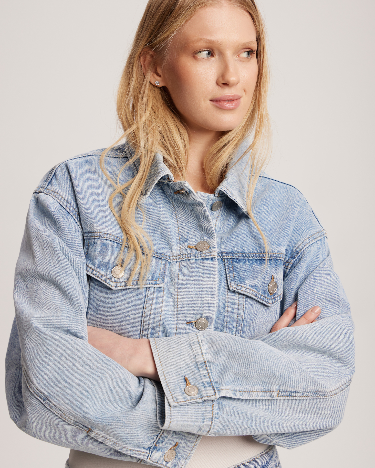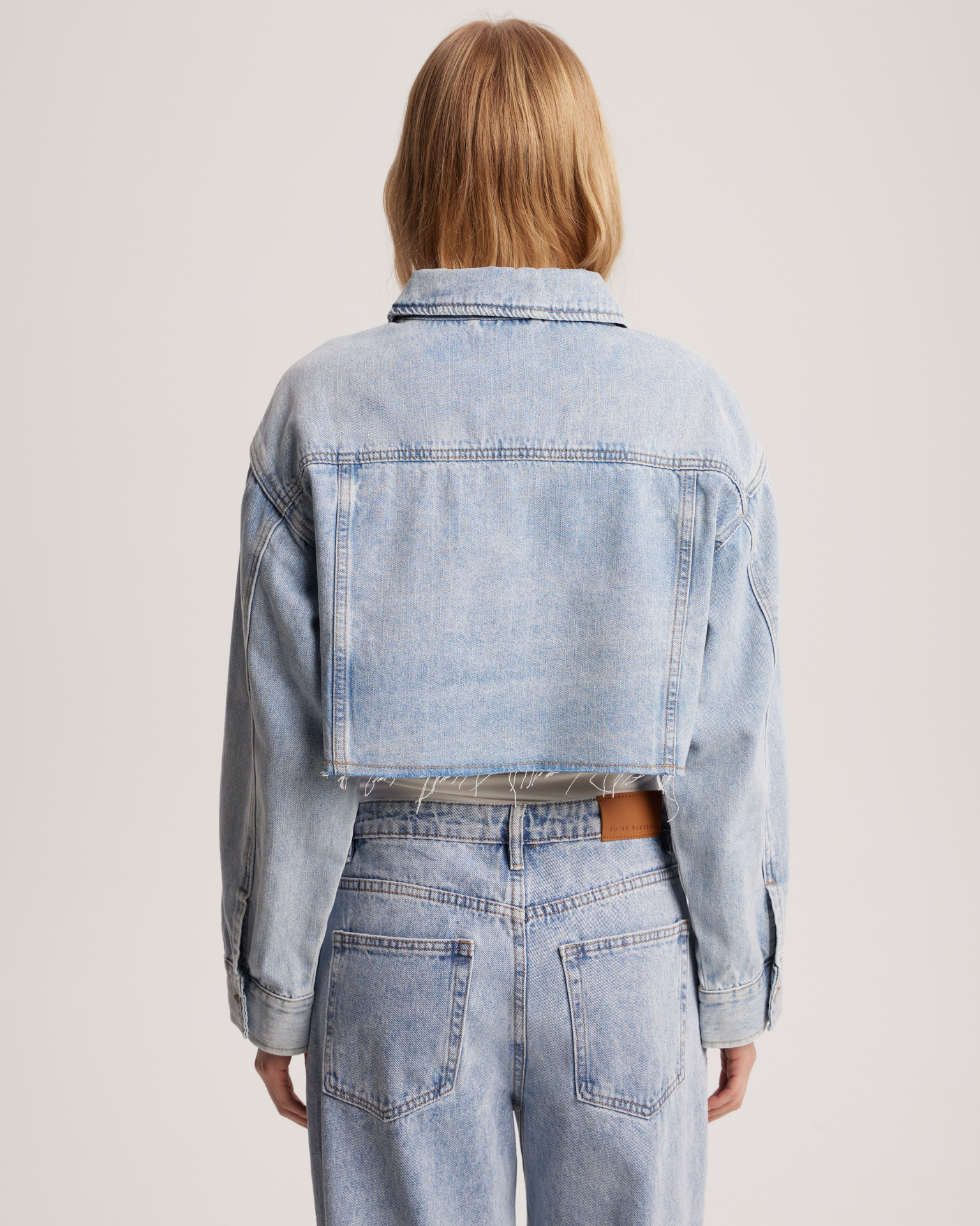 Cropped denim jacket with a dropped shoulder line, notch lapel collar, and raw hem. Team with high-waisted pieces for a pared-back outfit, or pair with low-rise trousers and jeans for a trendy Y2K-inspired look. Model's measurements: height 175 cm, bust 82 cm, waist 62 cm, hips 93 cm. Model wears size: XS/S.