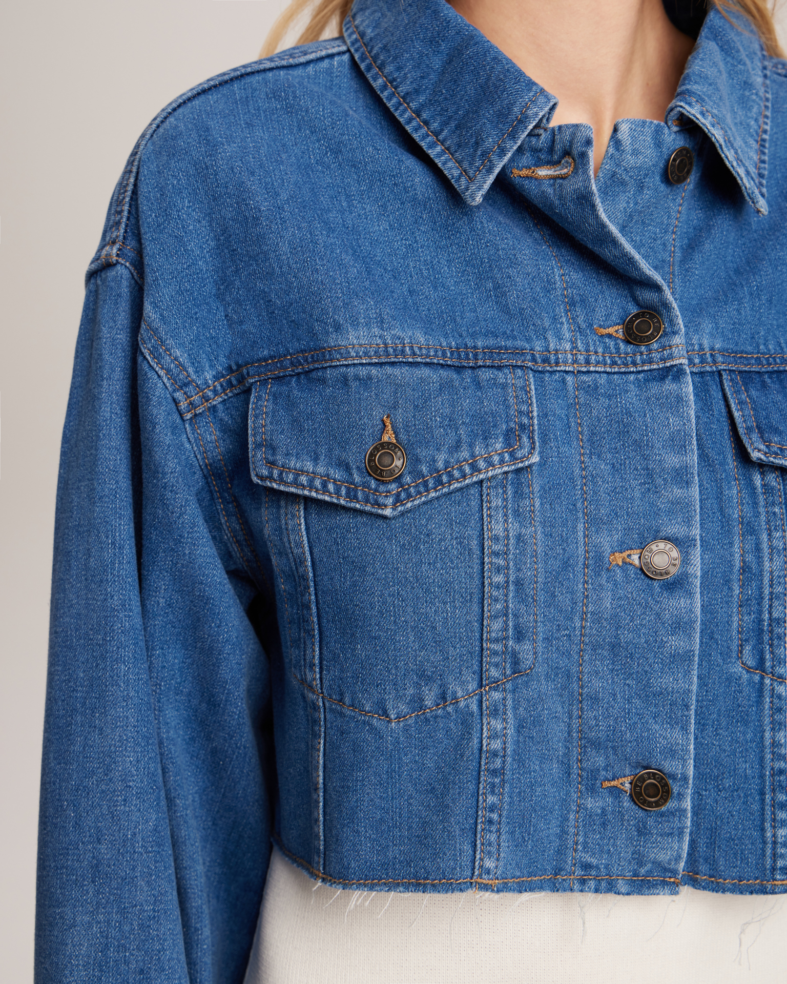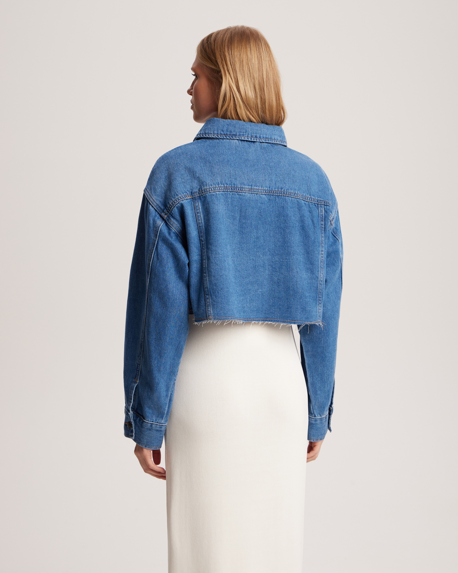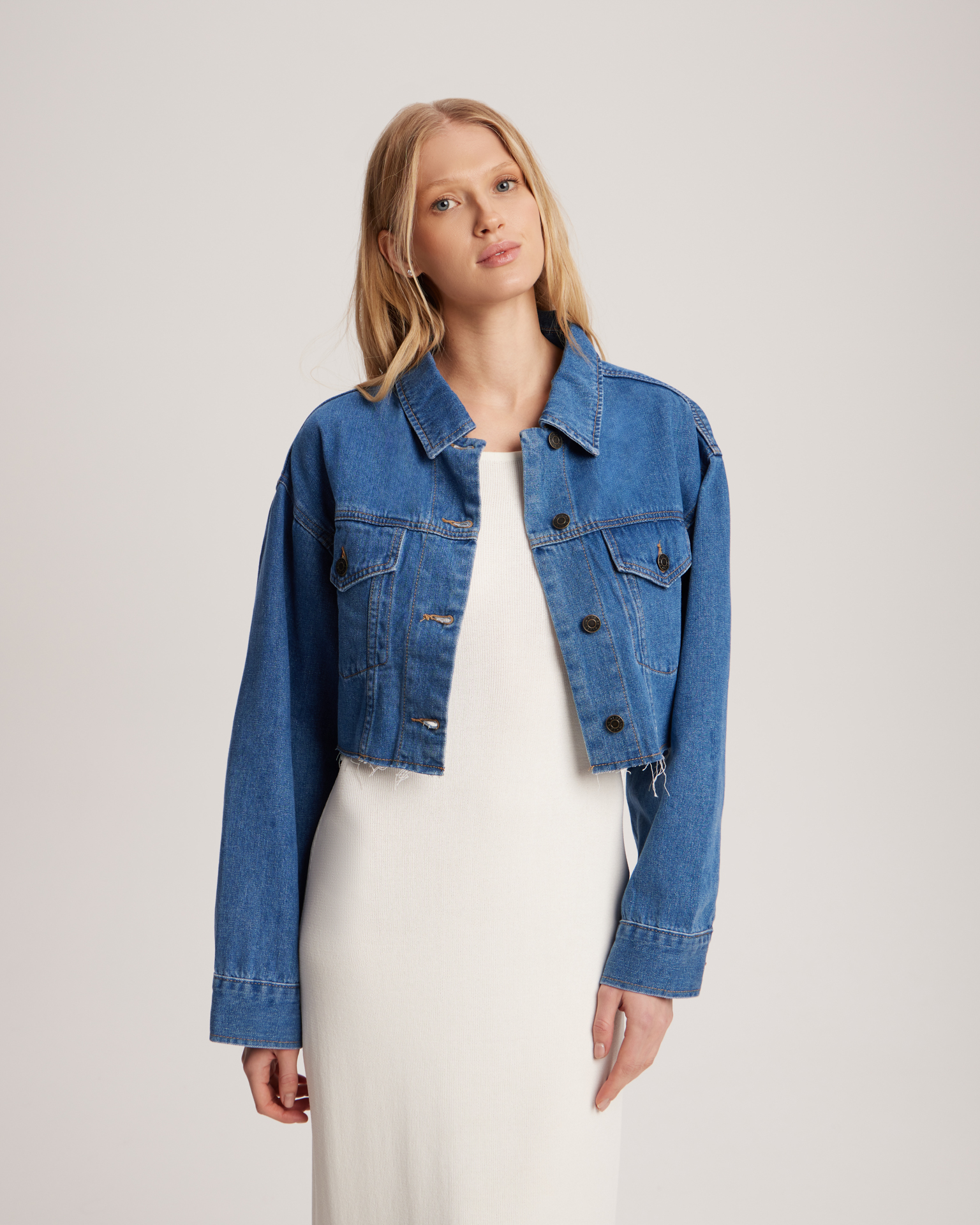 A cropped denim jacket with a dropped shoulder line, a pointed collar, and raw-cut edges. Wear it with high-waisted styles for a refined outfit, or pair it with low-rise trousers and jeans to create a trendy look reminiscent of the noughties. Model's measurements: height 175 cm, bust 82 cm, waist 62 cm, hips 93 cm. Model wears size: XS/S.