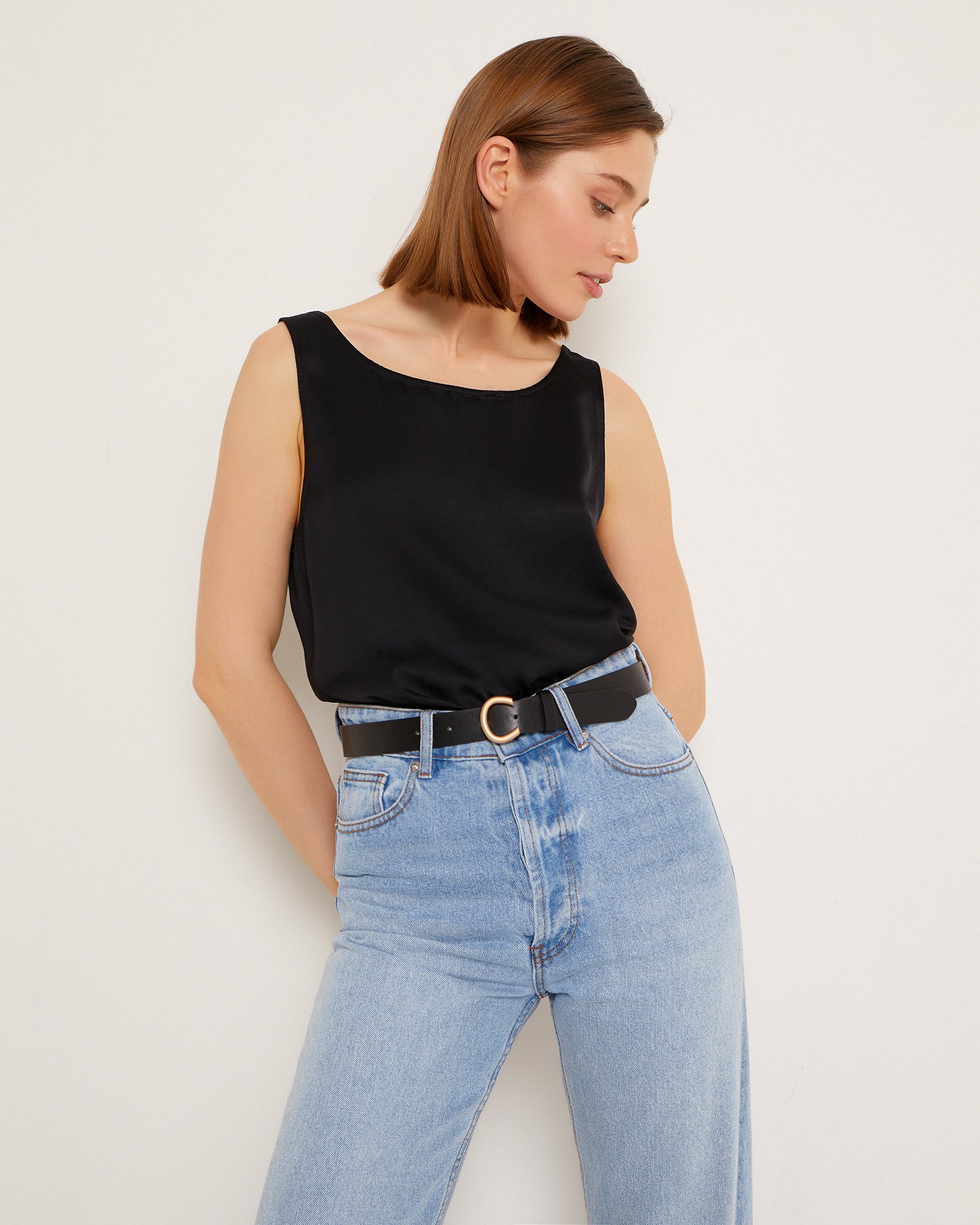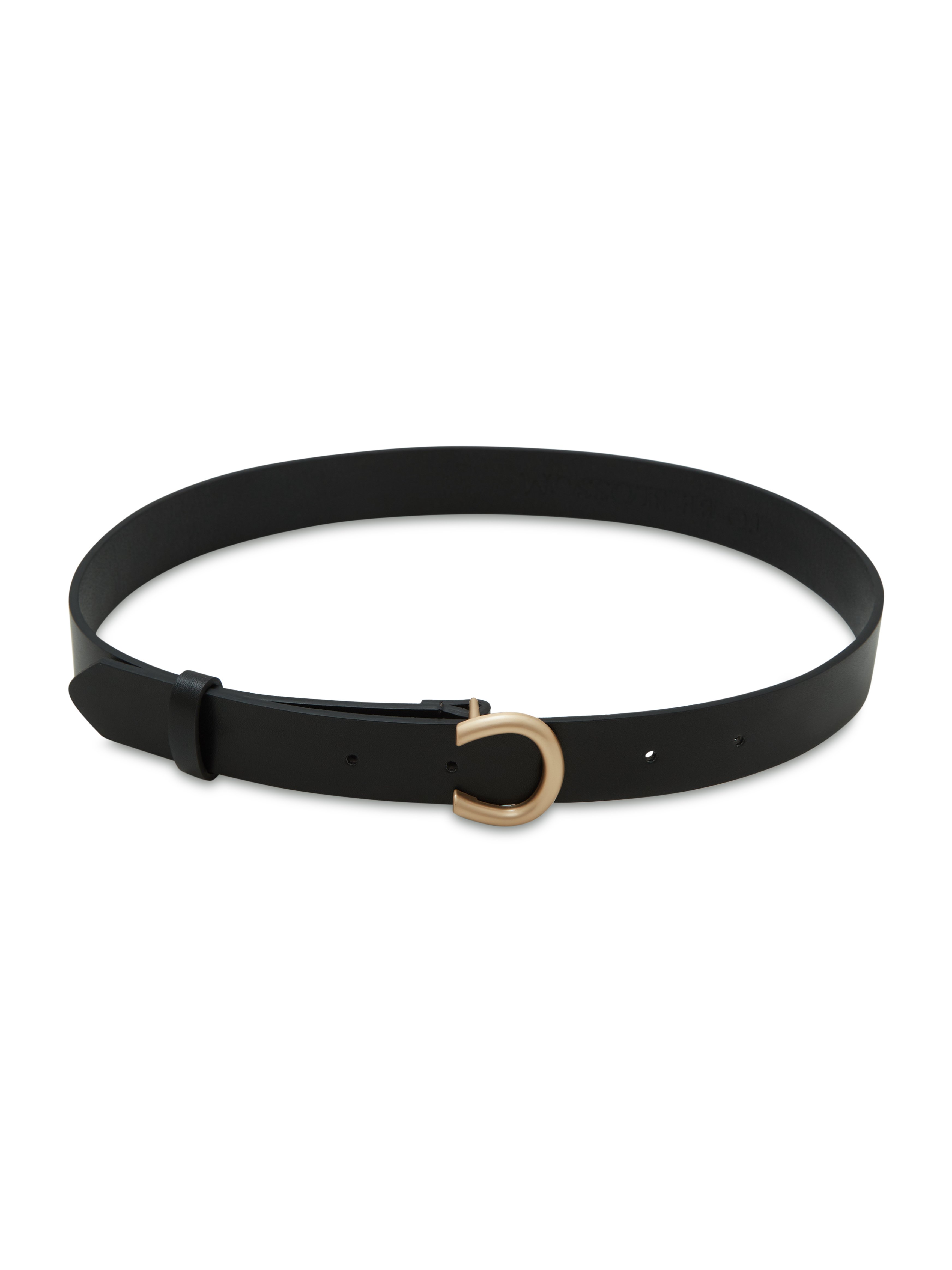 A black belt with a semi-circular metal buckle. This belt can be tied at the waist to define the silhouette when wearing oversized clothing. Composition: 100% polyurethane