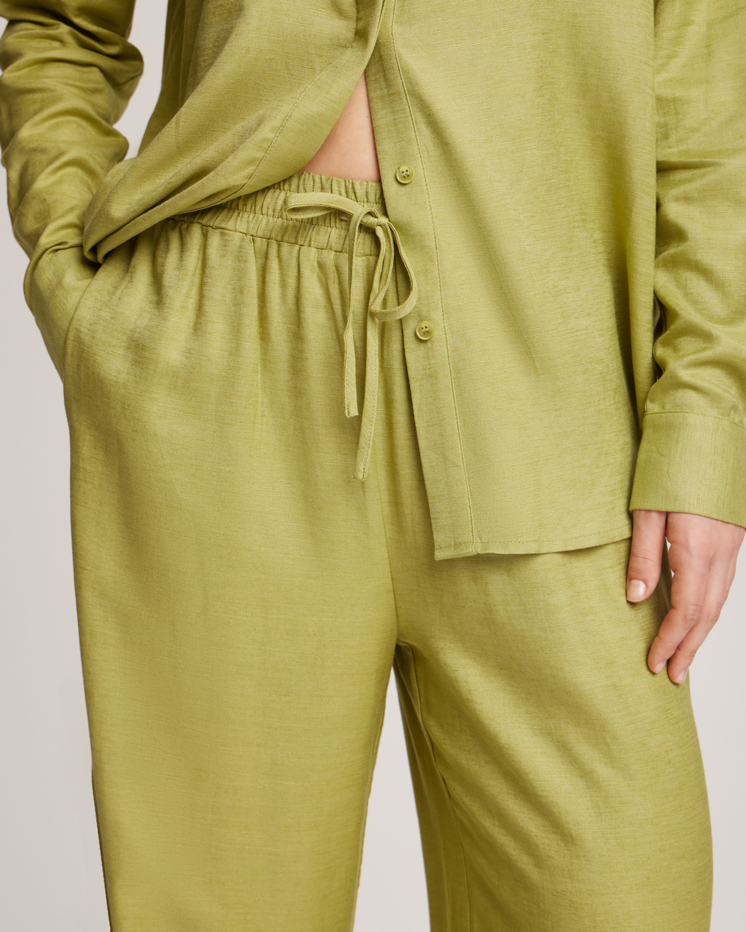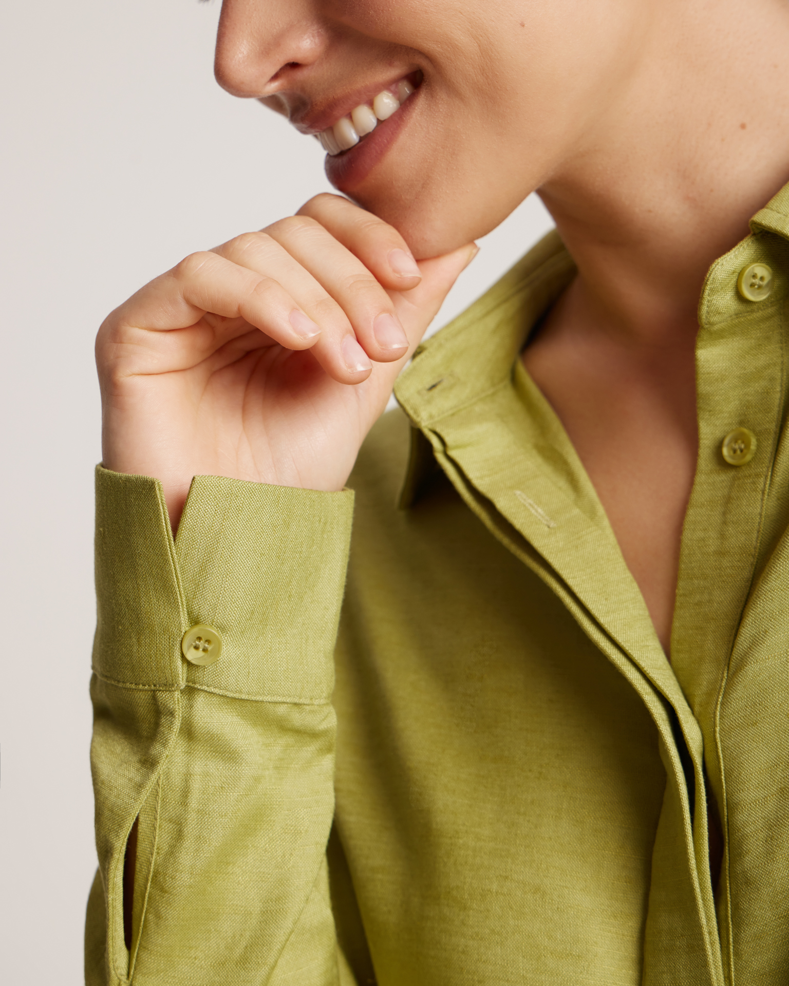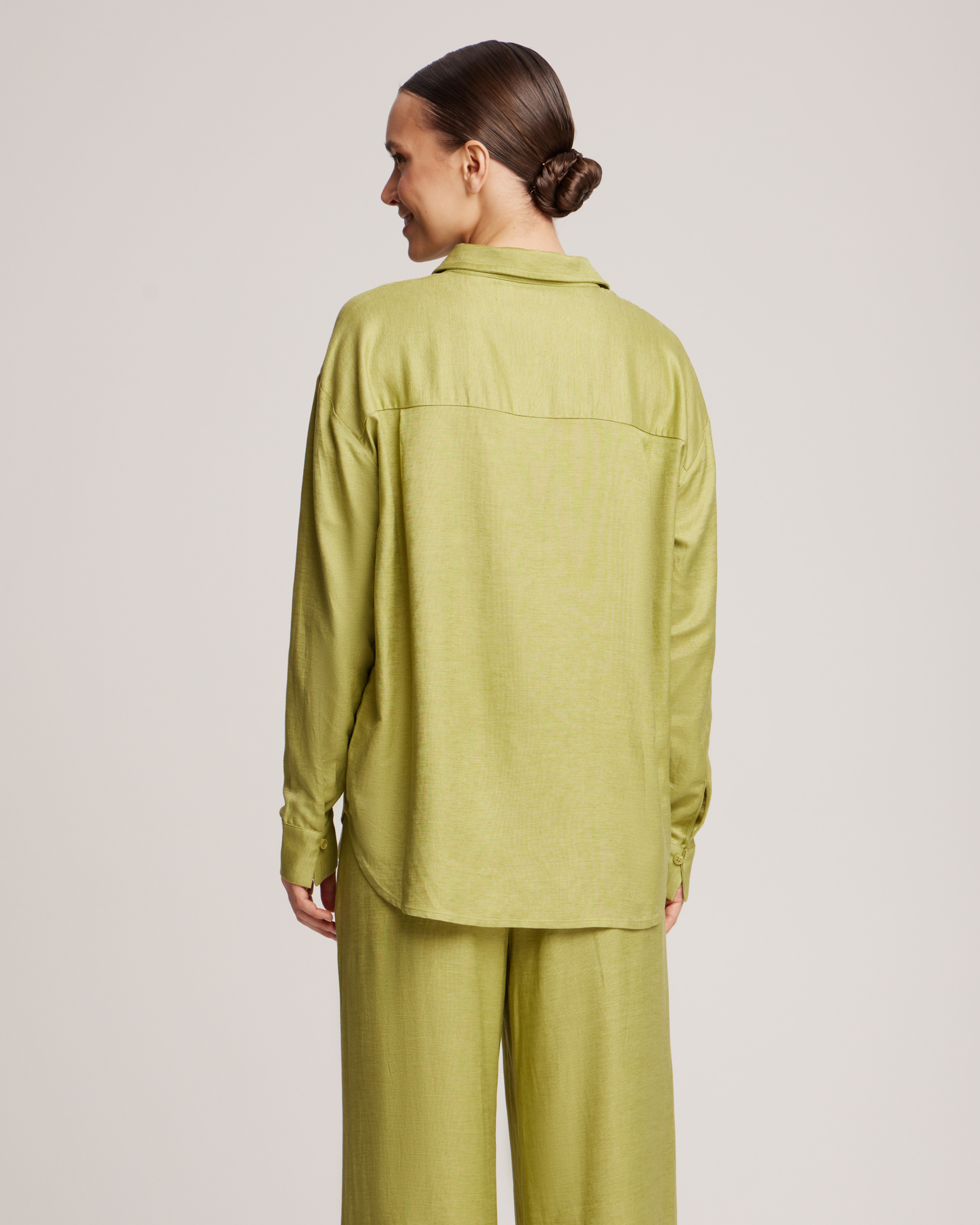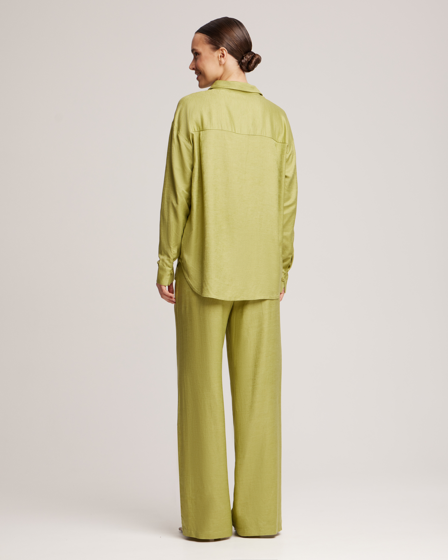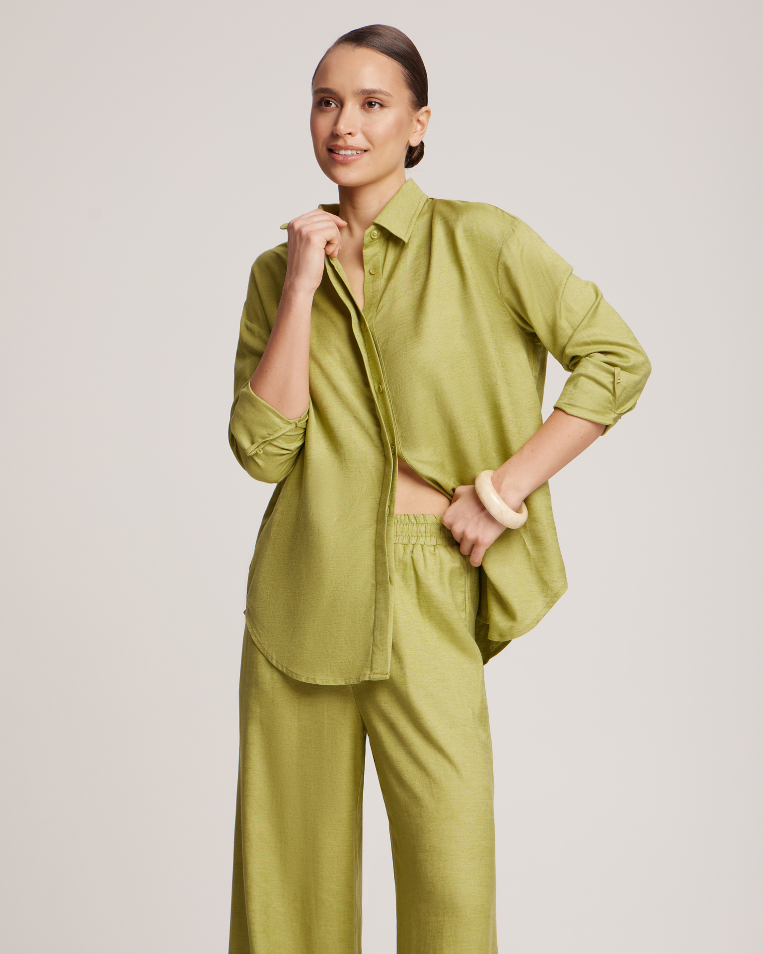 Льняной костюм — это изысканное сочетание практичности и элегантности. Комплект состоит из двух предметов: свободной рубашки на пуговицах и широких брюк-палаццо. Рубашка имеет регулируемые рукава с возможностью сворачивания, а также боковые разрезы, подчёркивающие непринуждённый характер модели. Брюки оснащены эластичным поясом, что обеспечивает комфортную посадку и адаптацию под разные типы фигур.