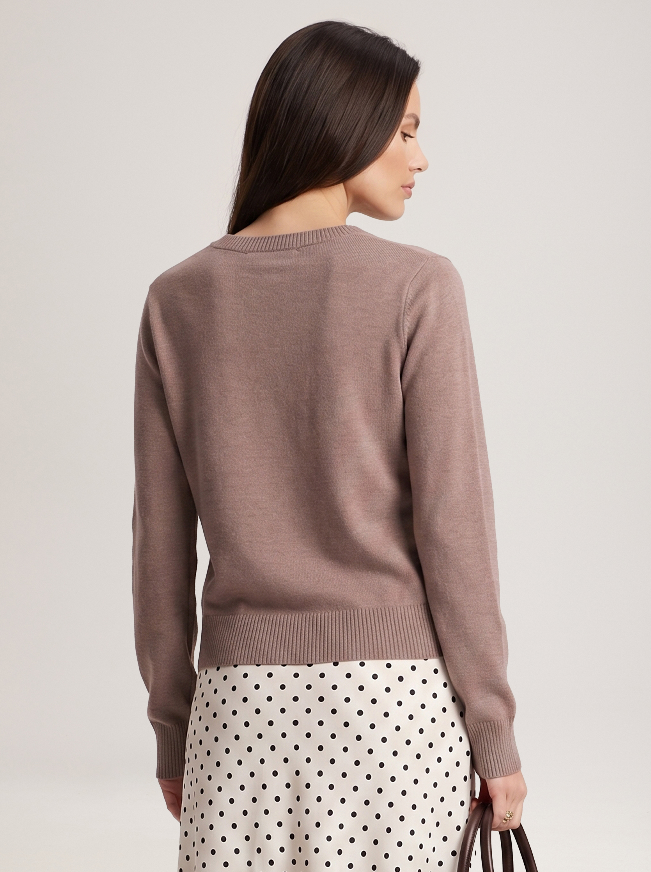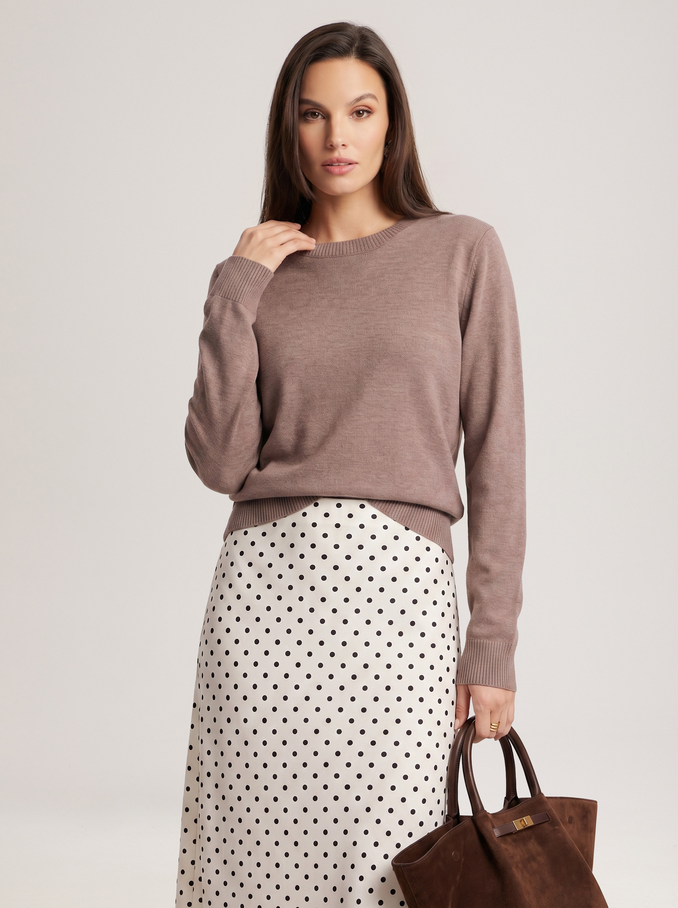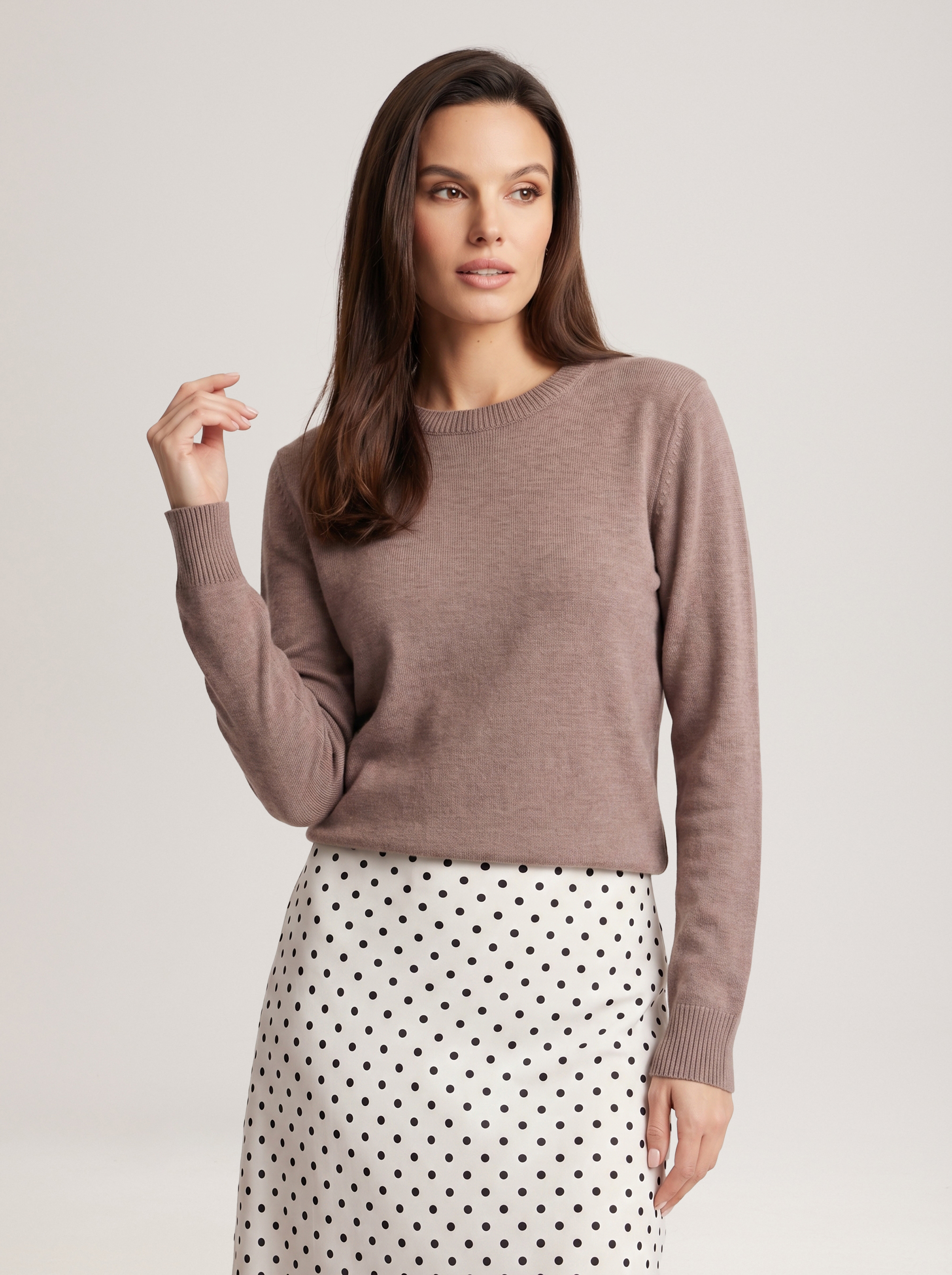 A basic jumper in a coffee colour that is easy to style with any pieces already in your wardrobe, from feminine skirts to relaxed jeans. Model's measurements: height 177, bust 84, waist 61, hips 92 Model wears size: S