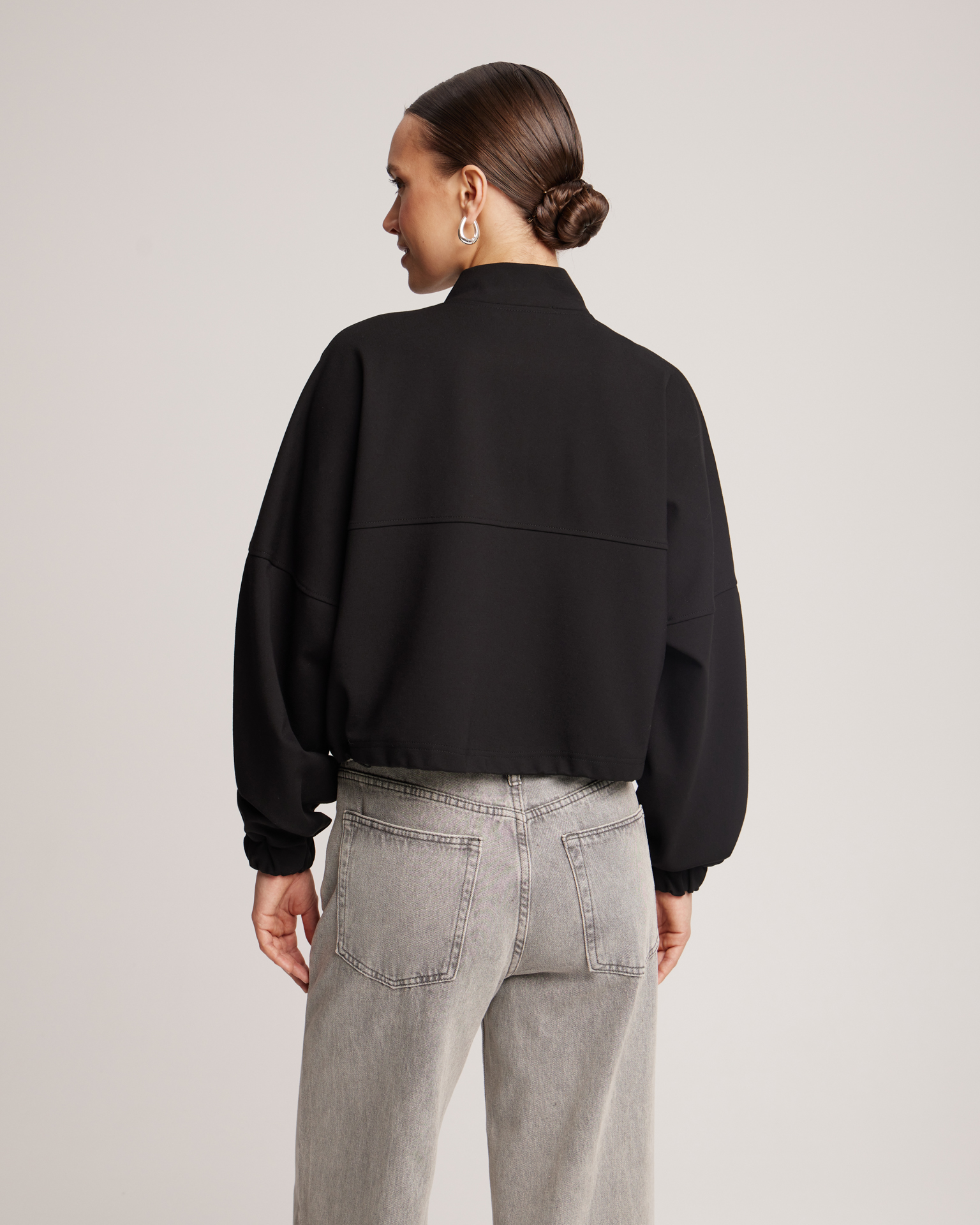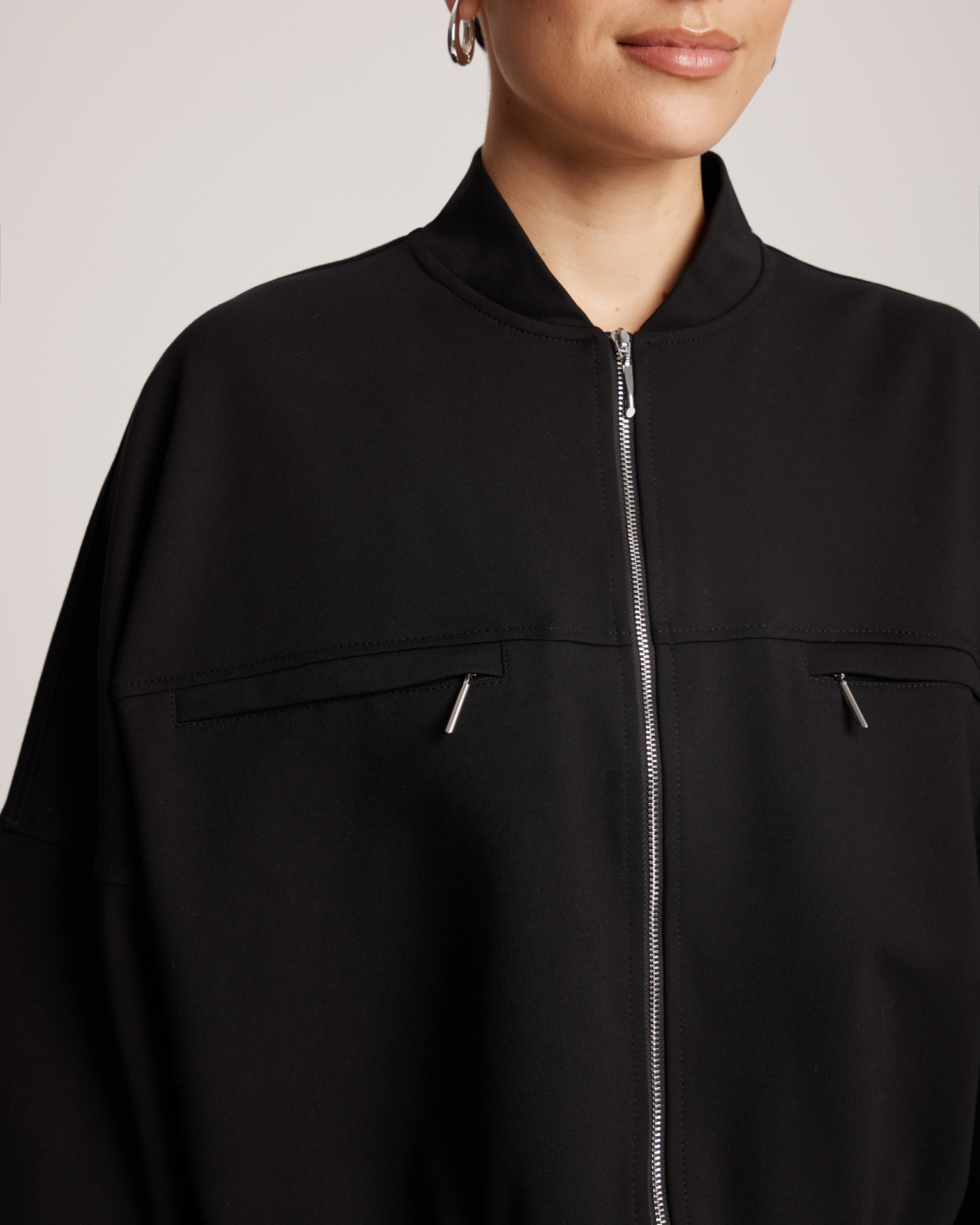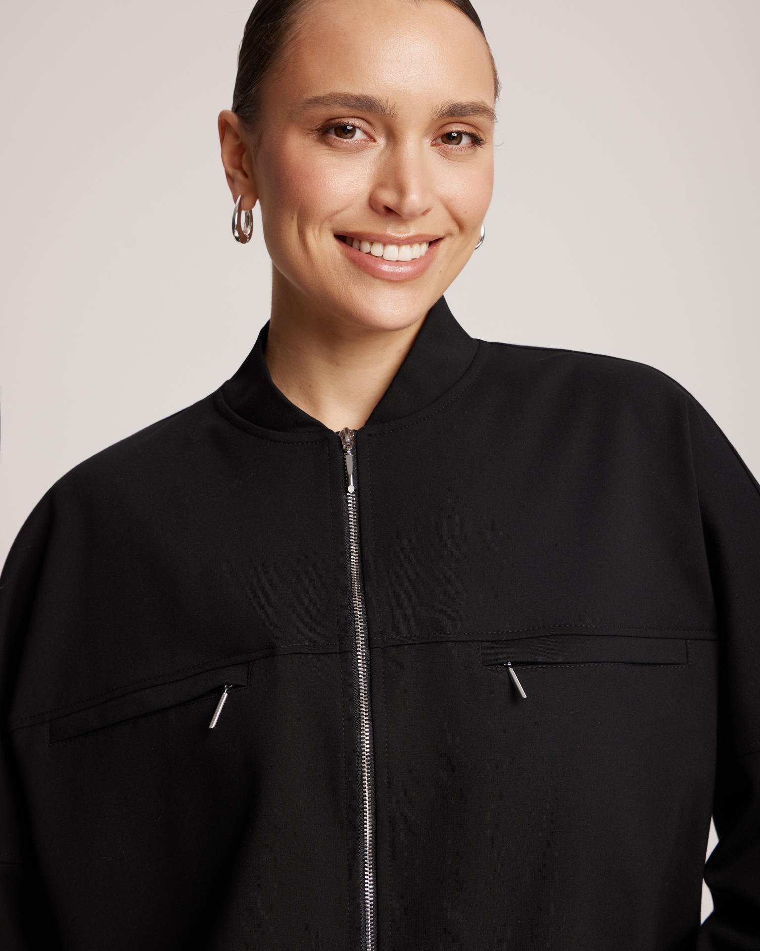 Our take on the bomber jacket features a zip fastening and an adjustable ribbed hem, allowing you to adapt the silhouette to your preference. There are zip pockets on the chest for convenience and security. The bomber's versatile style easily combines with various wardrobe elements. To complete the look, we recommend pairing it with trousers from the same collection. Model's measurements: height 175 cm, bust 86 cm, waist 60 cm, hips 90 cm. Model wears size: S.