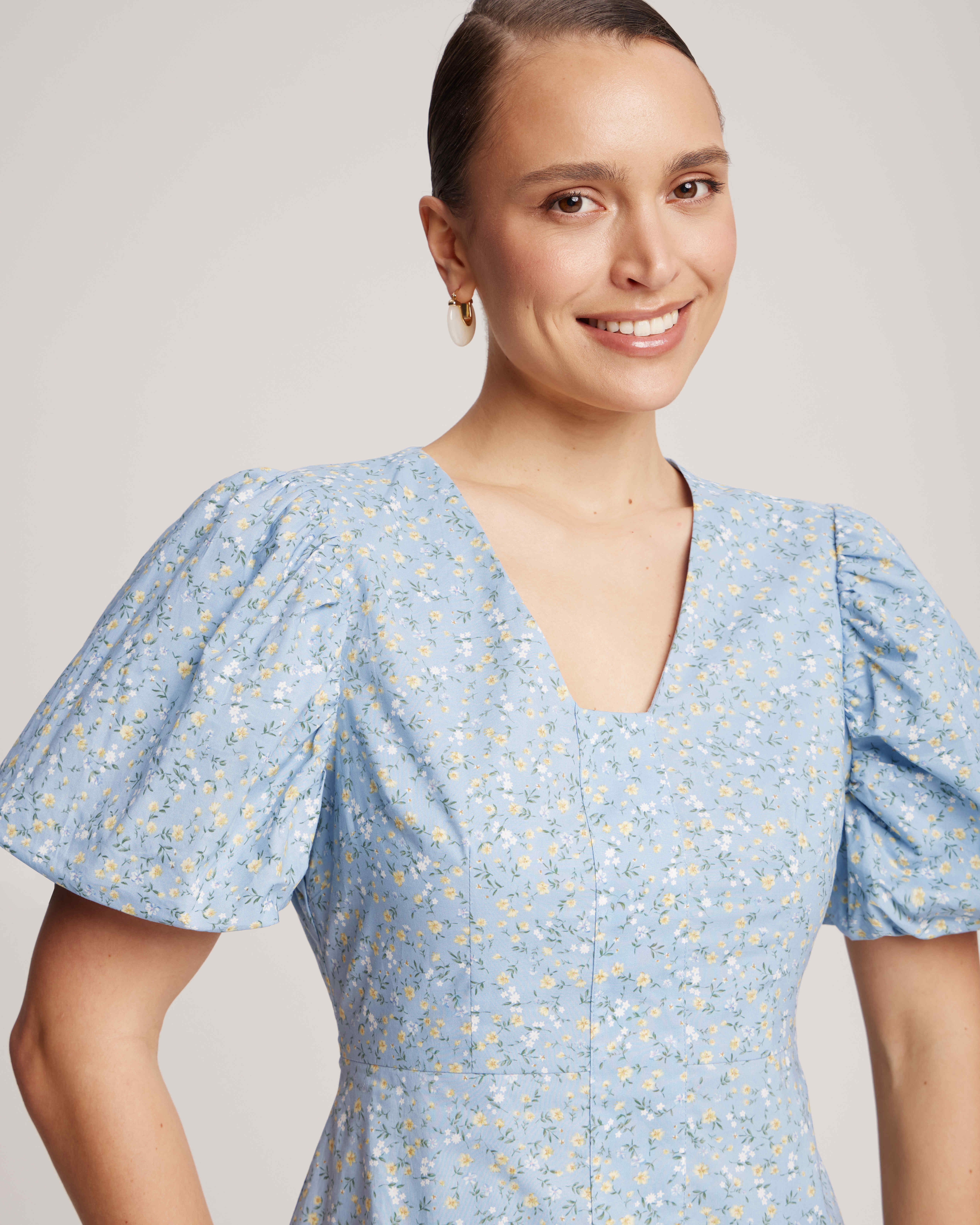 A delicate light blue mini dress with a floral print is crafted from lightweight cotton fabric and complemented by a comfortable viscose lining. Details include a tailored cut, voluminous sleeves, and an A-line skirt. Choose delicate sandals to create a light, romantic look or cowboy boots for a country-style outfit. Model's measurements: height 175 cm, bust 82 cm, waist 62 cm, hips 93 cm. Model wears size: S.