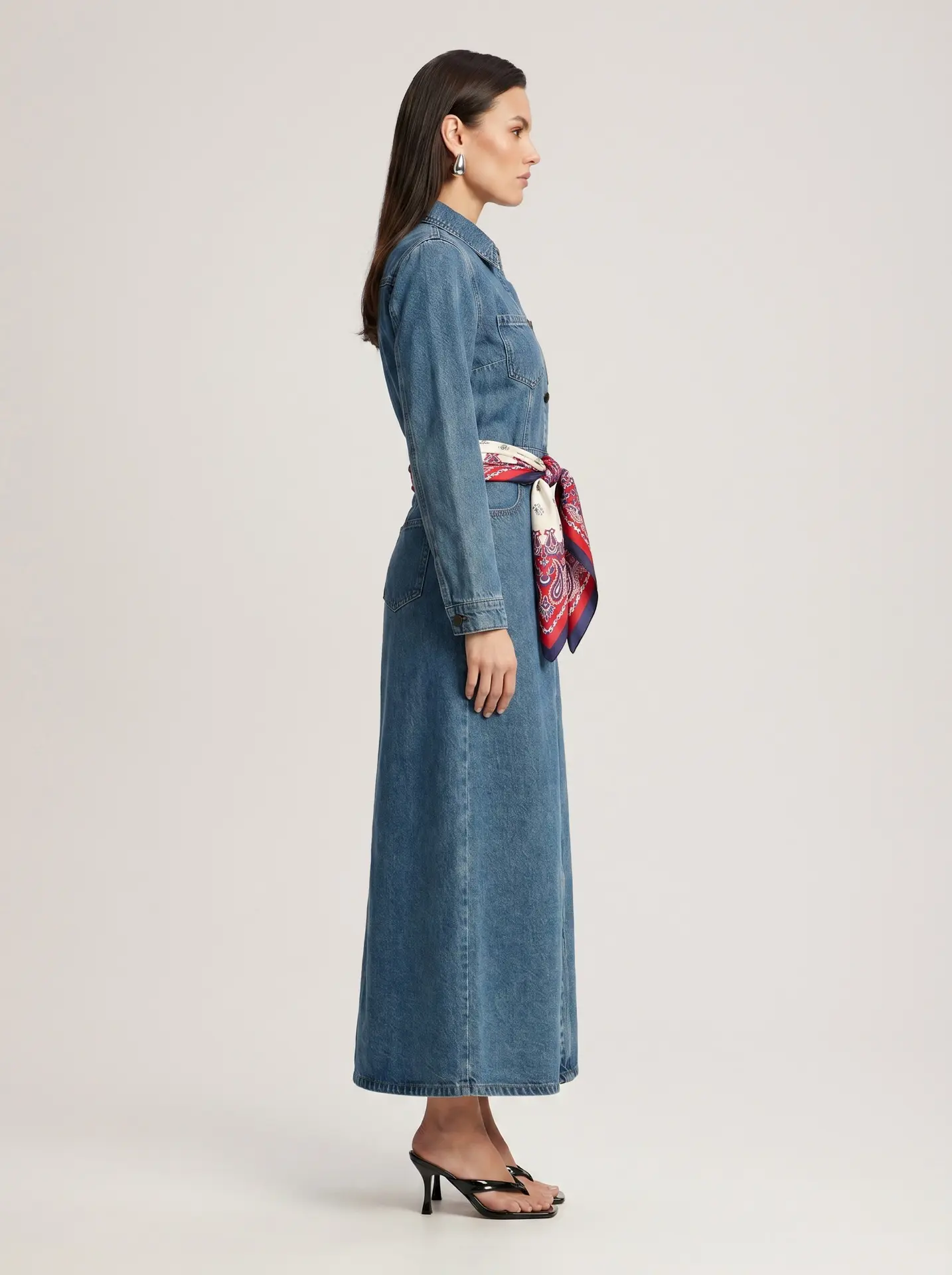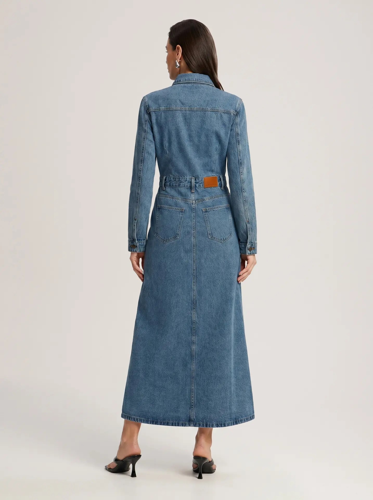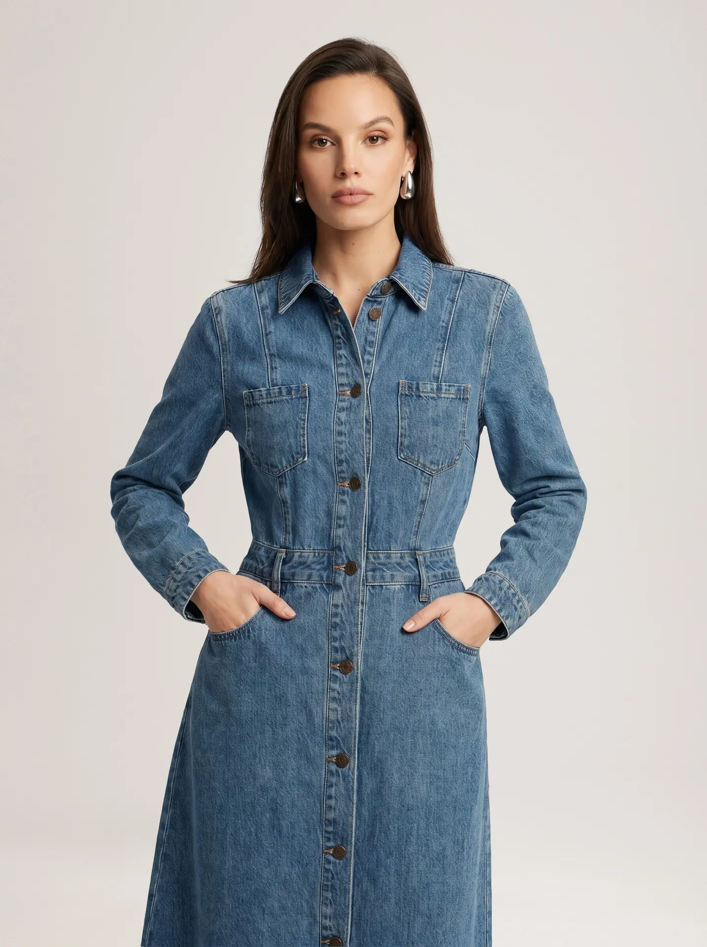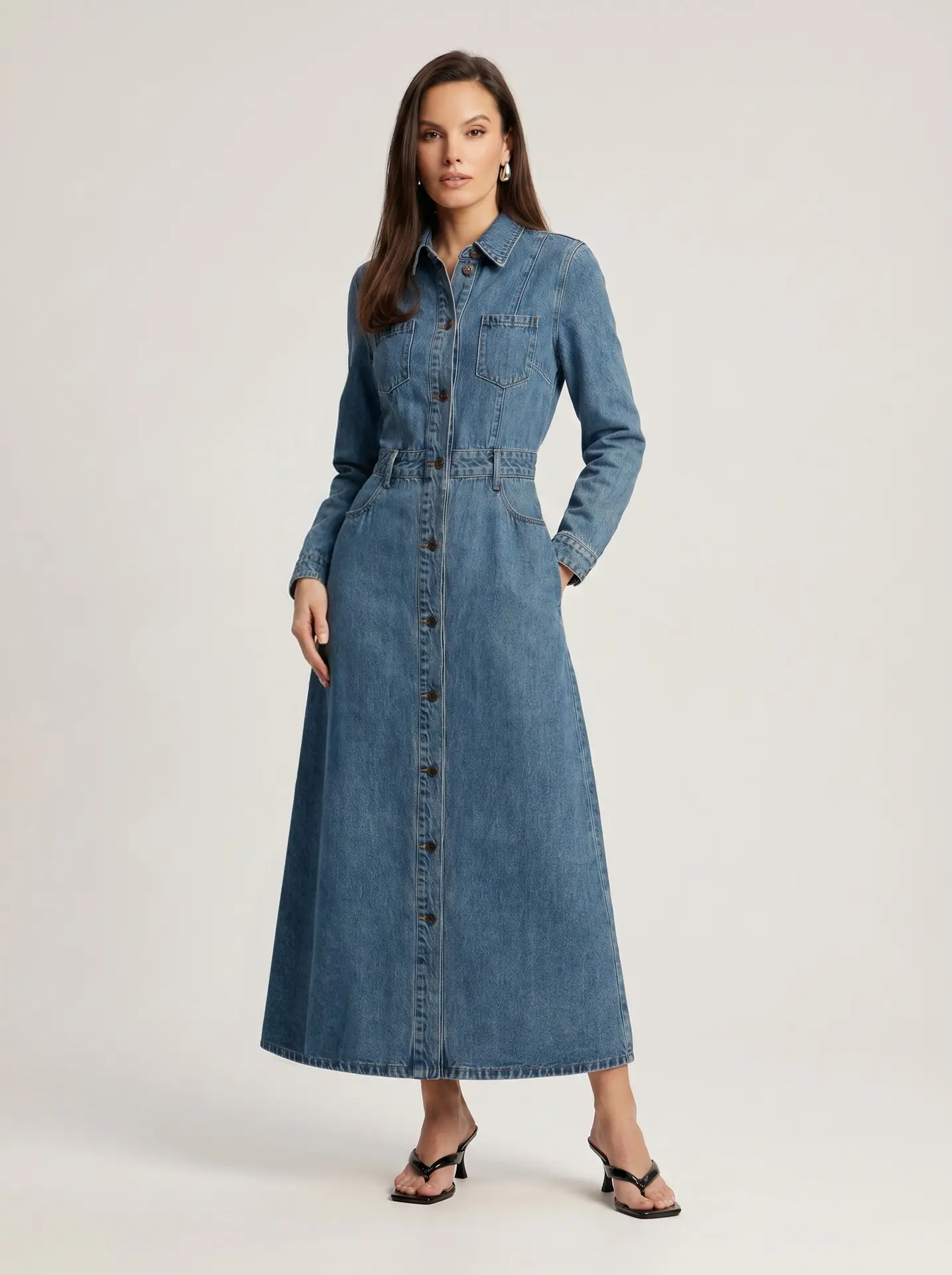 Элегантное джинсовое платье макси — воплощение стиля и комфорта в одном образе. Выполненное из качественного денима классического синего оттенка, оно станет незаменимой частью вашего гардероба.